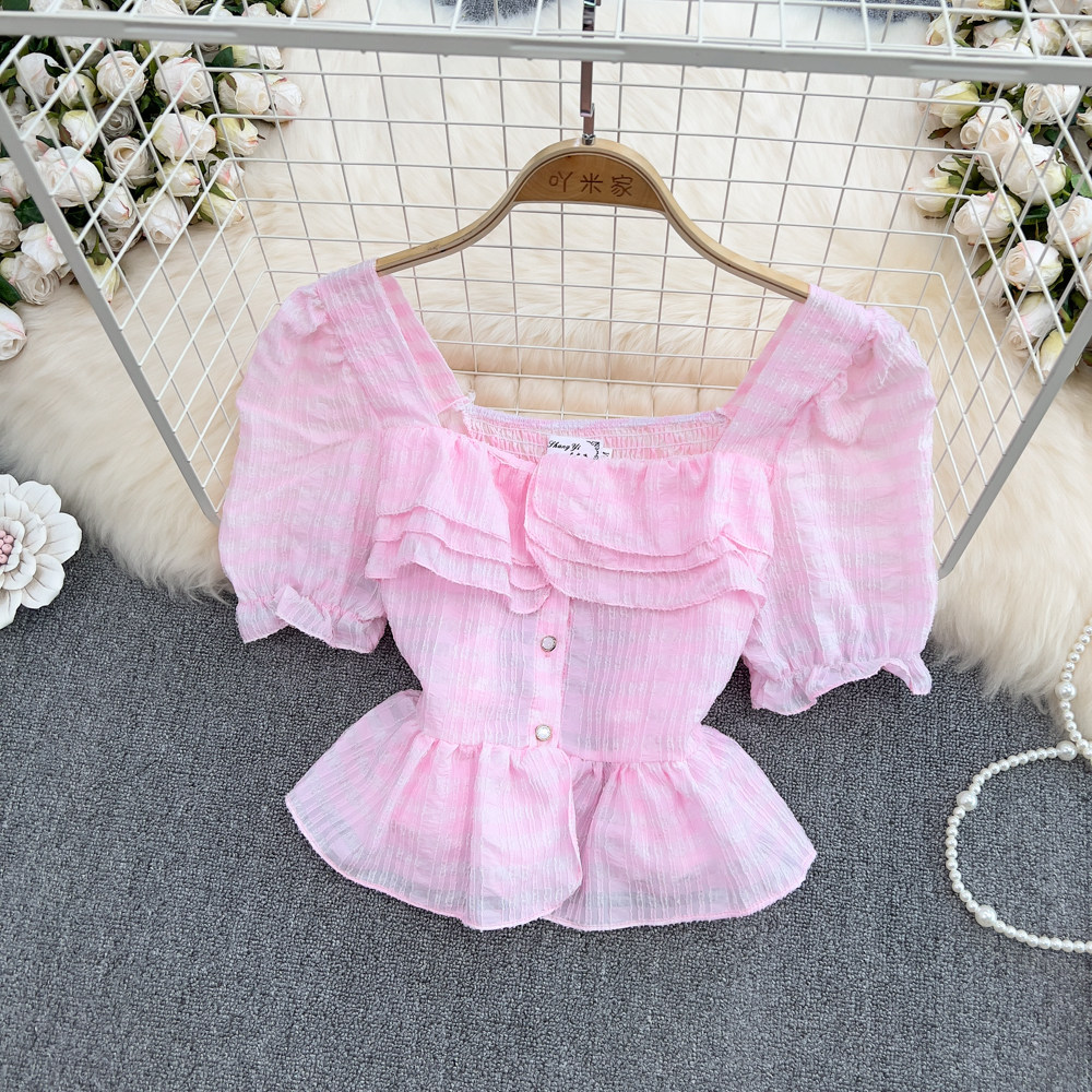 Летняя короткая рубашка, французский стиль, короткий рукав, квадратный вырез, в корейском стиле, в западном стиле