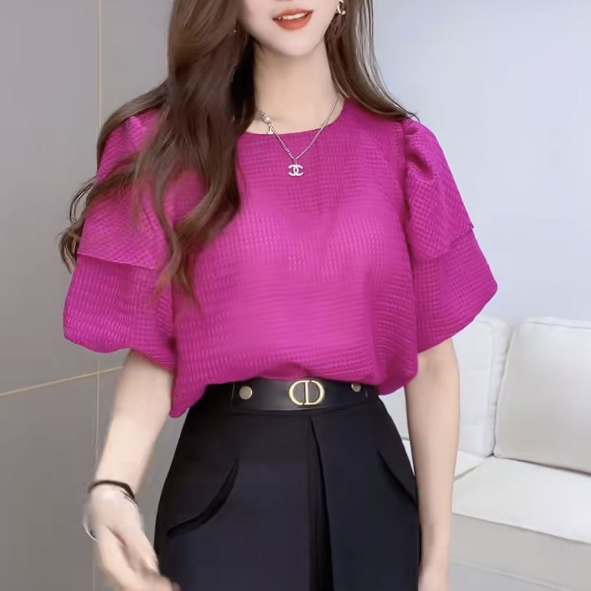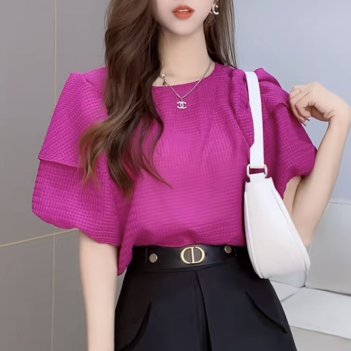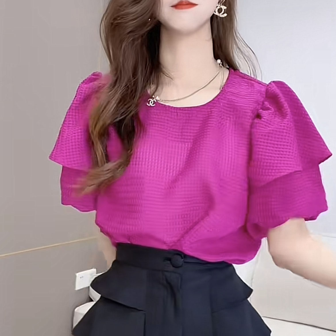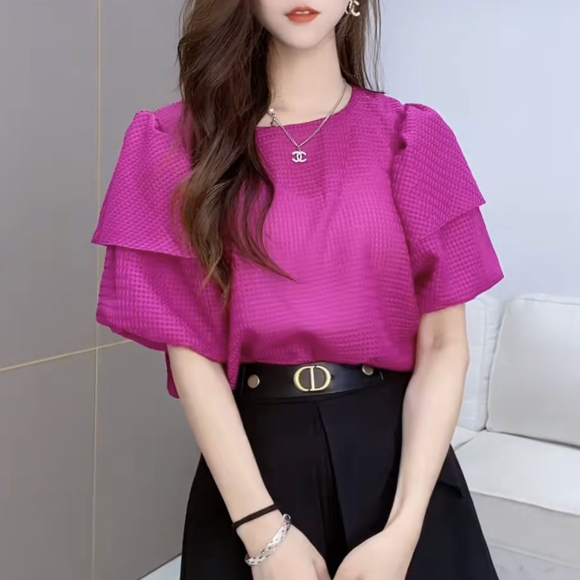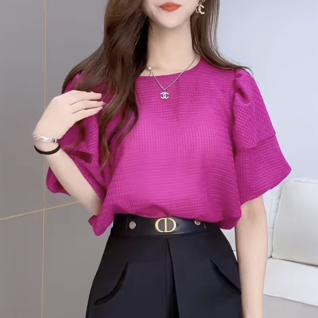 Небольшая дизайнерская летняя рубашка, футболка с коротким рукавом, тренд сезона, рукава фонарики, французский стиль, свободный крой
