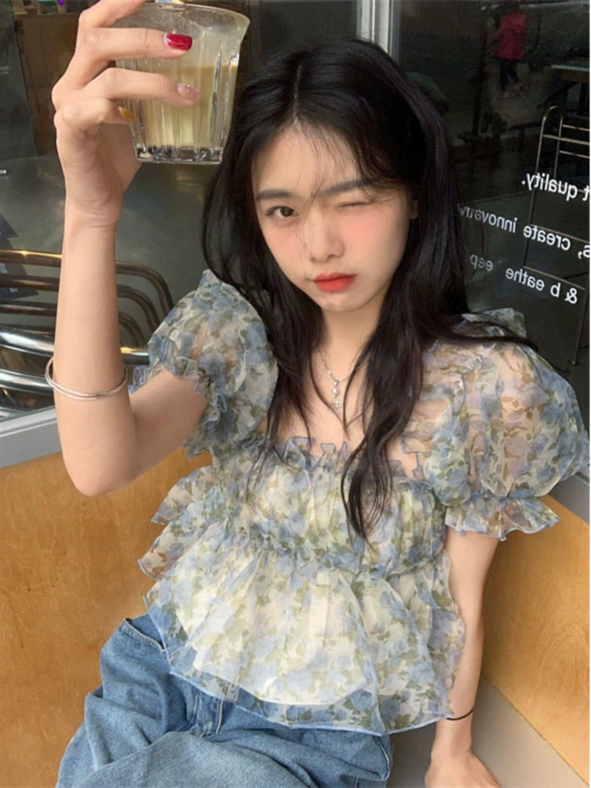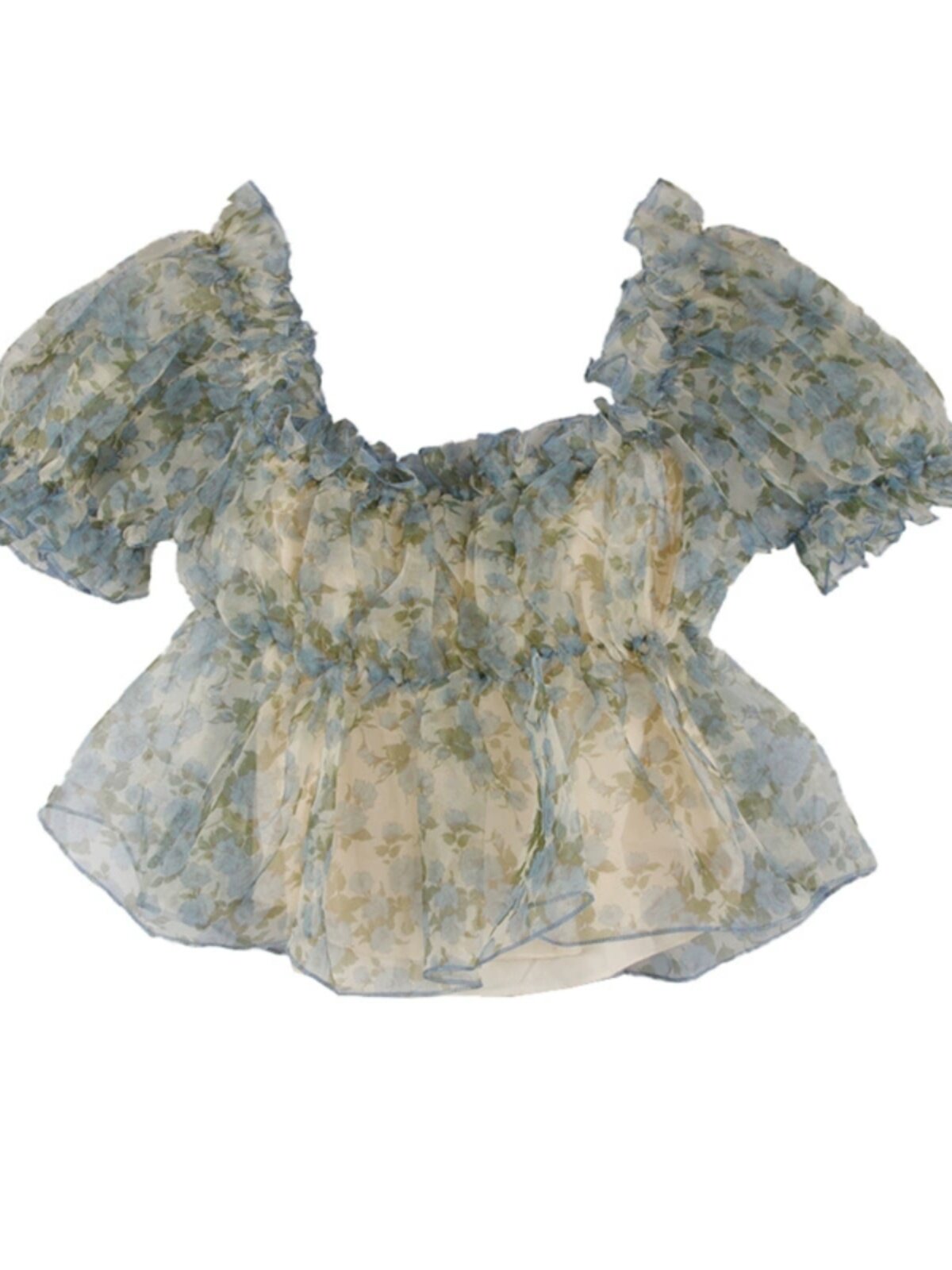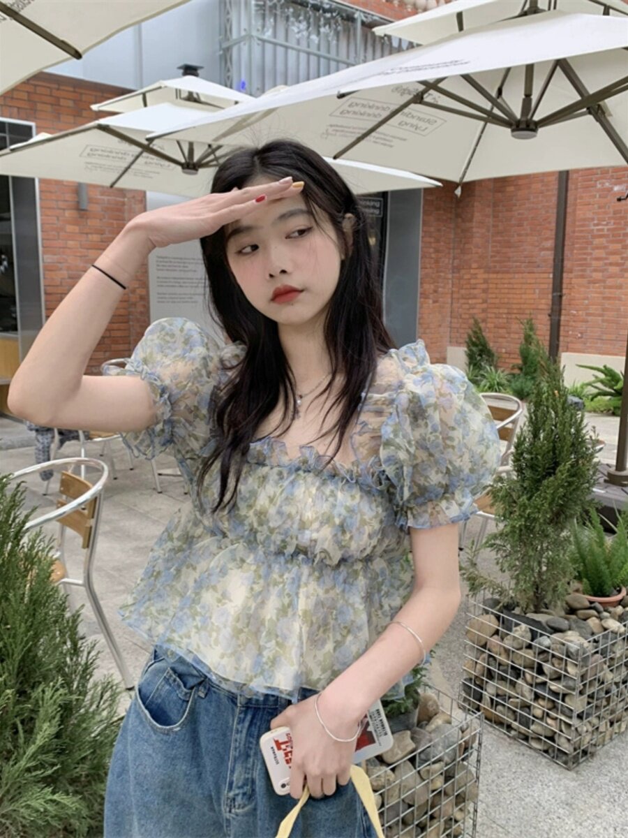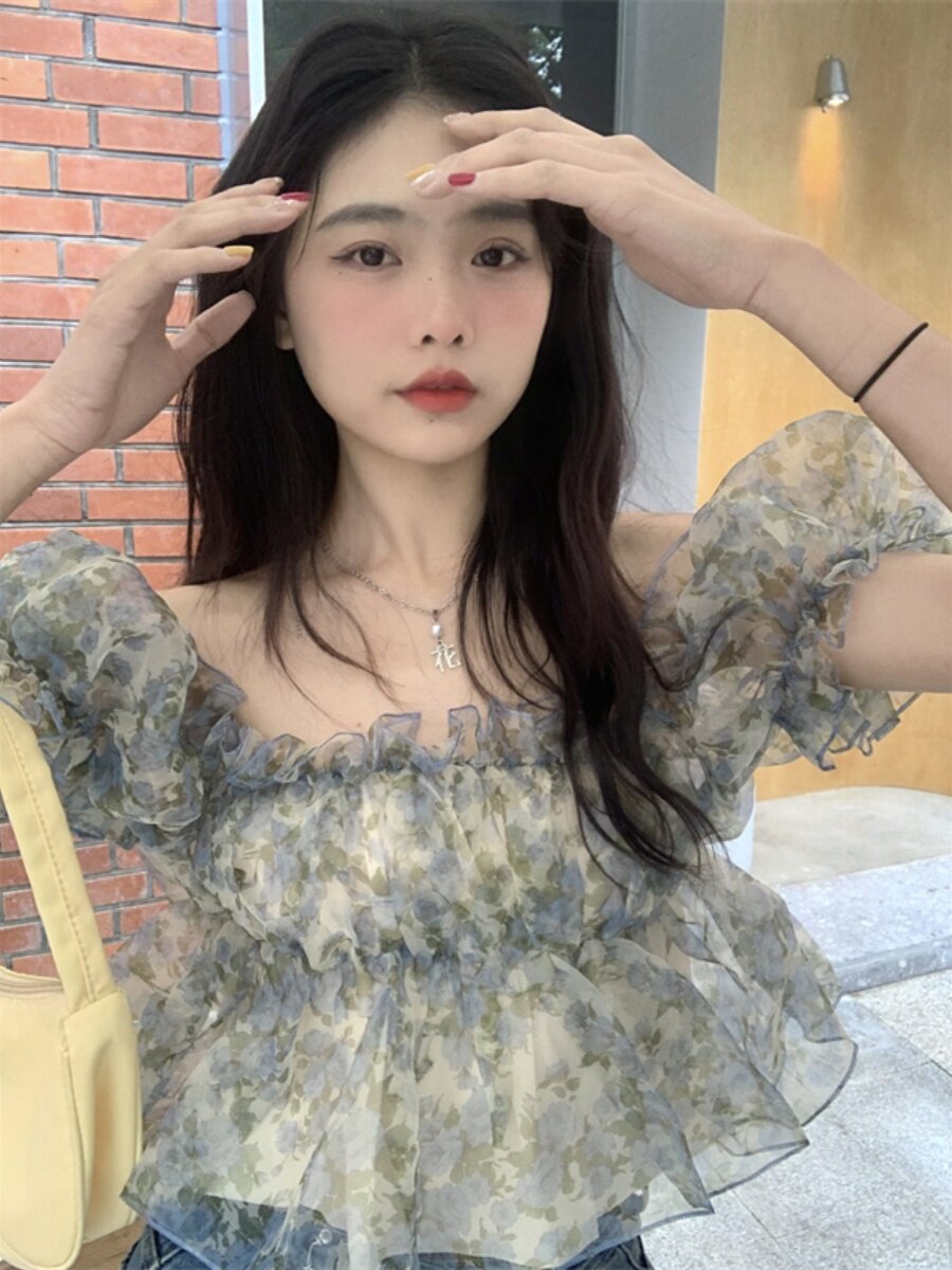Короткая летняя дизайнерская шифоновая рубашка, открытые плечи, рукава фонарики, цветочный принт, французский стиль, короткий рукав