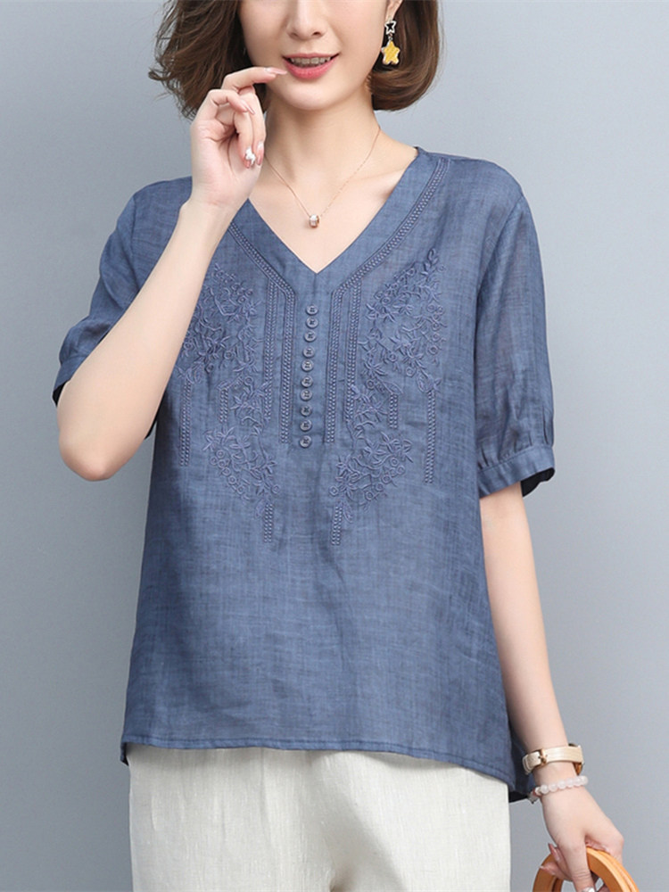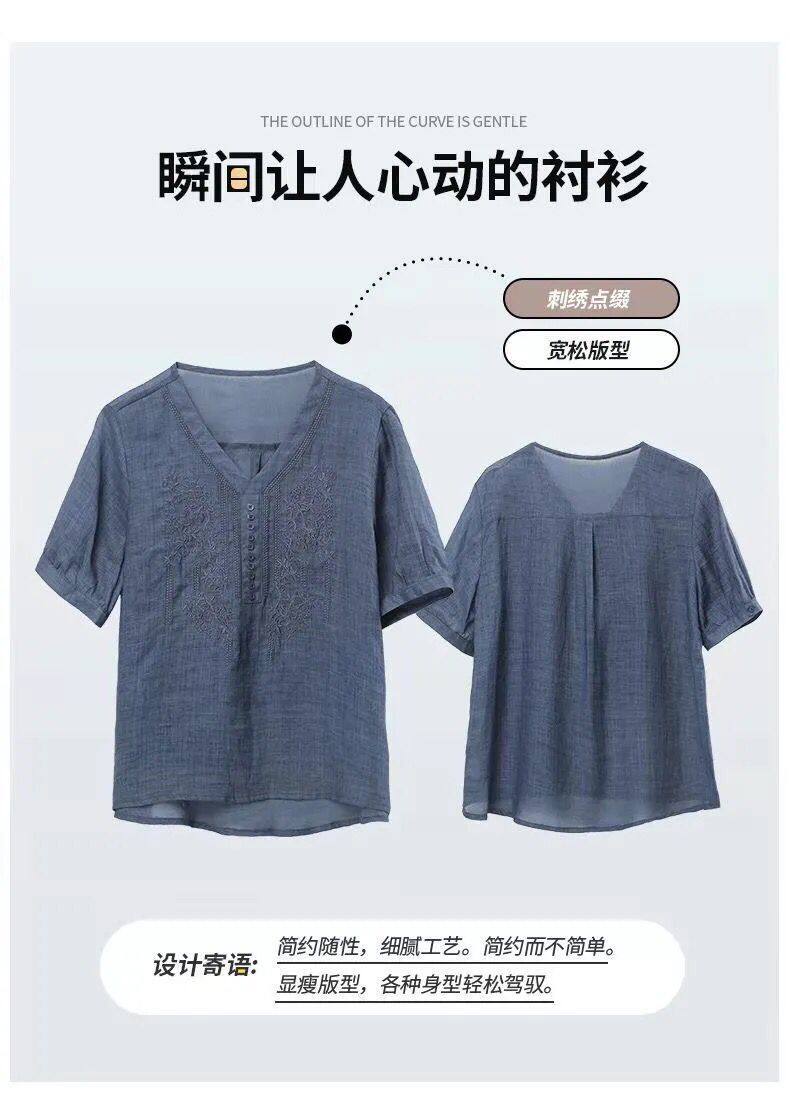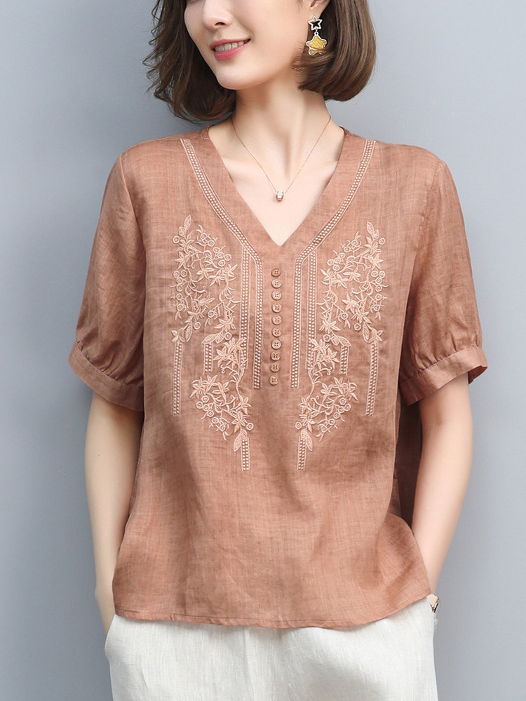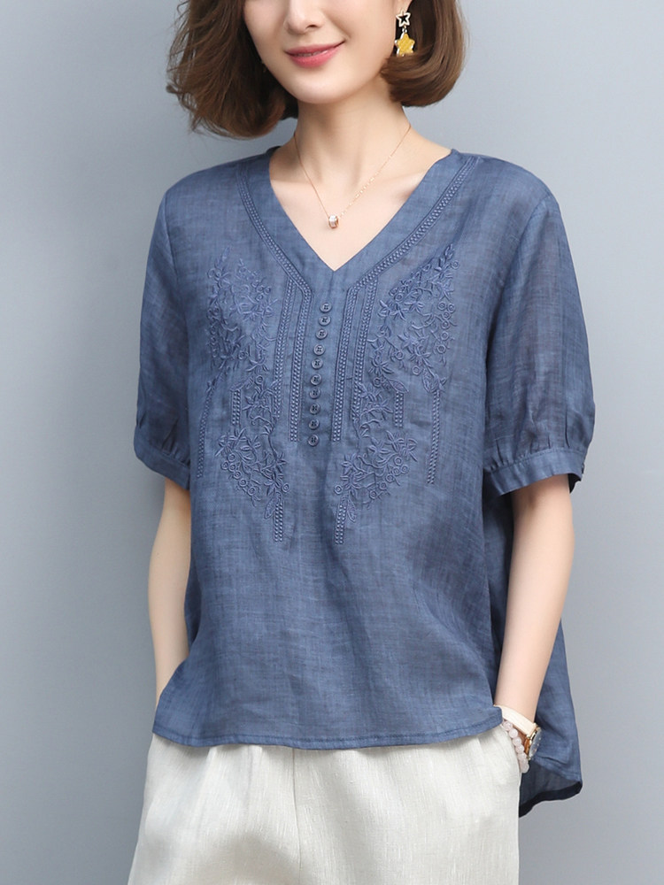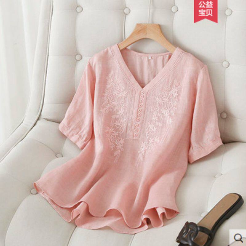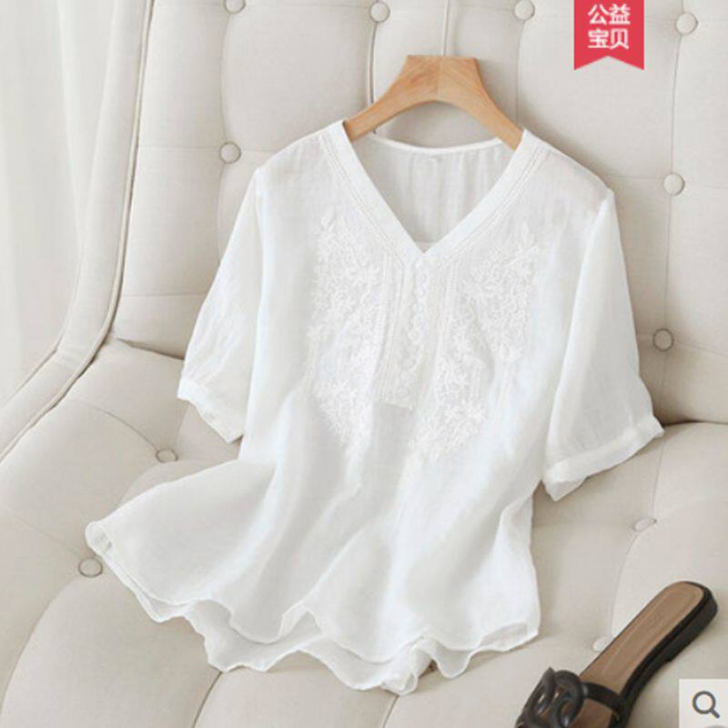 (Трансграничная торговля), японская летняя рубашка, футболка, короткий рукав, с вышивкой, из хлопка и льна