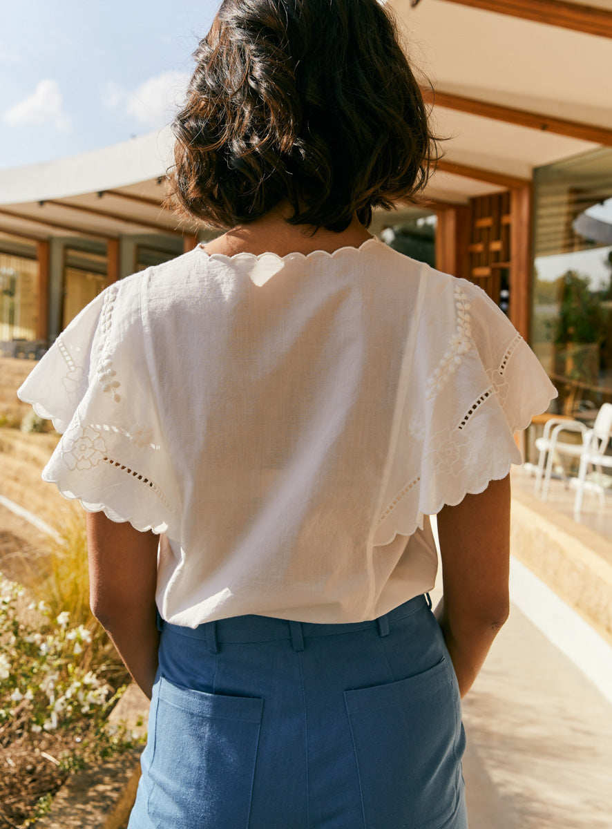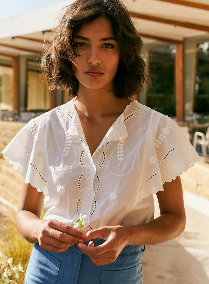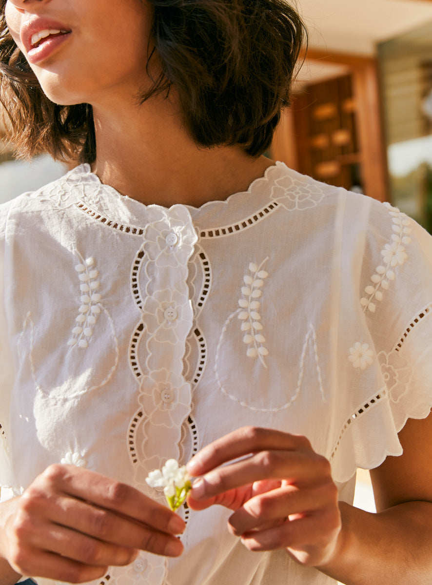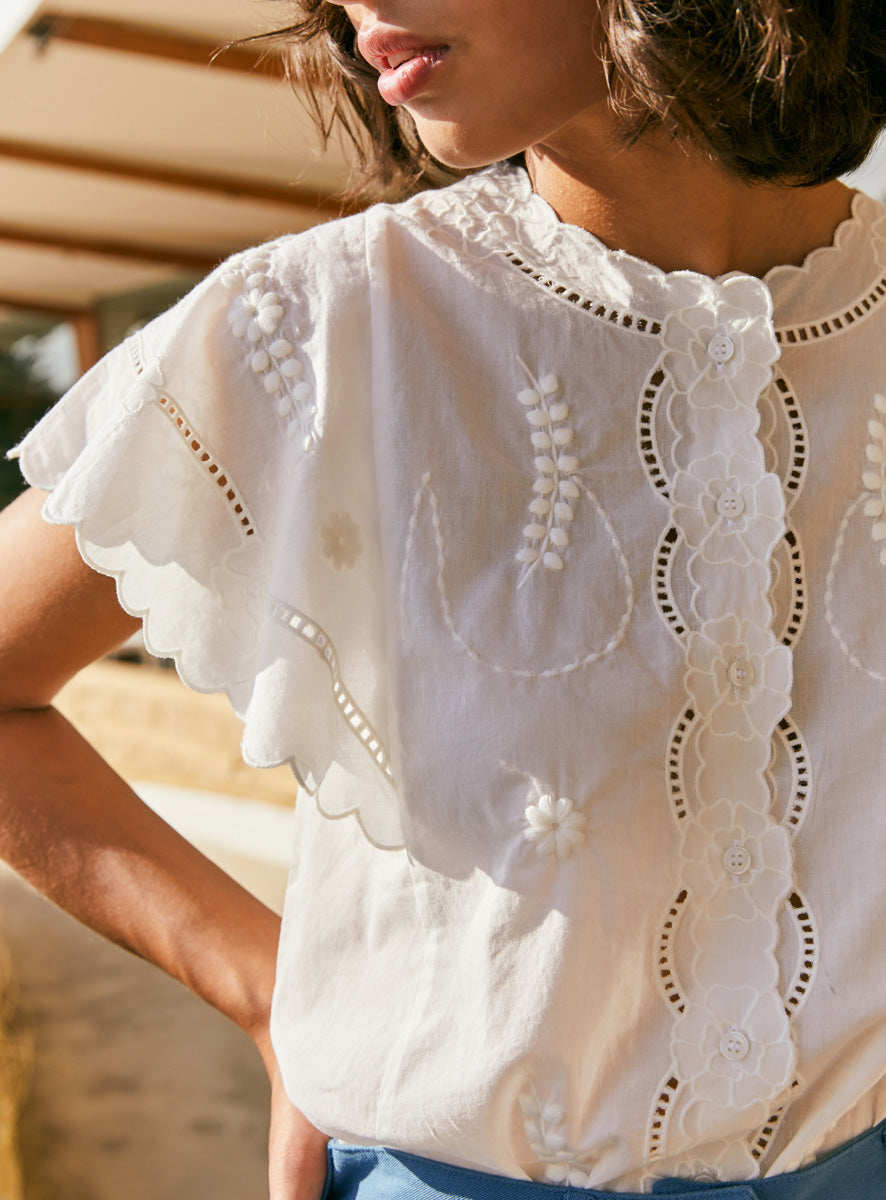 Кружевная белая рубашка, футболка, французский стиль, короткий рукав, с вышивкой