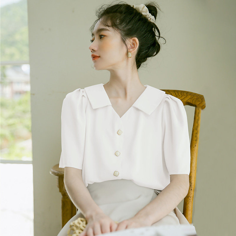 Летняя тонкая шифоновая ретро рубашка, короткий рукав, коллекция 2022, оверсайз, рукава фонарики, V-образный вырез