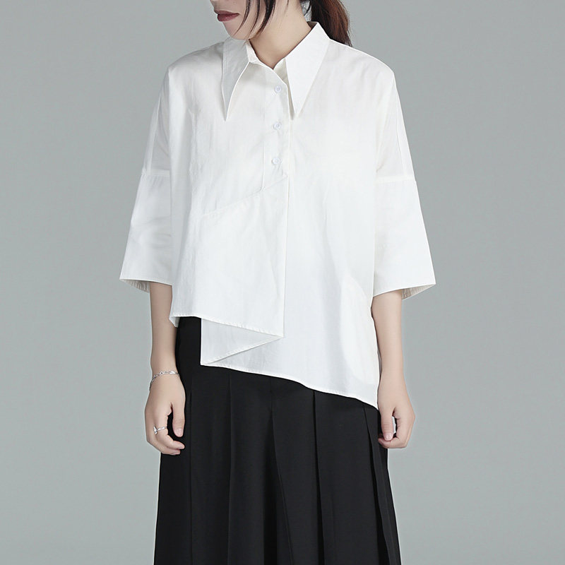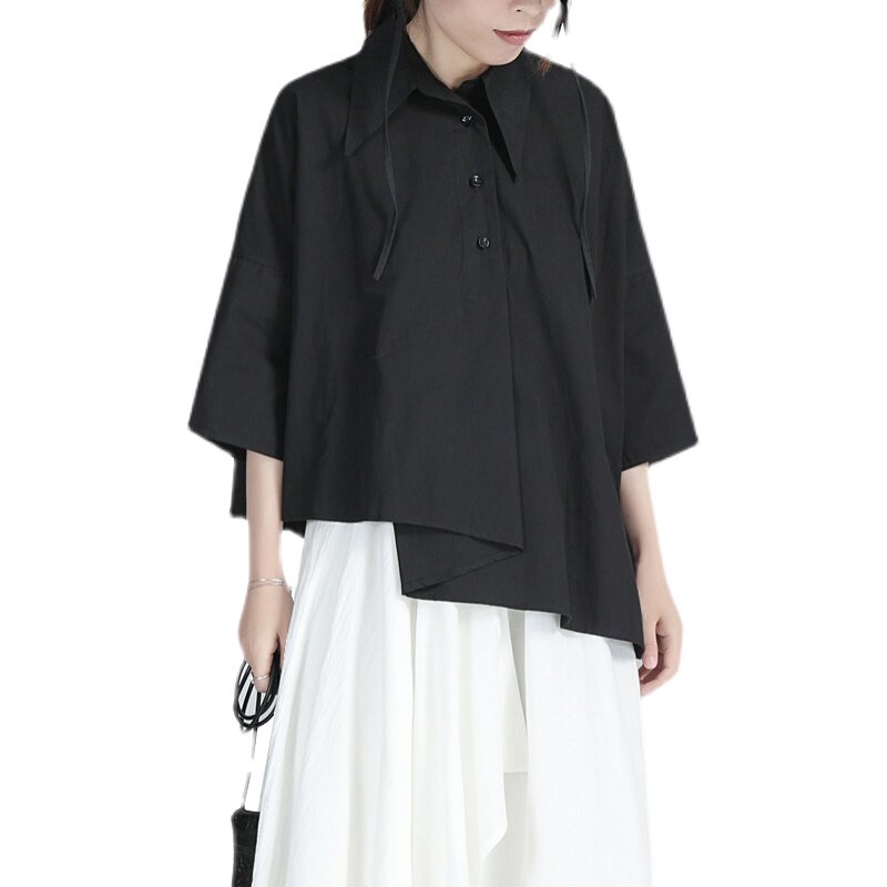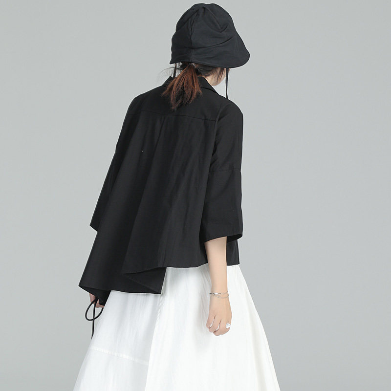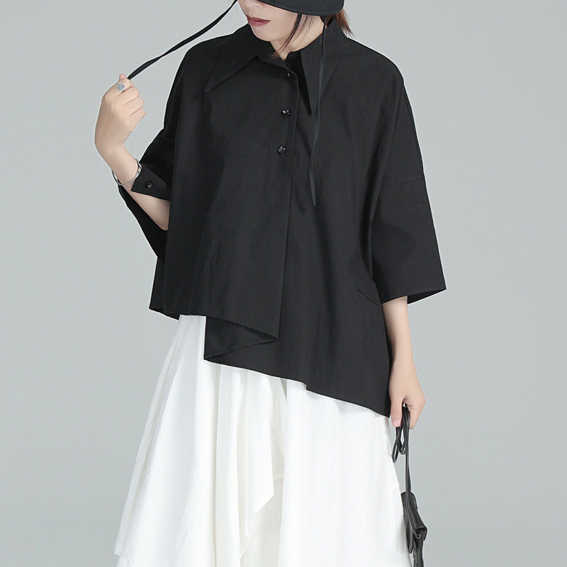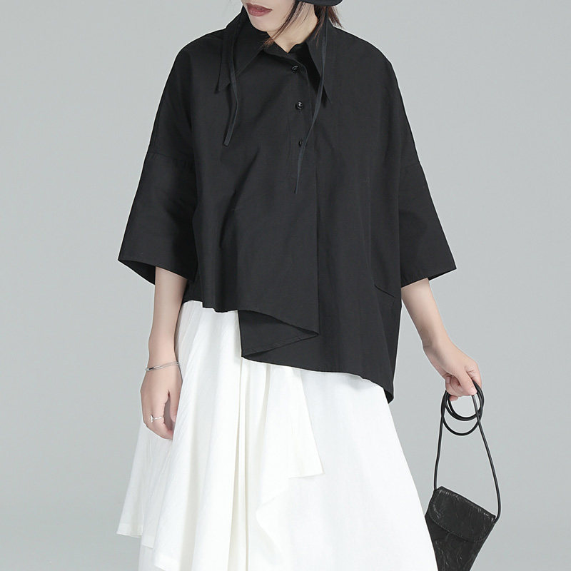 Дизайнерская черная рубашка, тренд сезона, короткий рукав, свободный крой