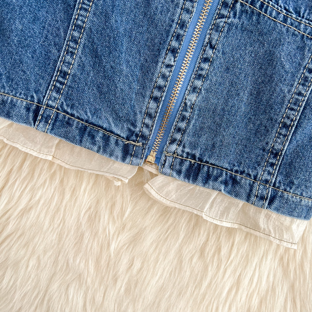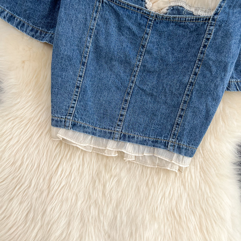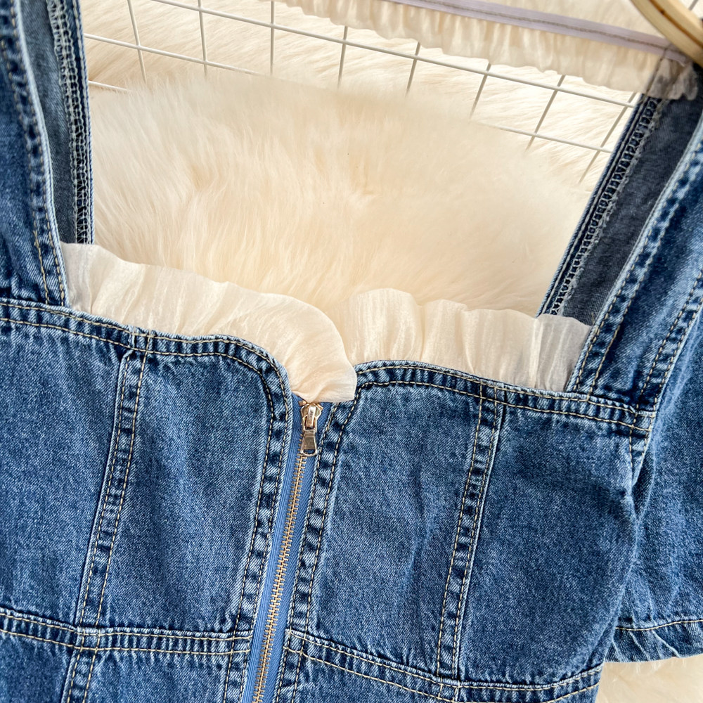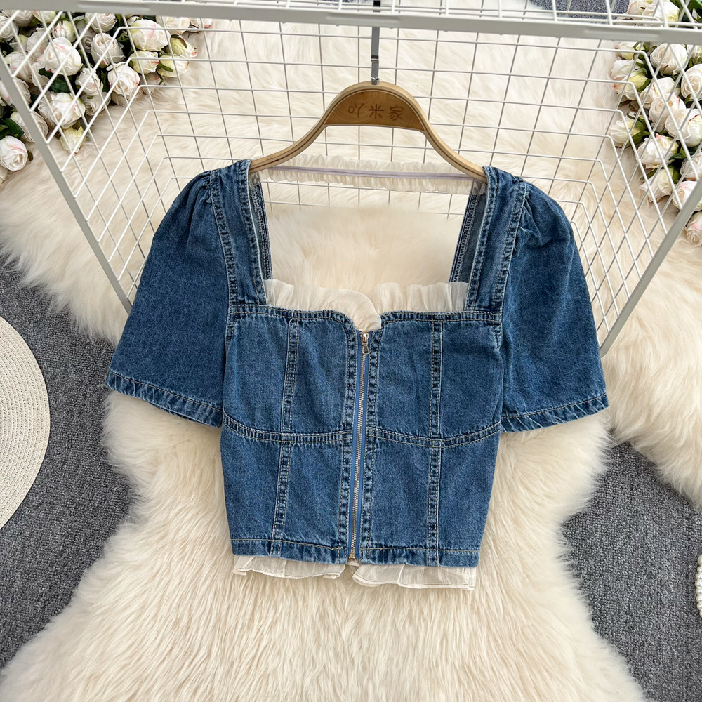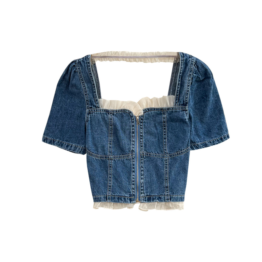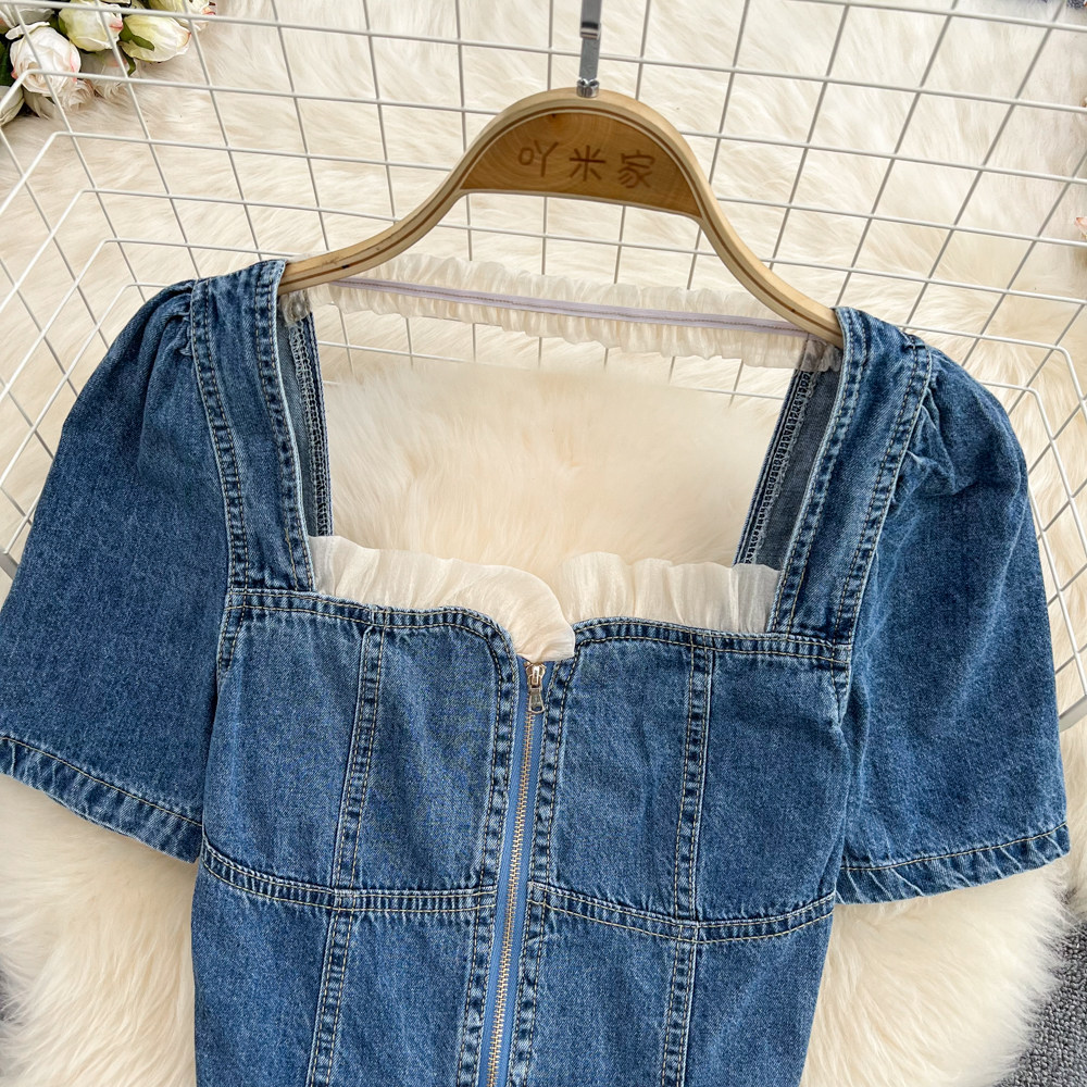 Летняя ретро рубашка с молнией, короткая джинсовая юбка, коллекция 2022, квадратный вырез, рукава фонарики