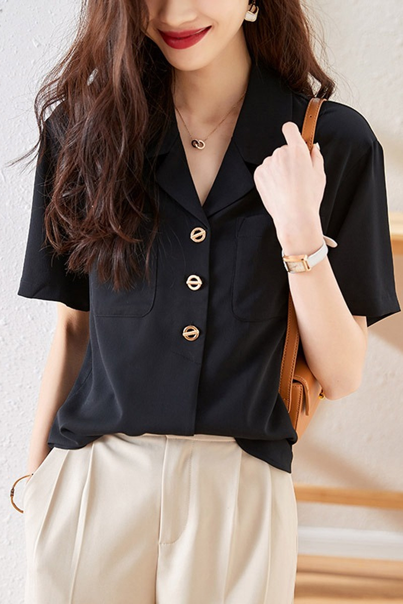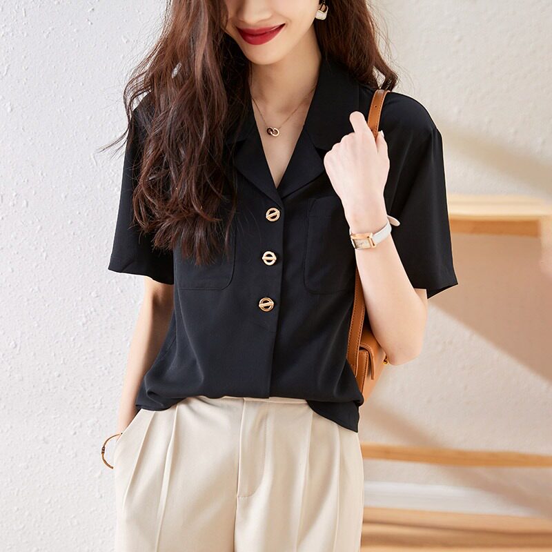 Ретро костюм, летняя небольшая дизайнерская черная рубашка, короткий рукав, тренд сезона