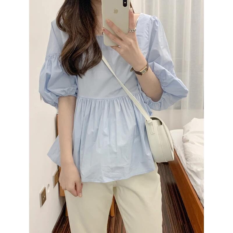 Синяя летняя кукла, дизайнерская рубашка, квадратный вырез, рукава фонарики, тренд сезона, подходит для подростков, французский стиль