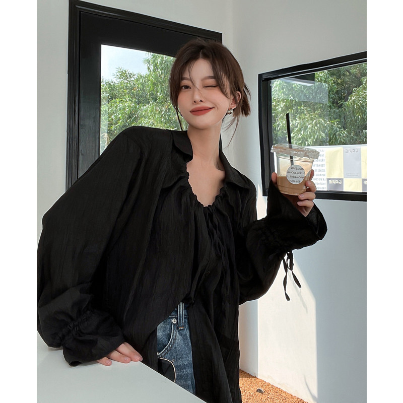 Осенняя рубашка, модный лонгслив, коллекция 2023, оверсайз, V-образный вырез, на шнурках