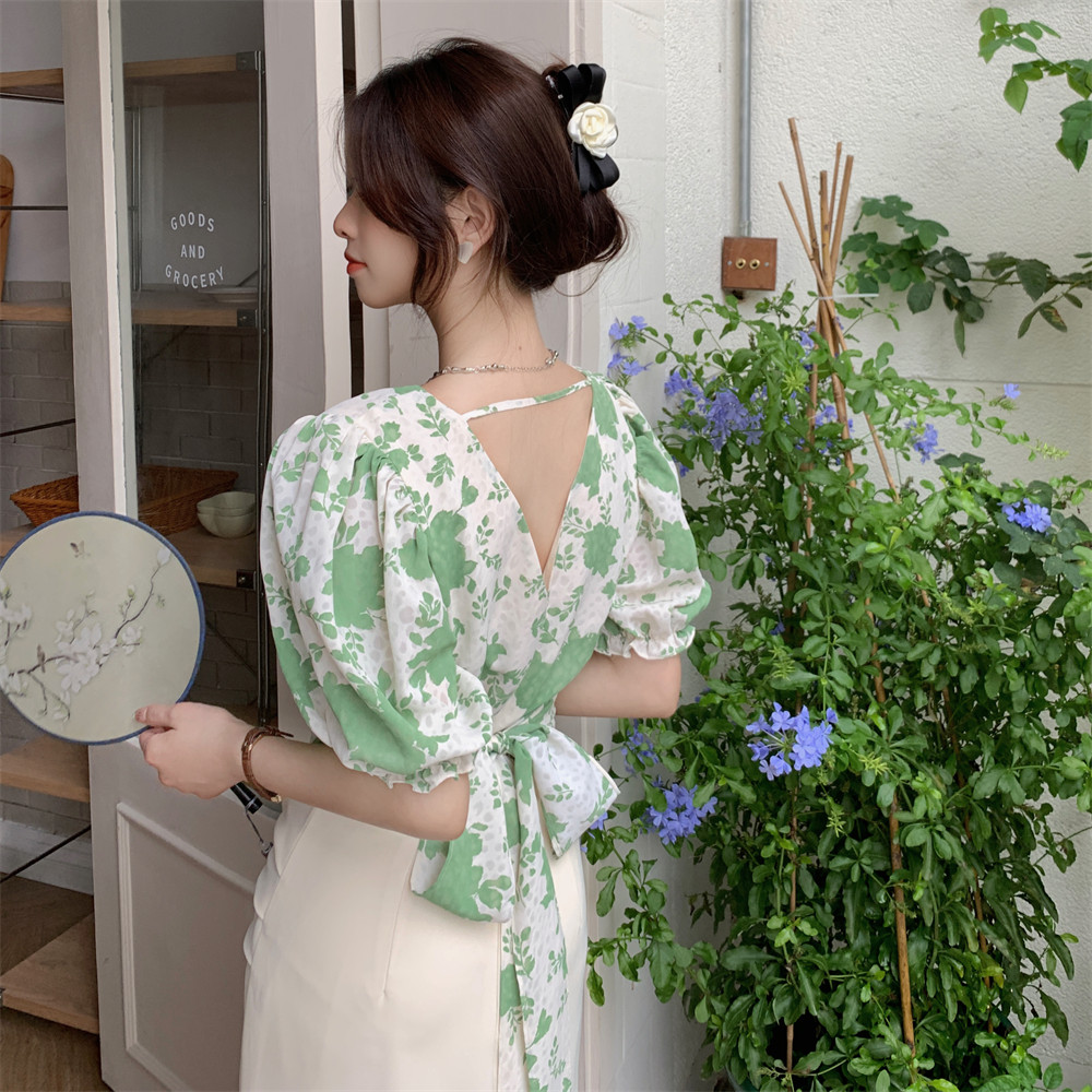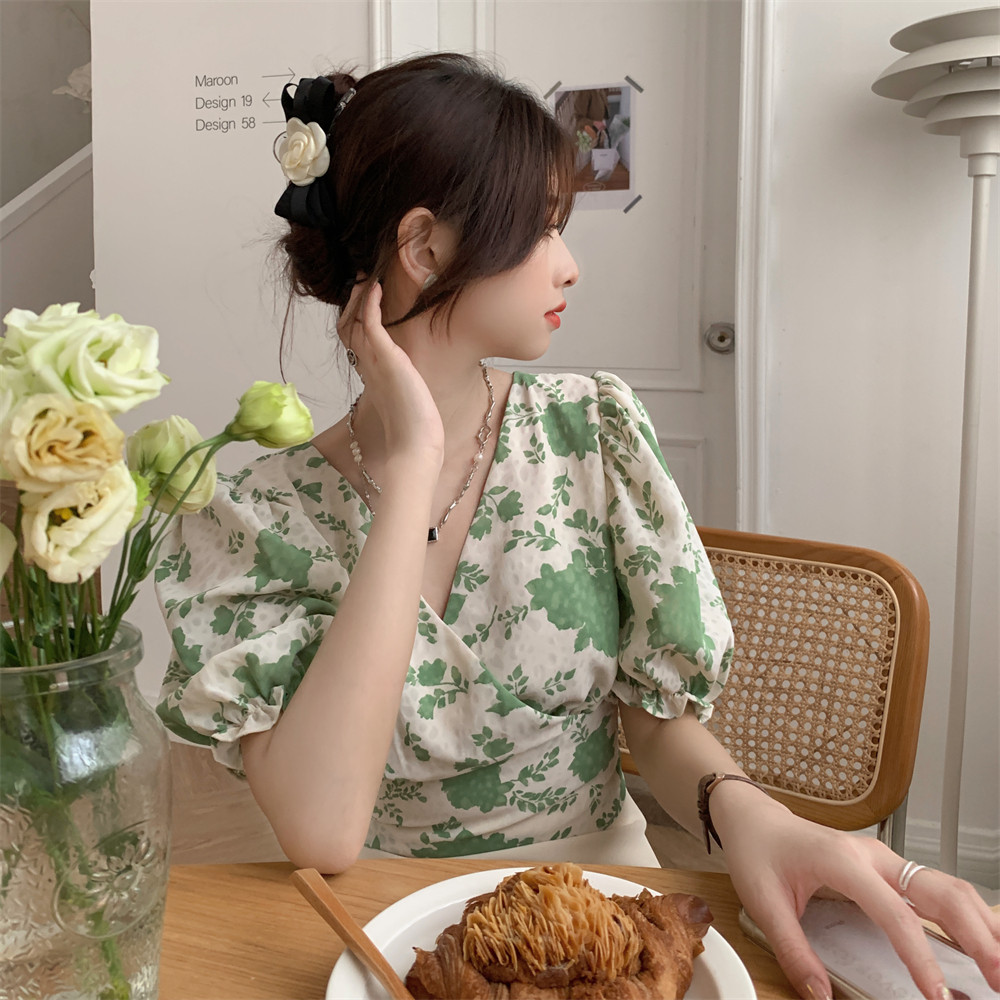 Короткая рубашка с бантиком, французский стиль, V-образный вырез, рукава фонарики, цветочный принт, с открытой спиной