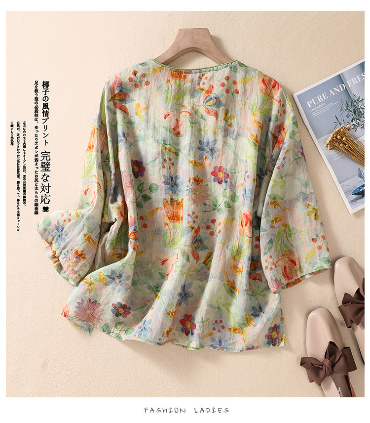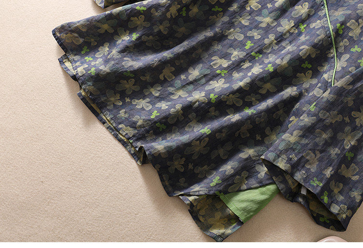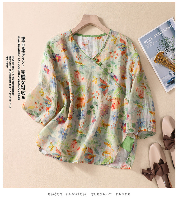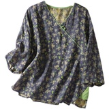Экспорт иностранной торговли хвост одиночный ретро -синий нижняя печатная пластина пряжка национальная ветер, топ, топ -женщина с пятью пятью, v -neck, качественная качество рубашки