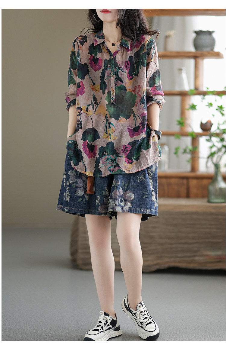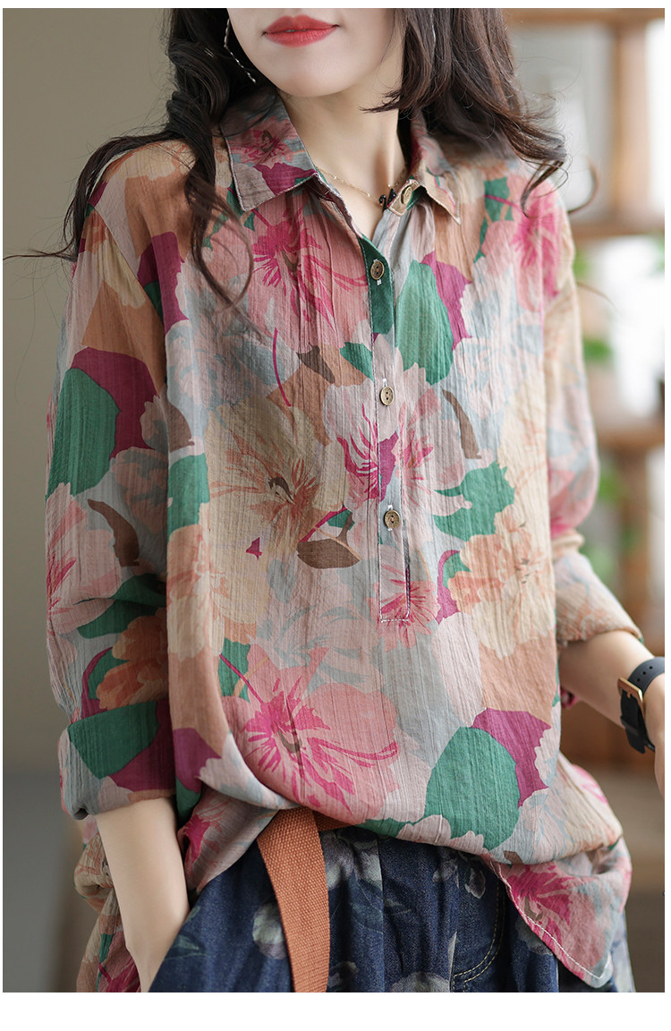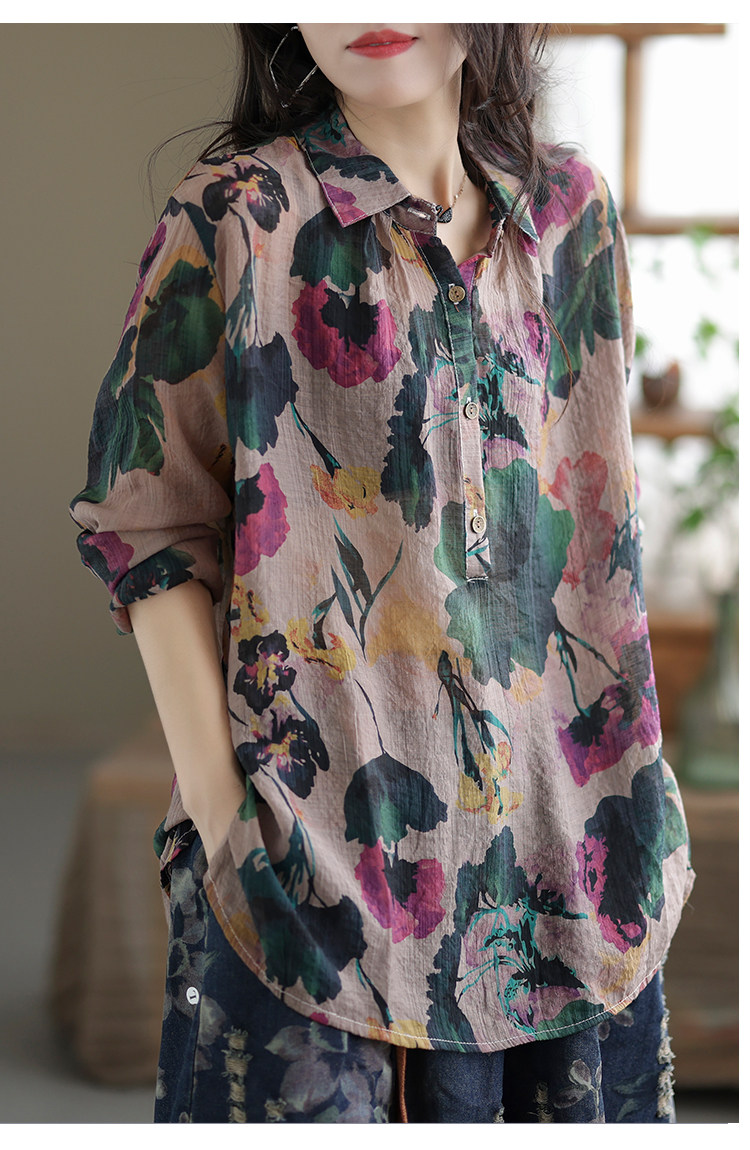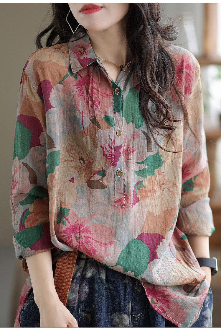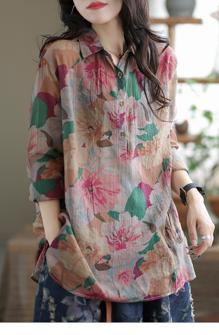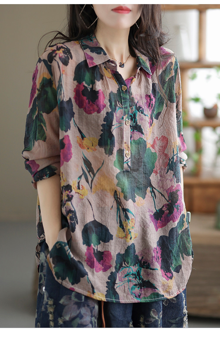 Ретро рубашка, цветочный принт, оверсайз, из хлопка и льна