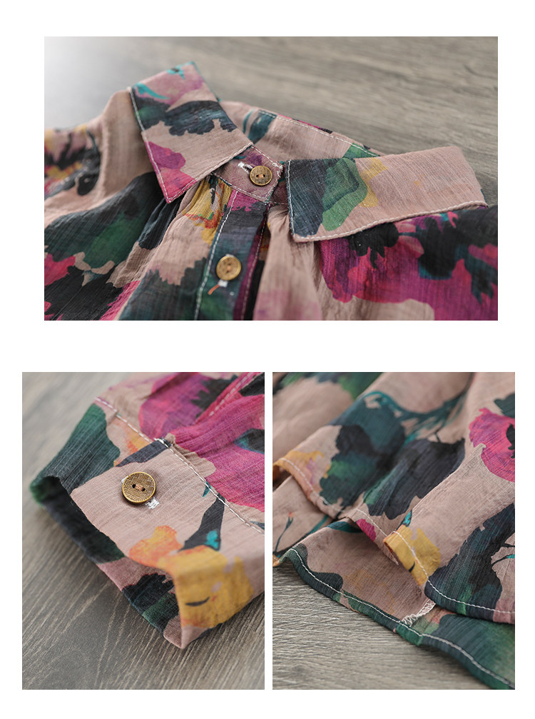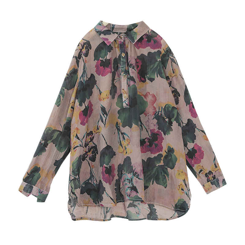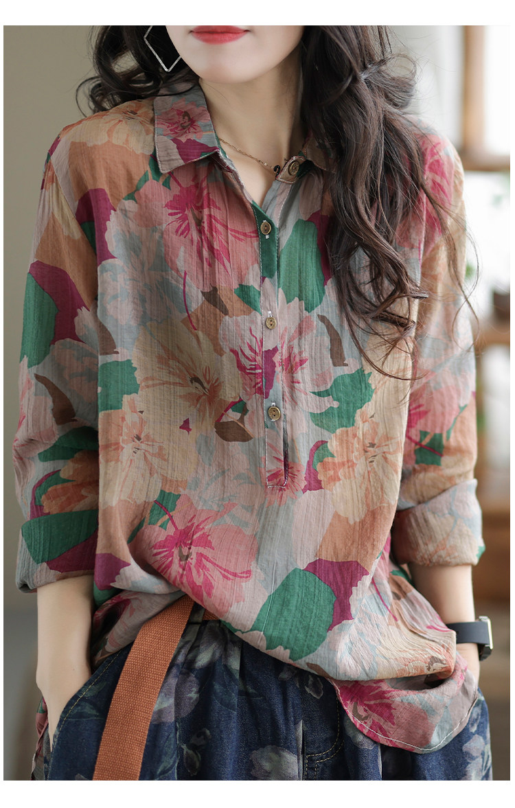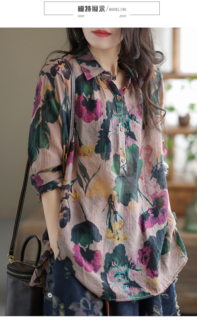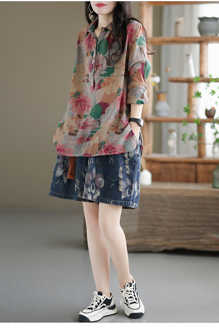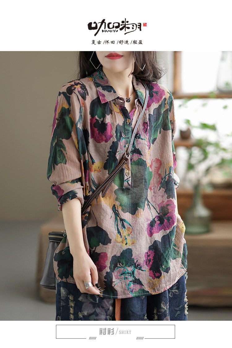 Ретро рубашка, цветочный принт, оверсайз, из хлопка и льна