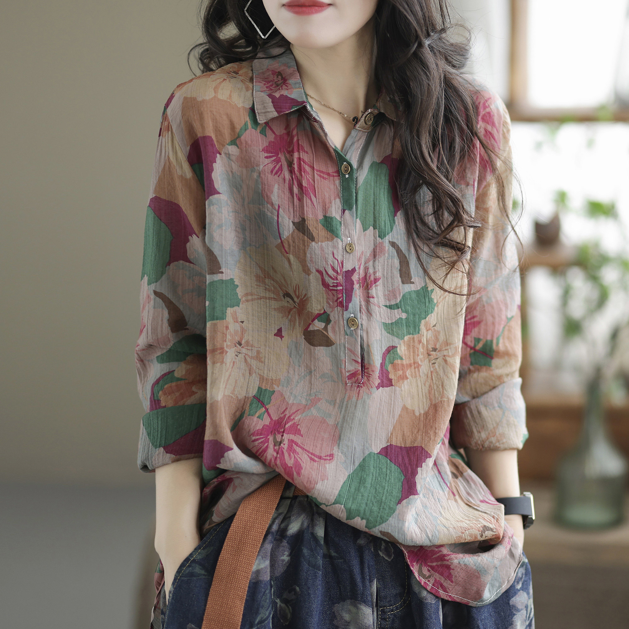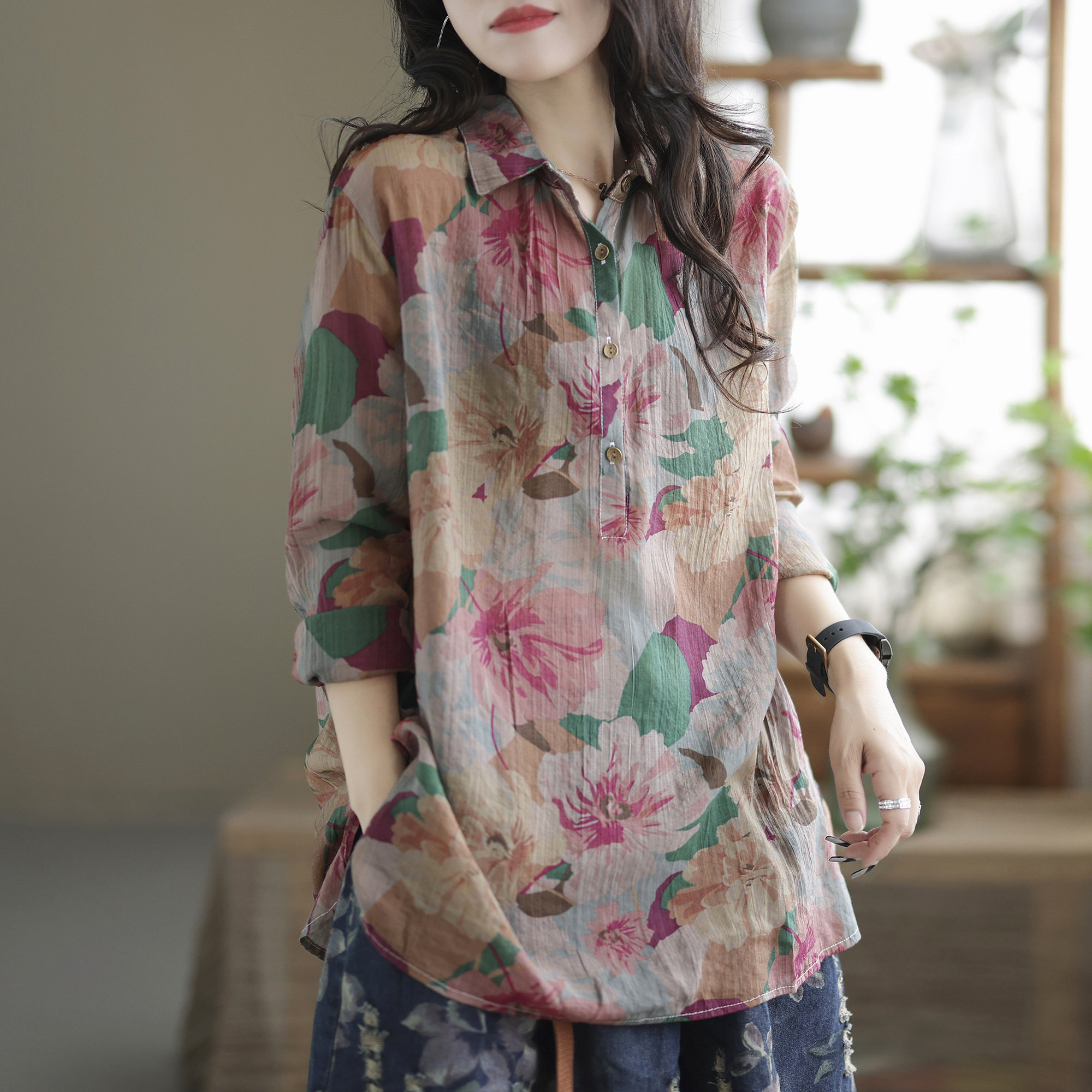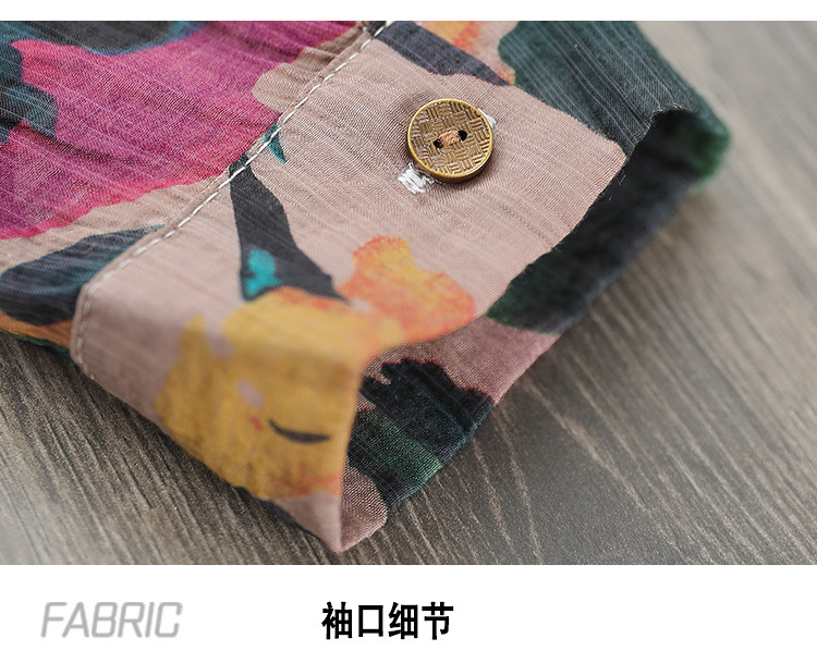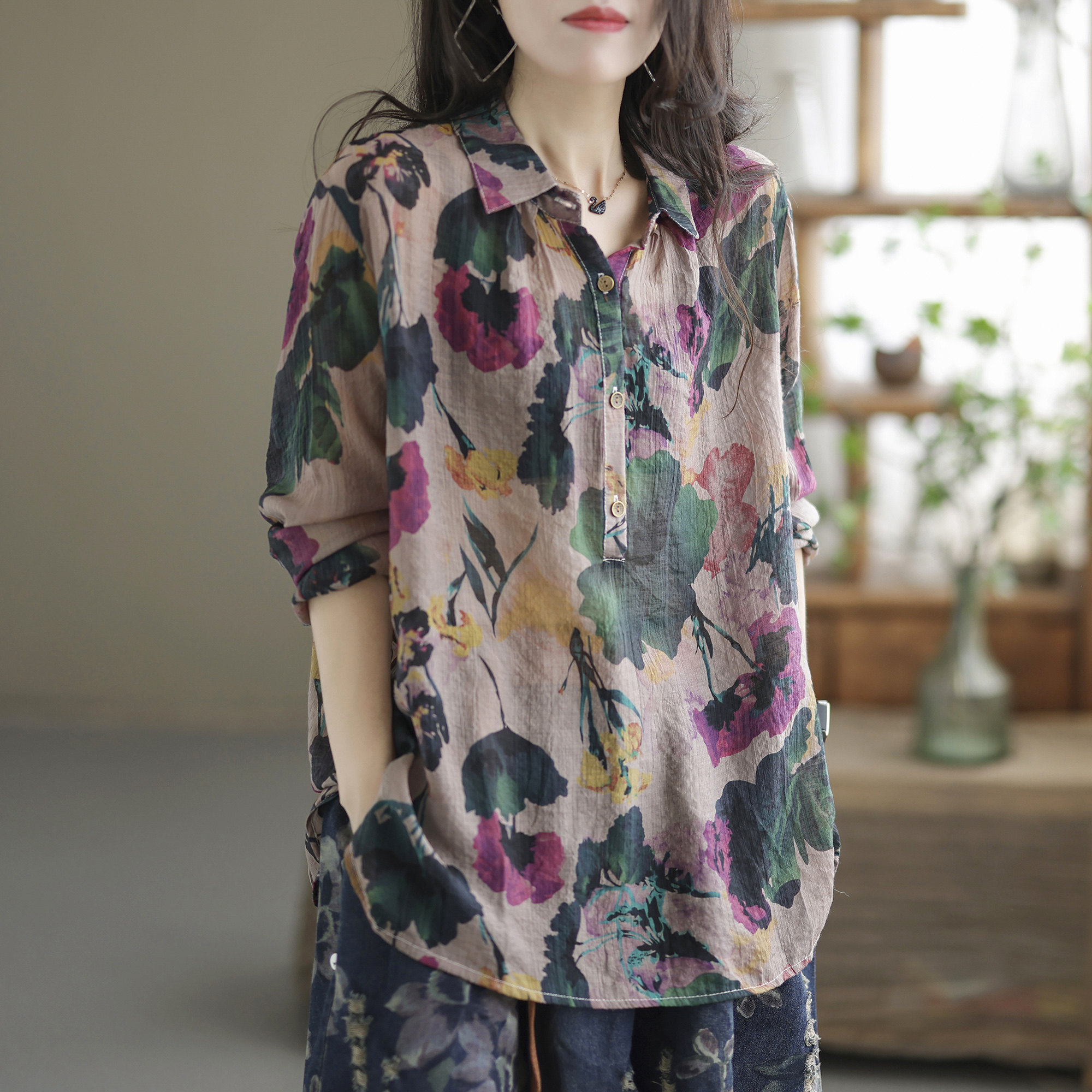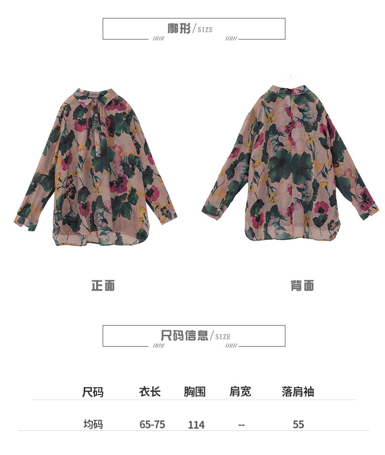 Ретро рубашка, цветочный принт, оверсайз, из хлопка и льна