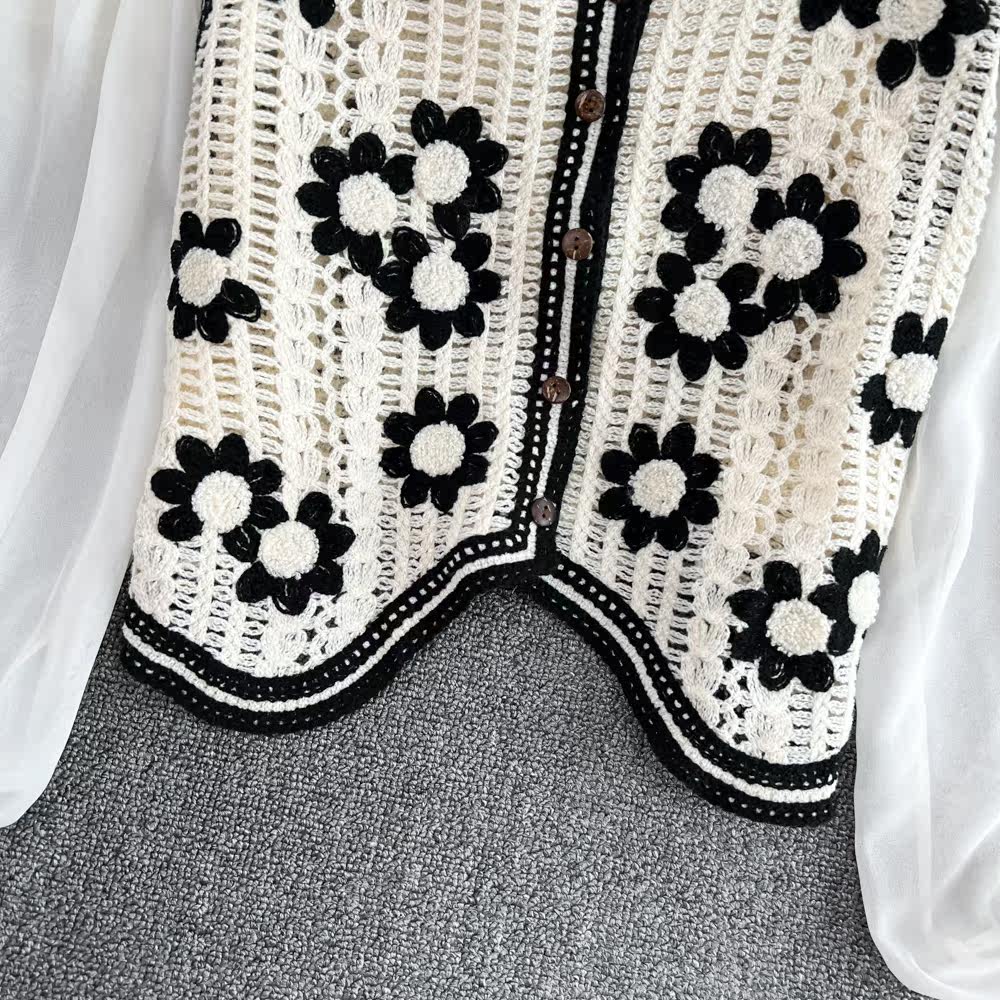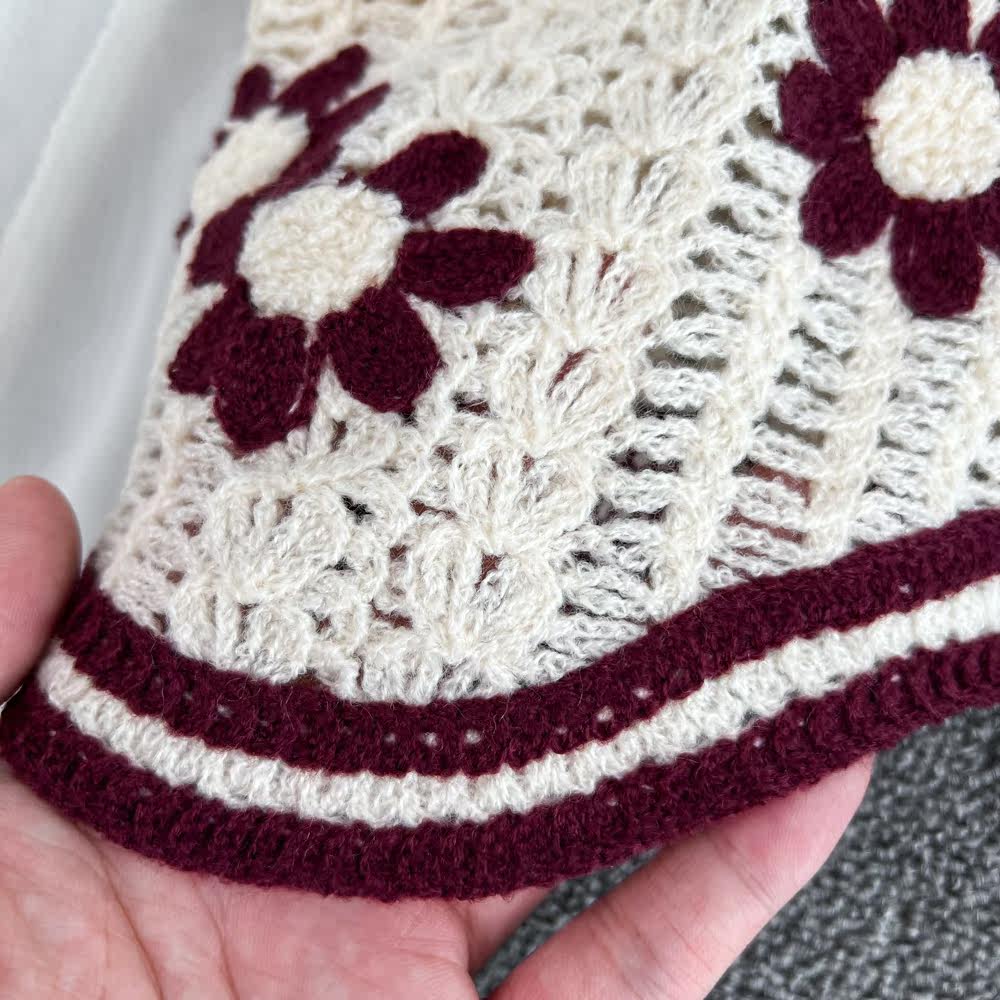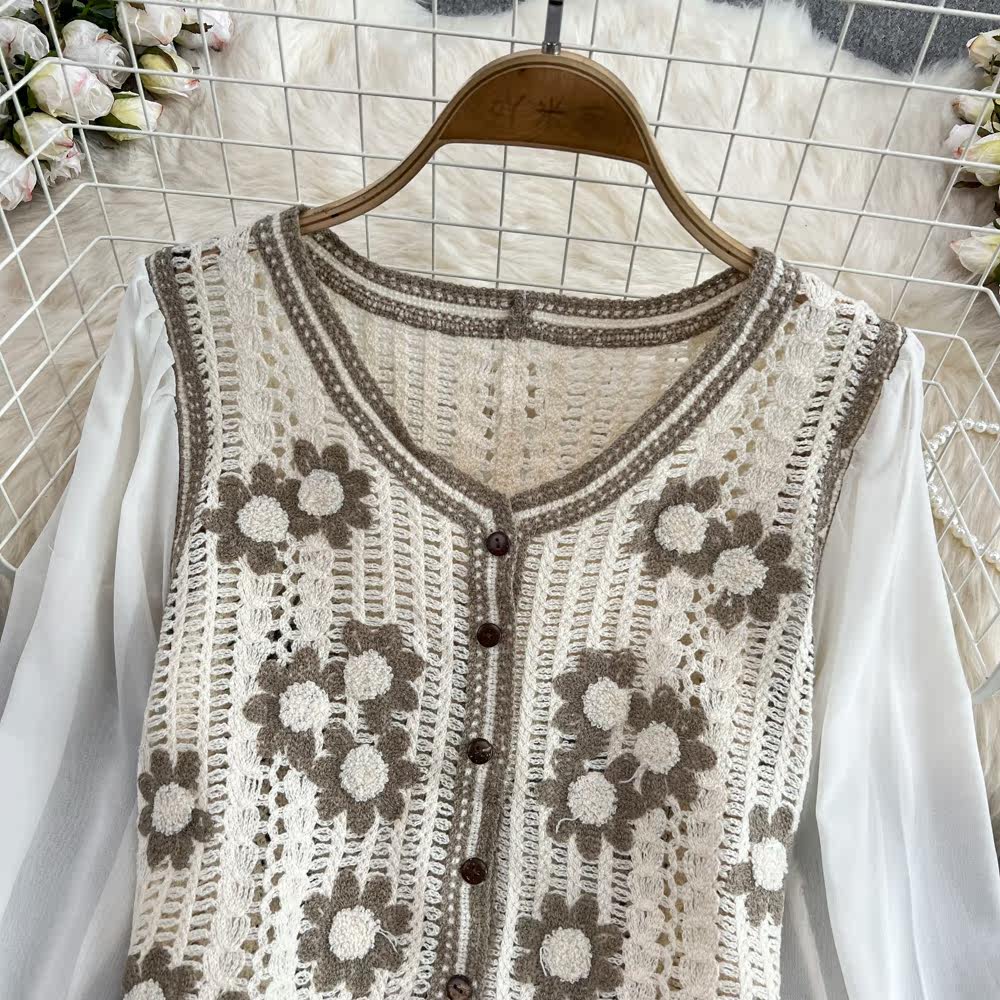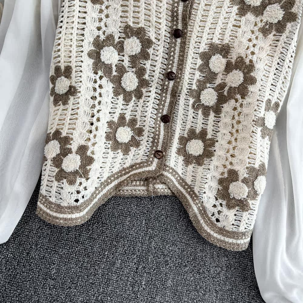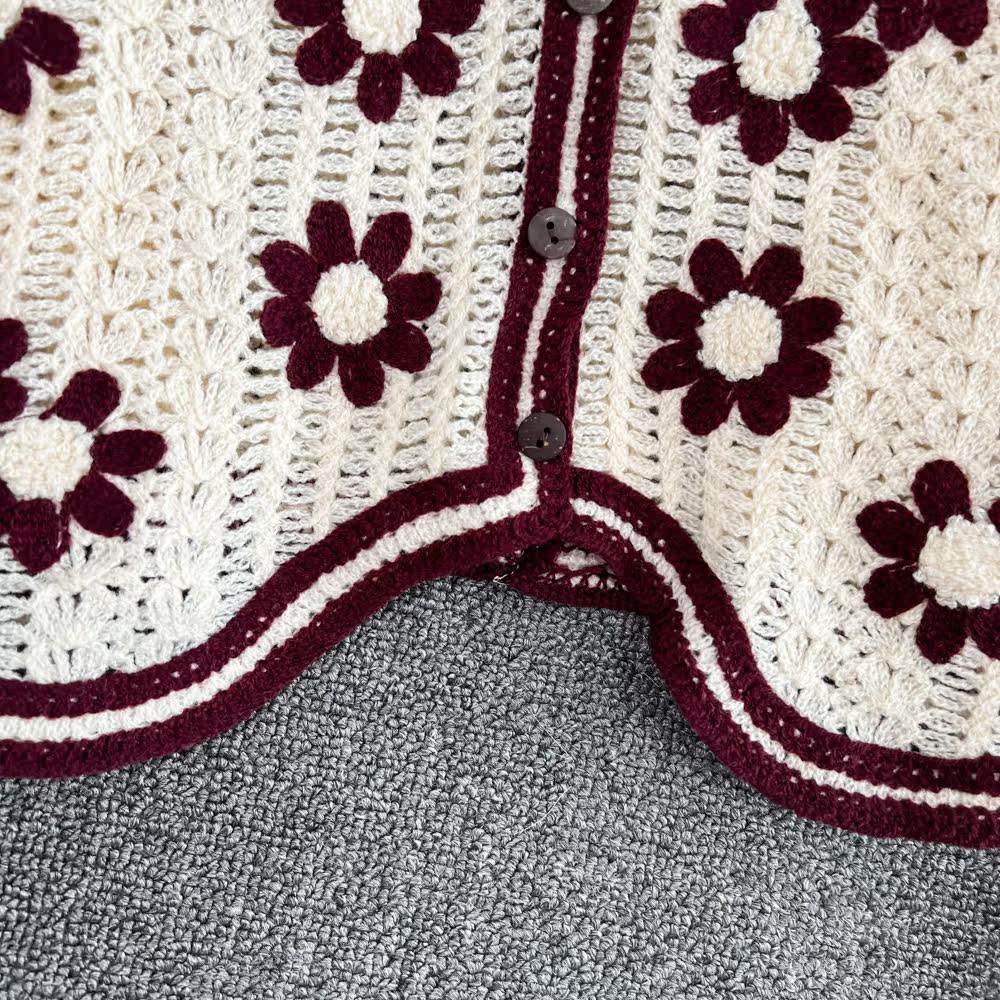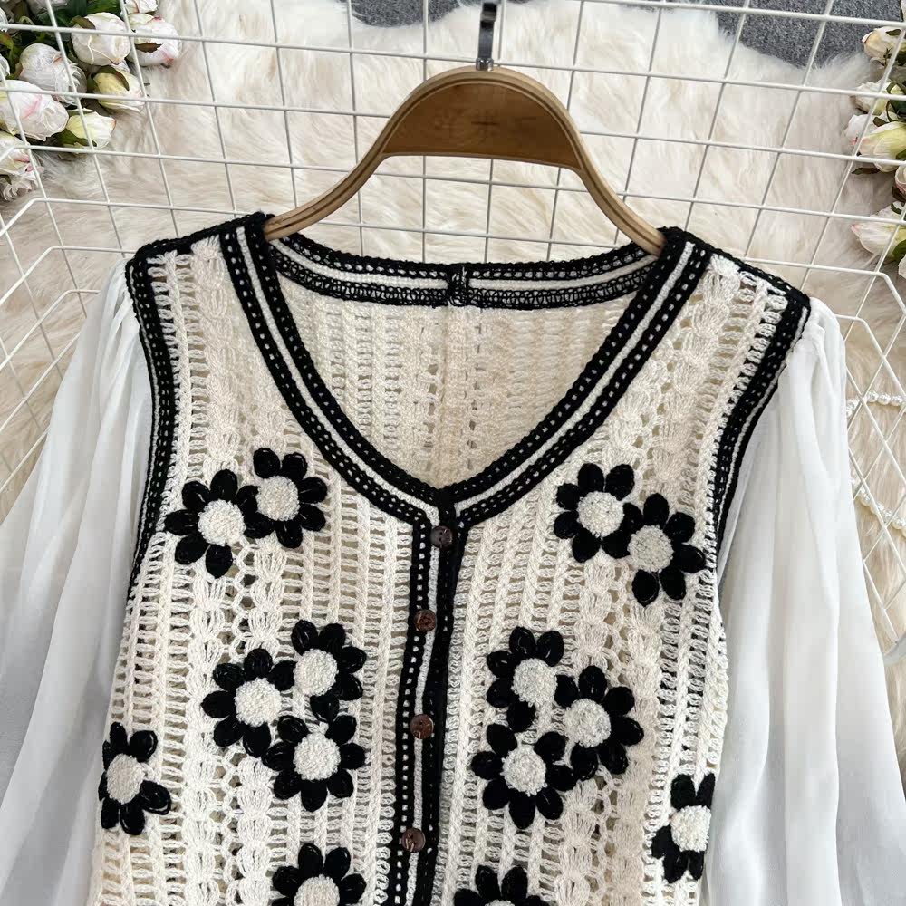 Осенняя милая плетеная трикотажная короткая рубашка, V-образный вырез, в цветочек, в западном стиле