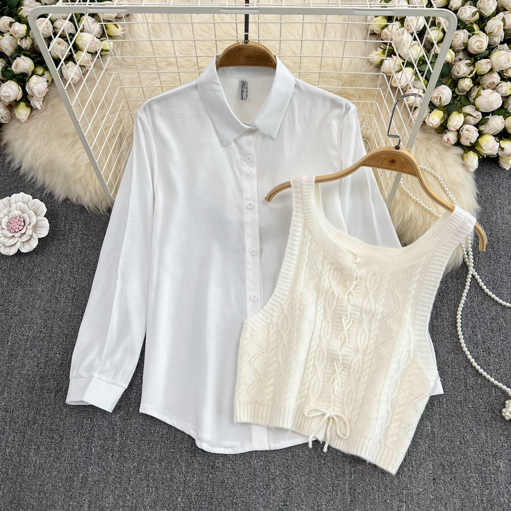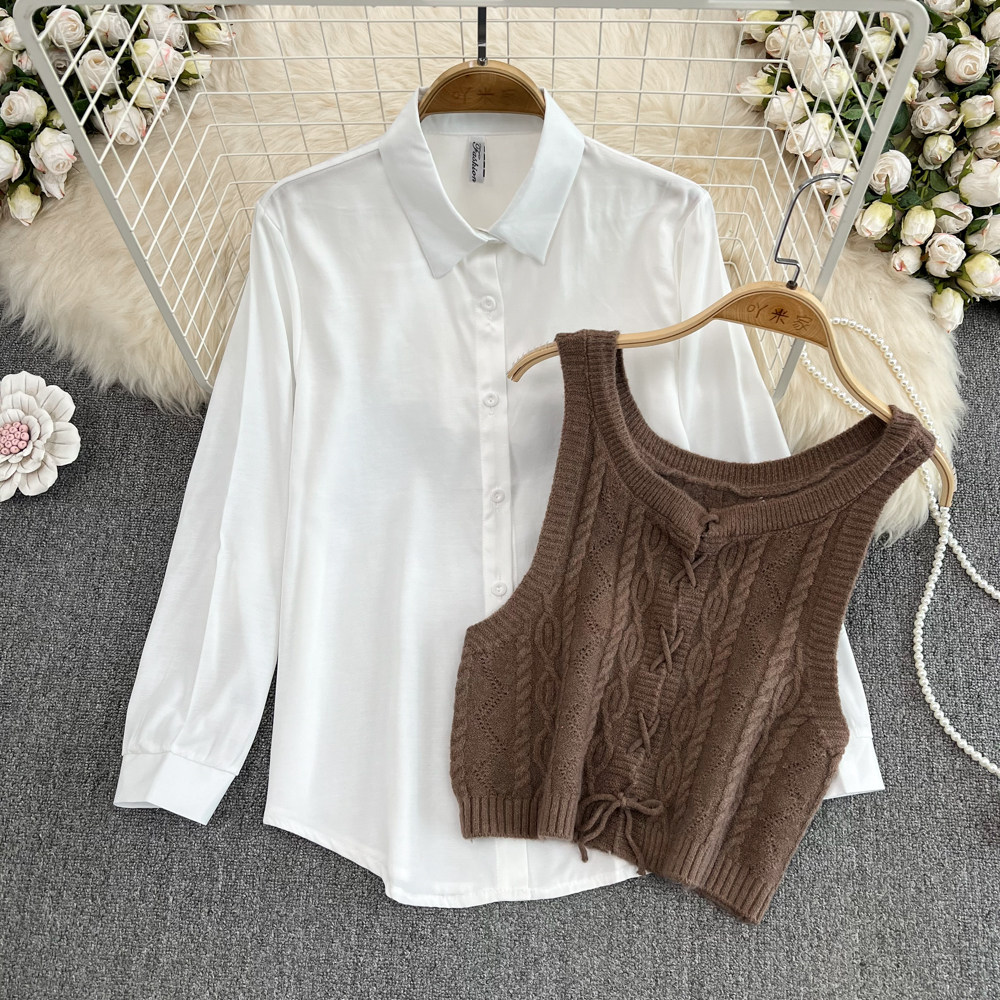 Осенний брендовый милый трикотажный жилет с косичкой без рукавов, комплект, лонгслив, рубашка, в корейском стиле, свободный крой, оверсайз