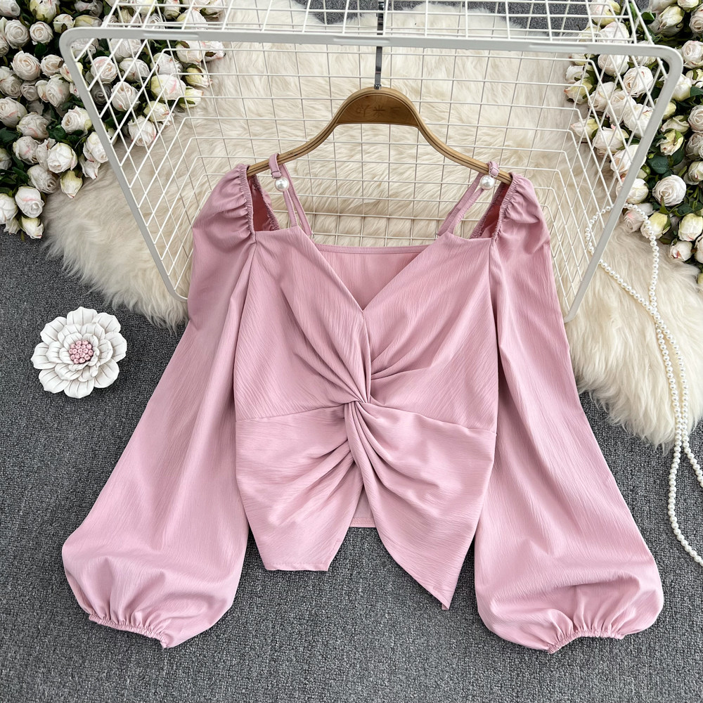 Осенний ретро лонгслив, короткая рубашка, французский стиль, изысканный стиль, яркий броский стиль, V-образный вырез, эффект подтяжки, в западном стиле