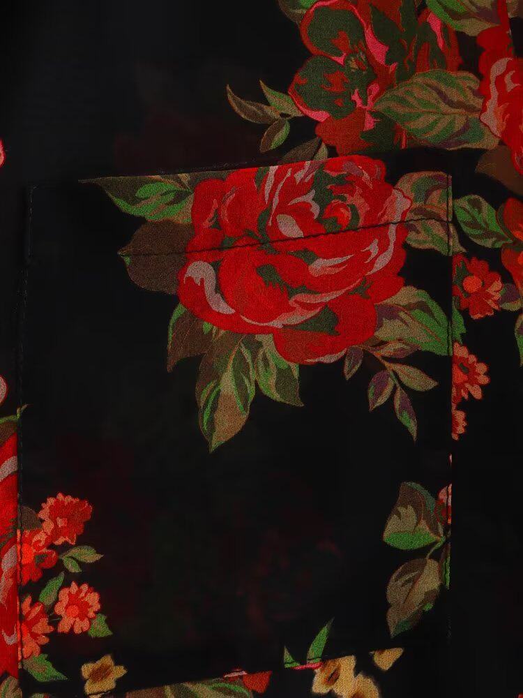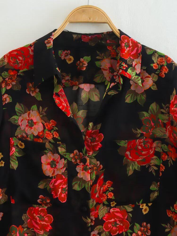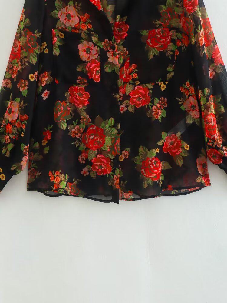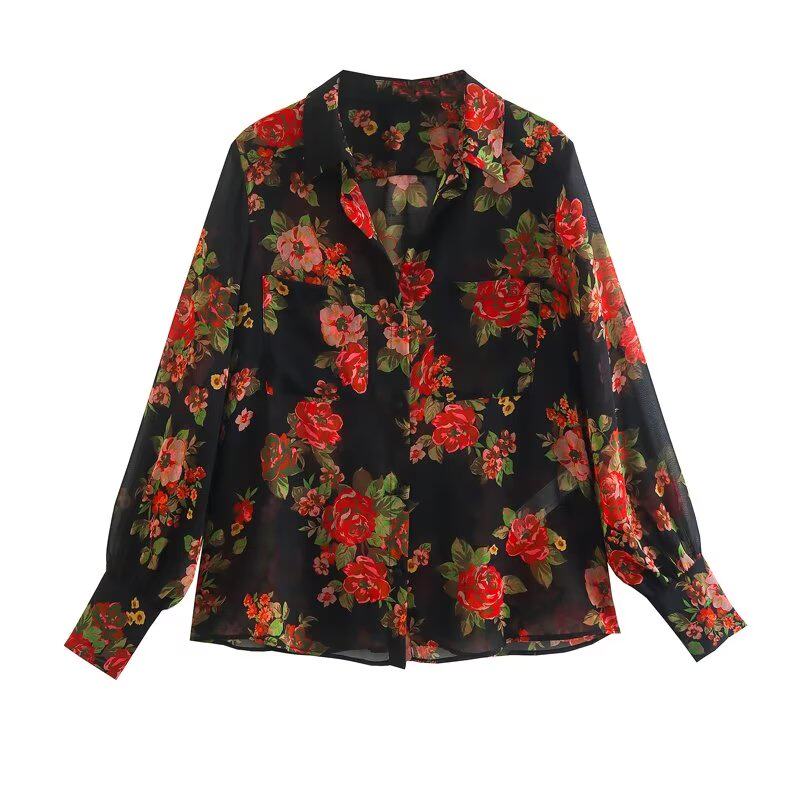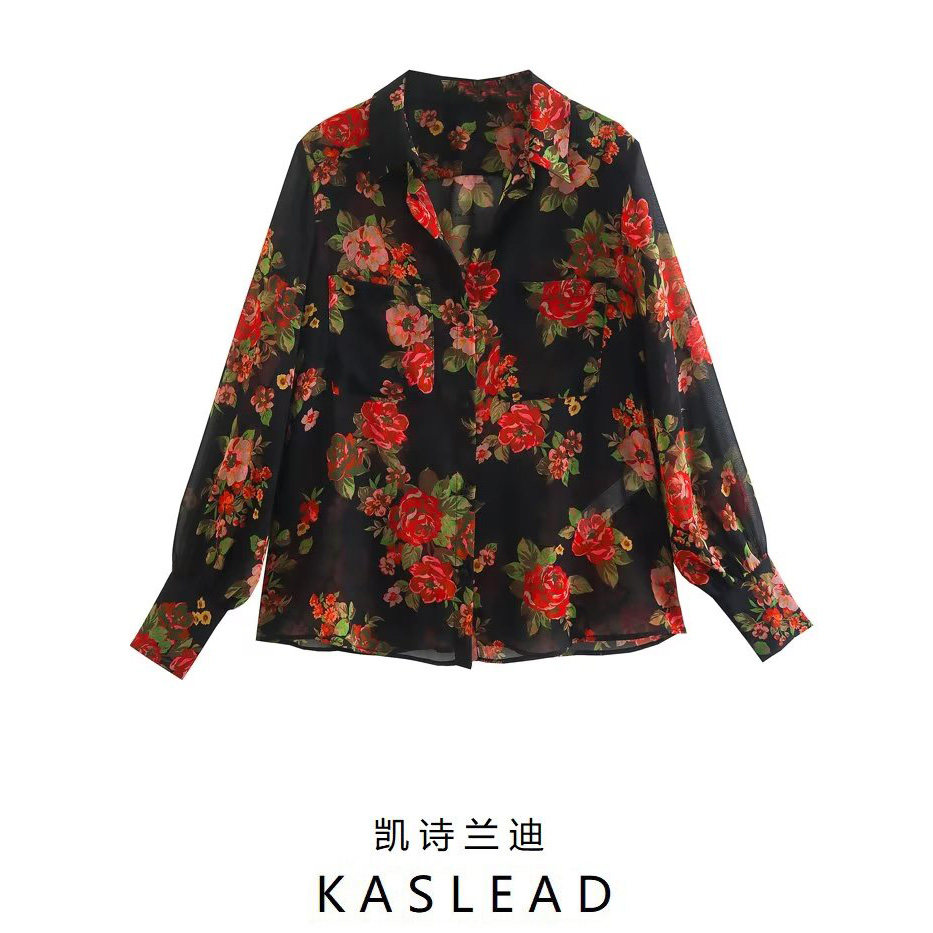 Kaslead New Women's European и American Hiper Bag Decore Semi -Transparent Printed Long -Sleebed Рубашка 7973322 330