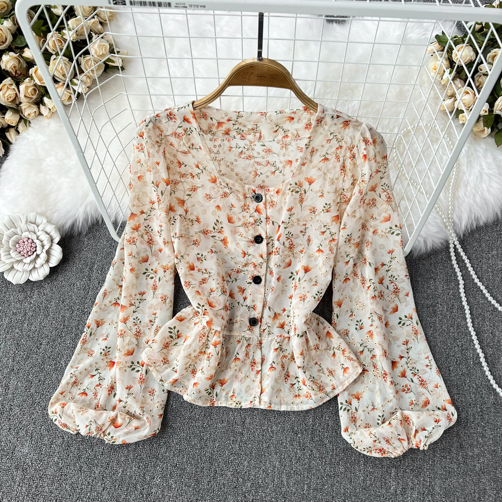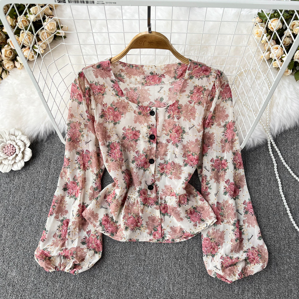 Ретро лонгслив, корсет, короткая рубашка, квадратный вырез, цветочный принт, в западном стиле