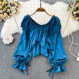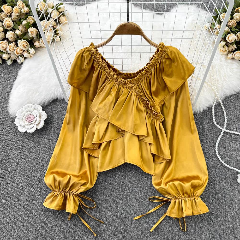 Осенняя демисезонная рубашка, ретро лонгслив, V-образный вырез, рукава фонарики, в корейском стиле, классическая длина