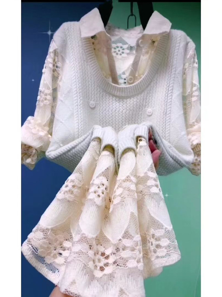 Осенний комплект, кружевная трикотажная рубашка, имитация рубашки