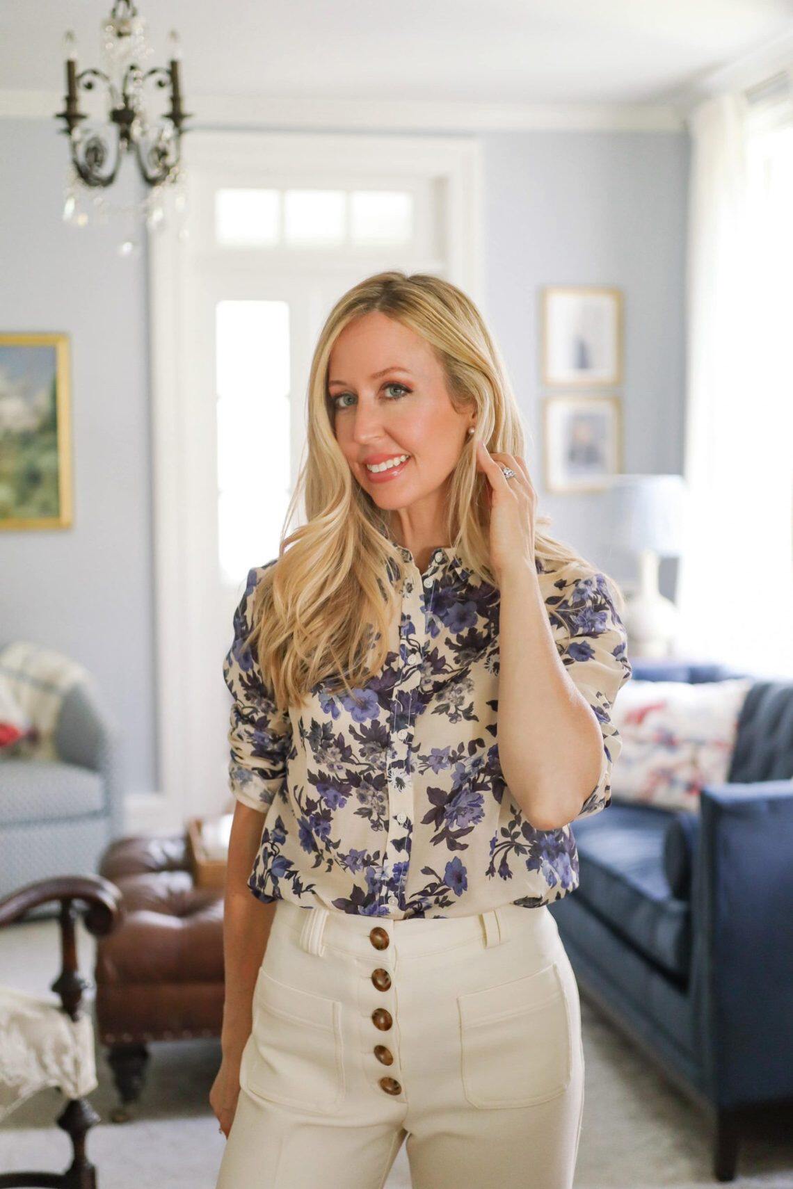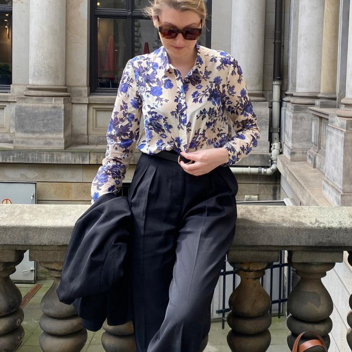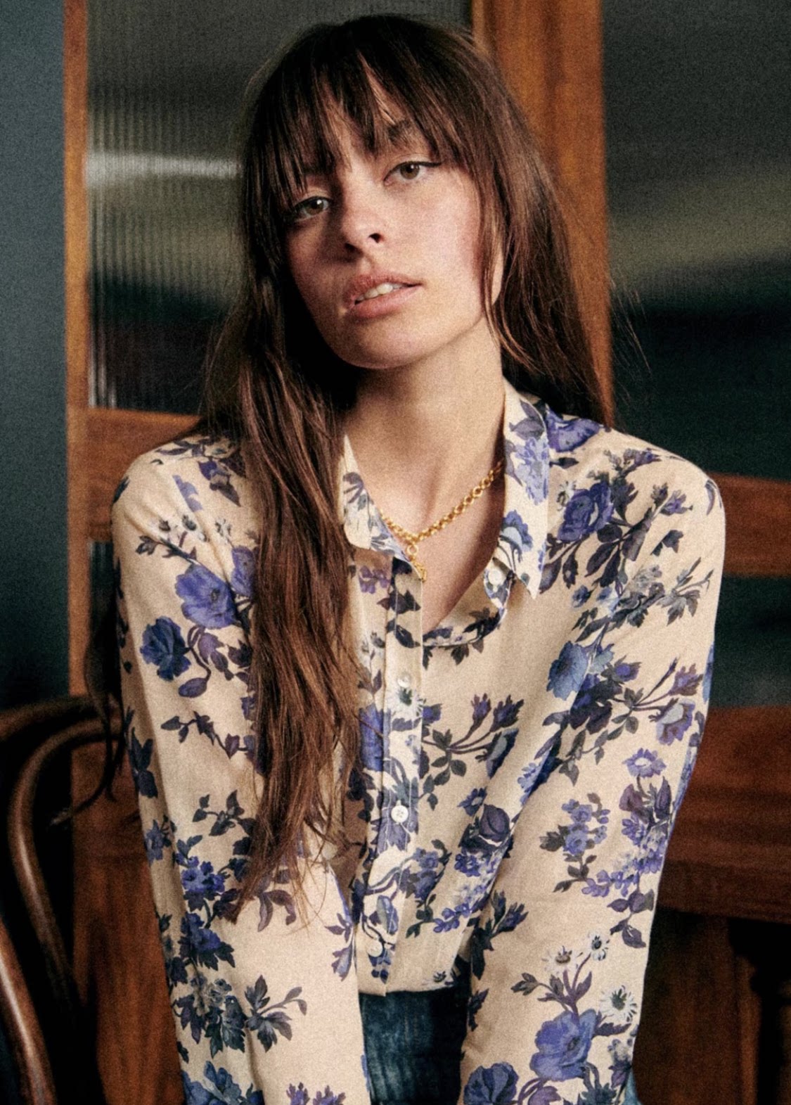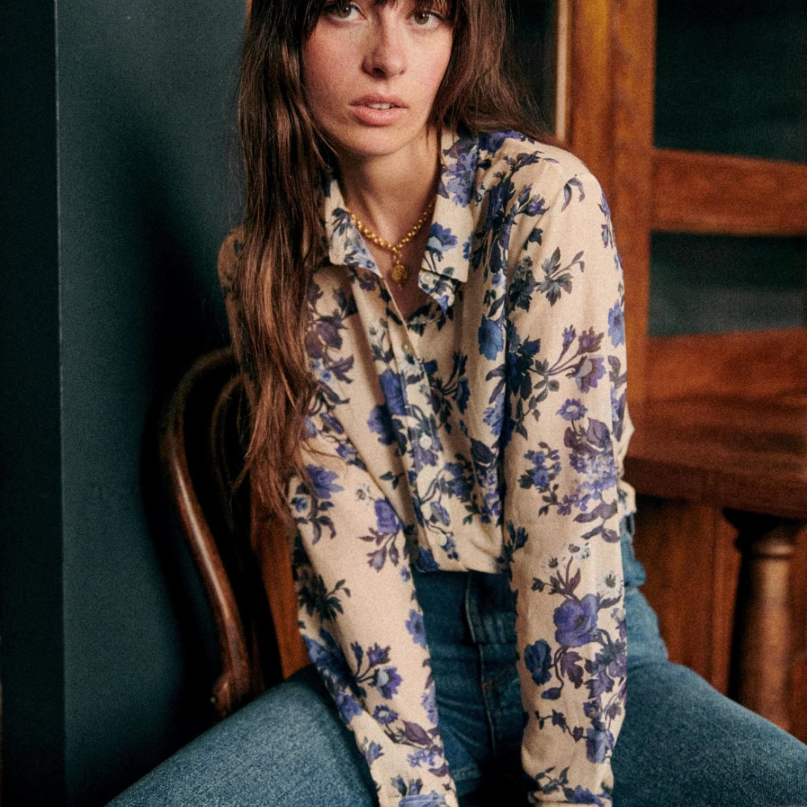 Ретро синяя хлопковая рубашка, лонгслив, французский стиль, цветочный принт