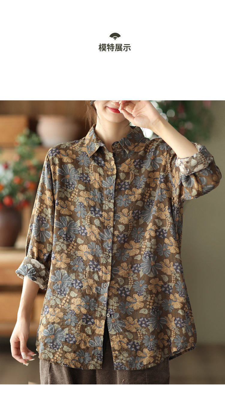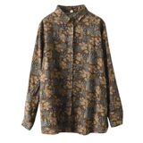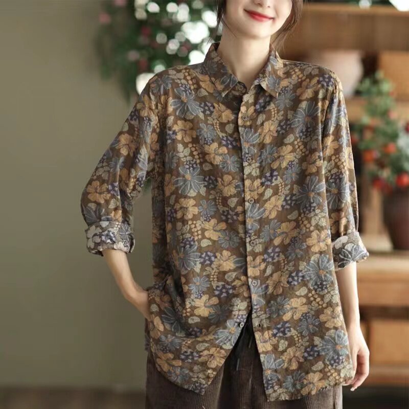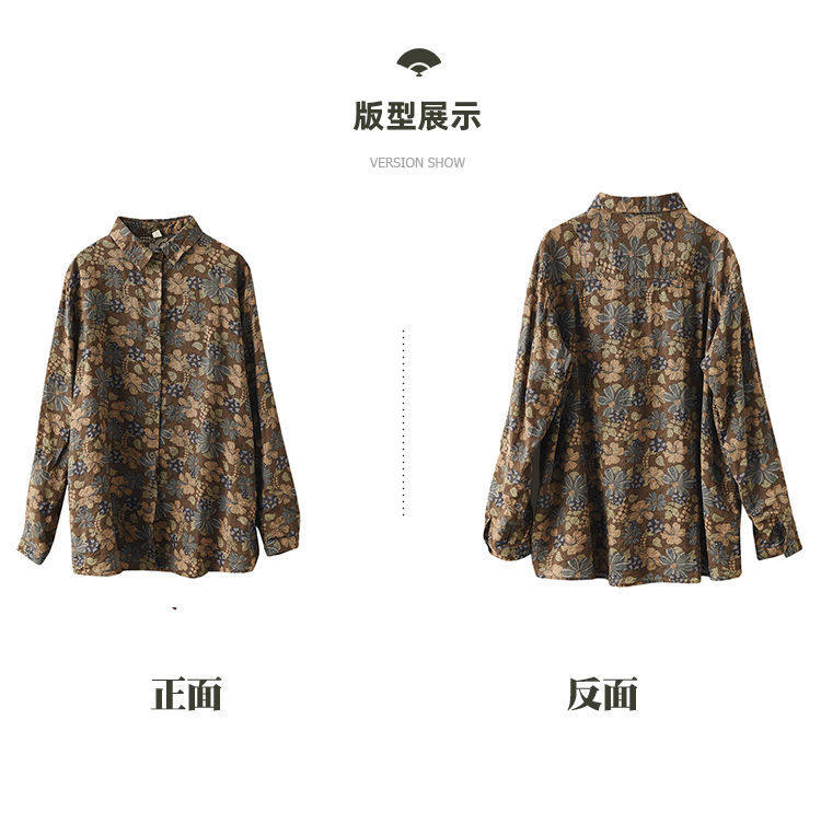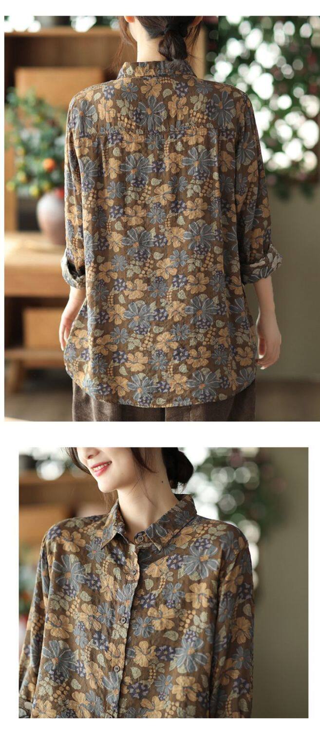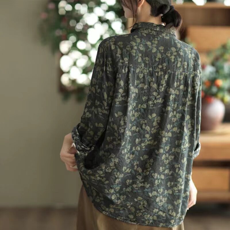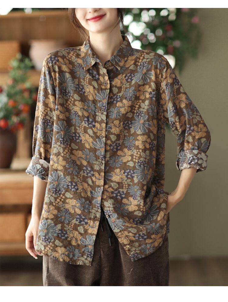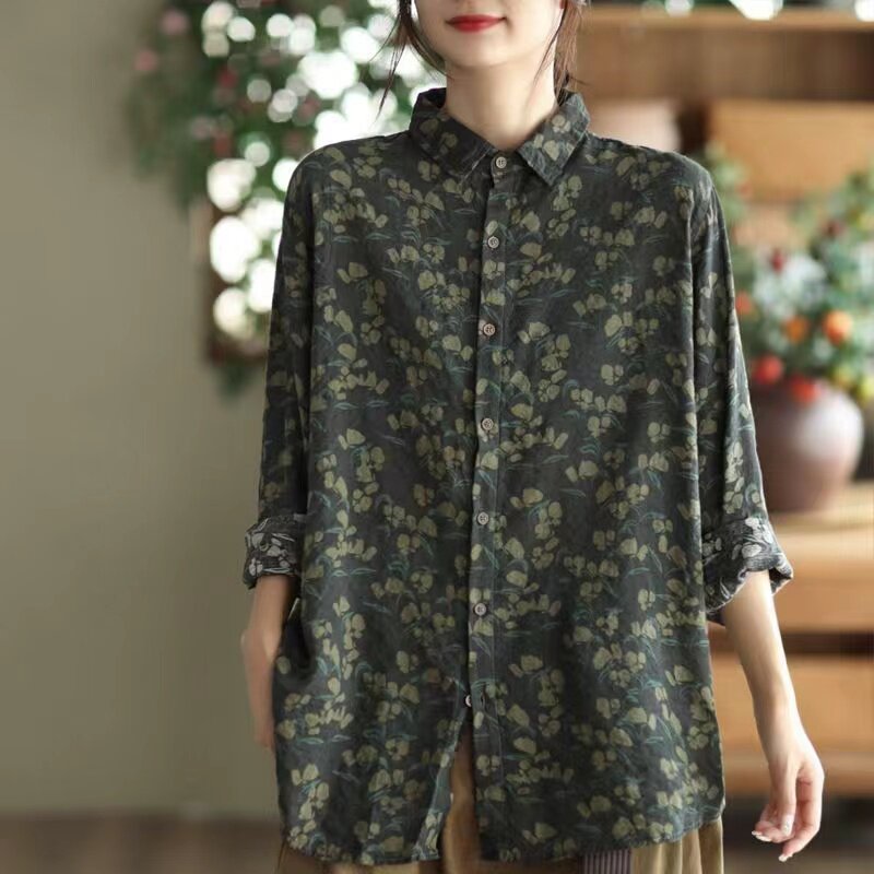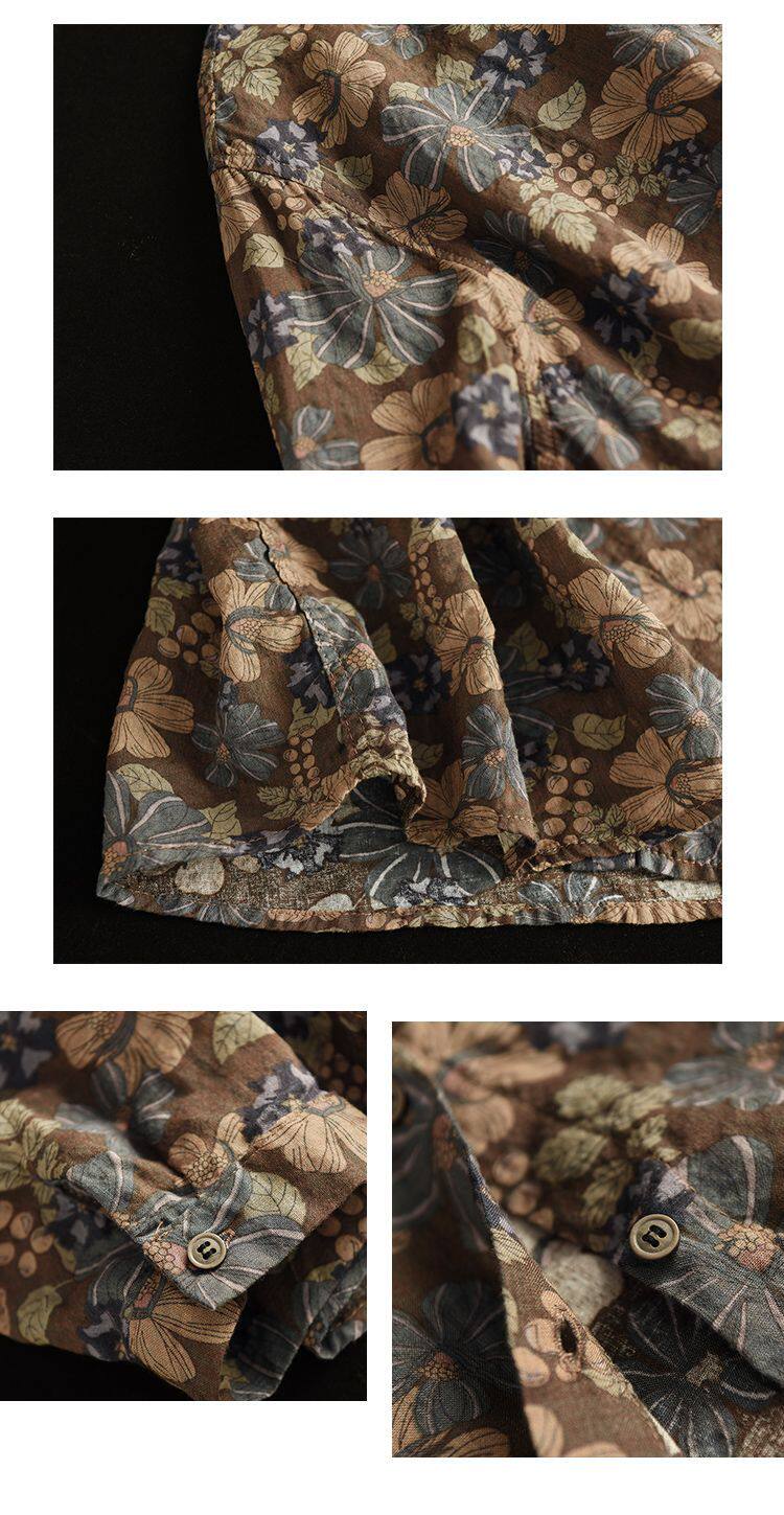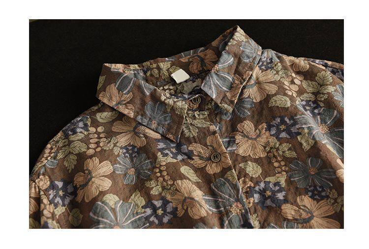 (Трансграничная торговля), рубашка, лонгслив, японские и корейские, цветочный принт, из хлопка и льна, большой размер