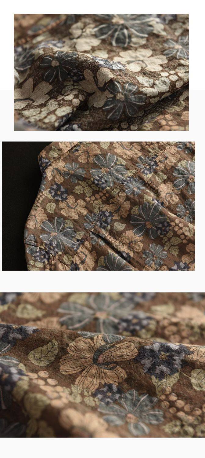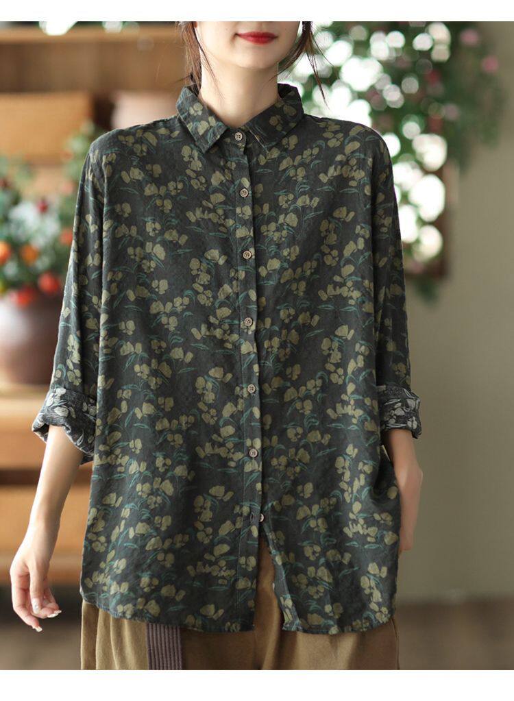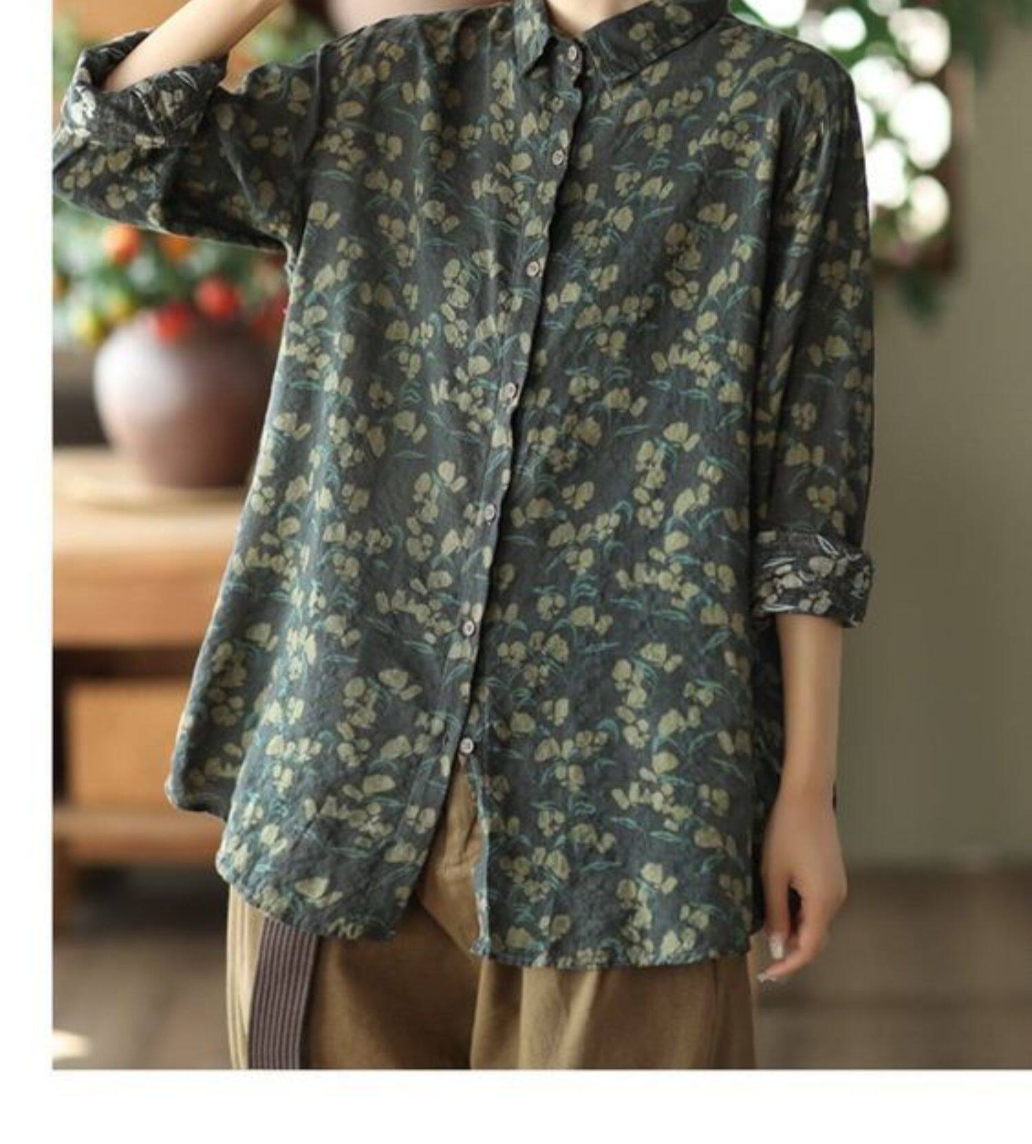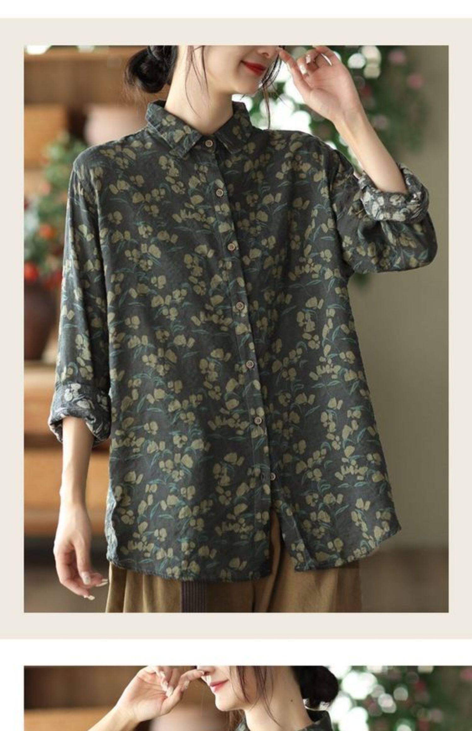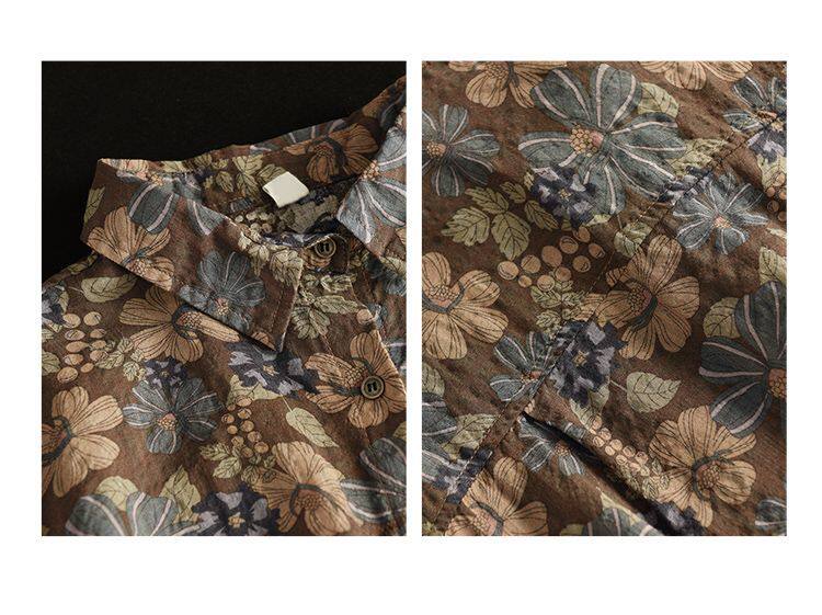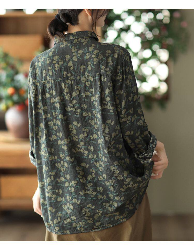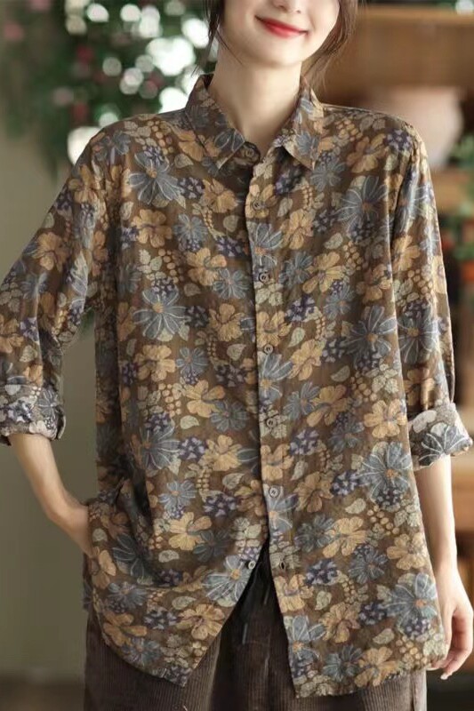 (Трансграничная торговля), рубашка, лонгслив, японские и корейские, цветочный принт, из хлопка и льна, большой размер