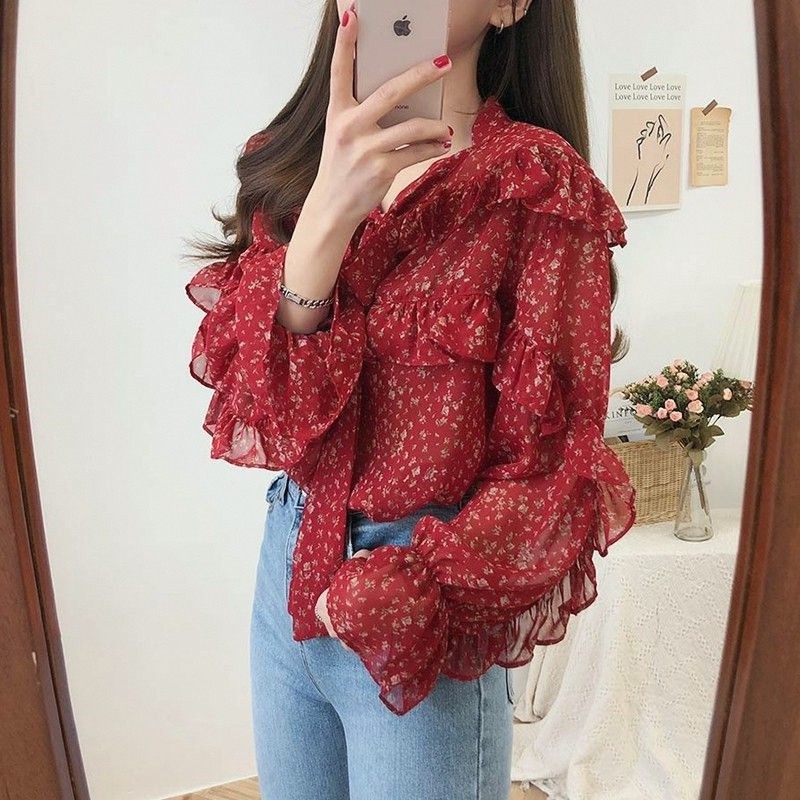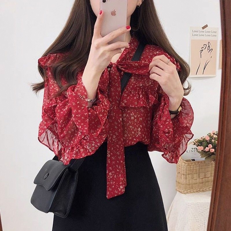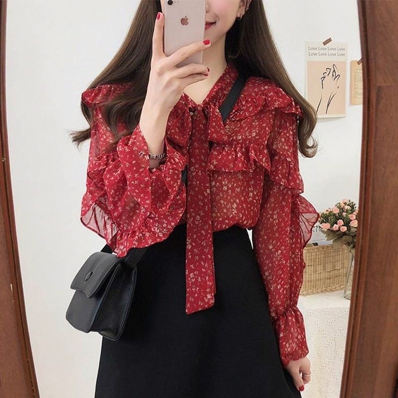 Красный шифоновый модный осенний лонгслив, базовая приятная телу рубашка, цветочный принт, в западном стиле
