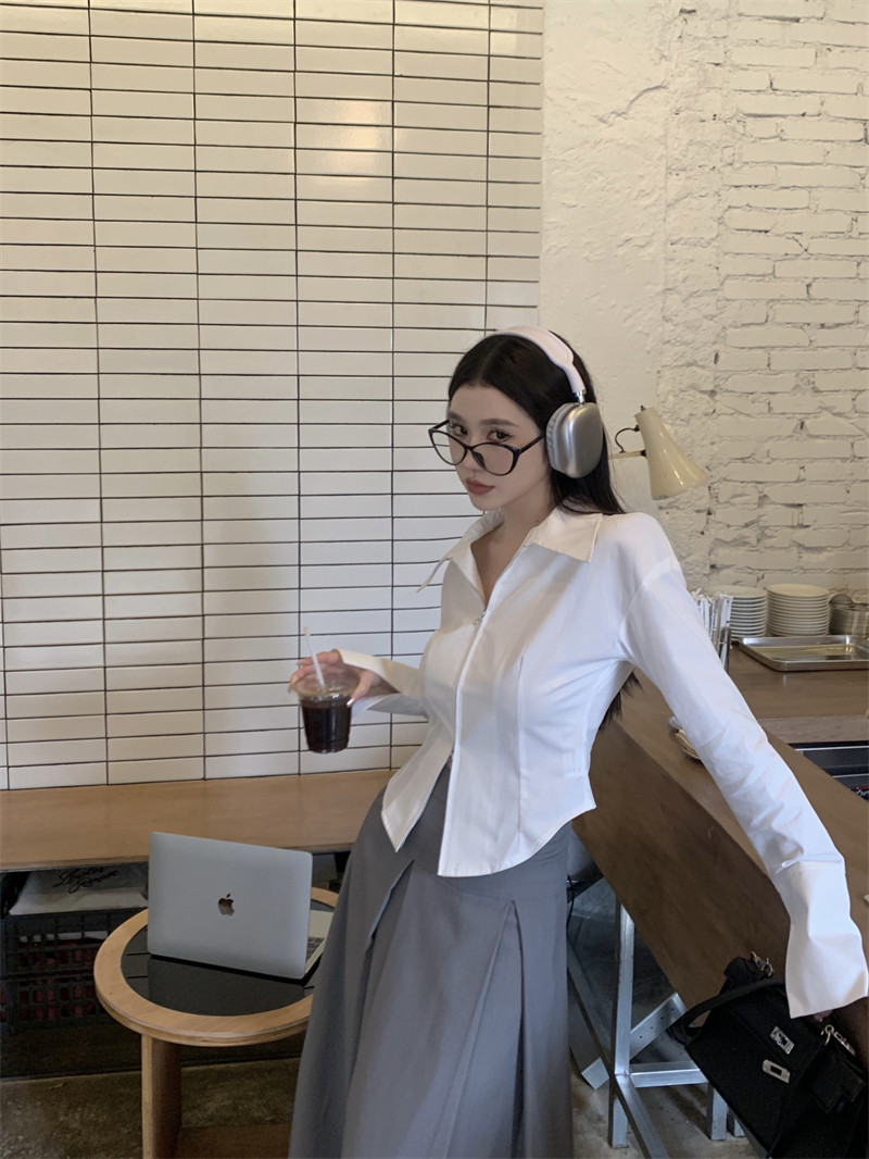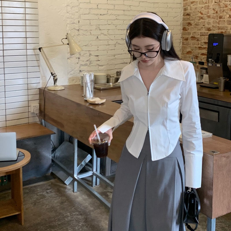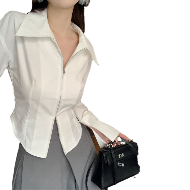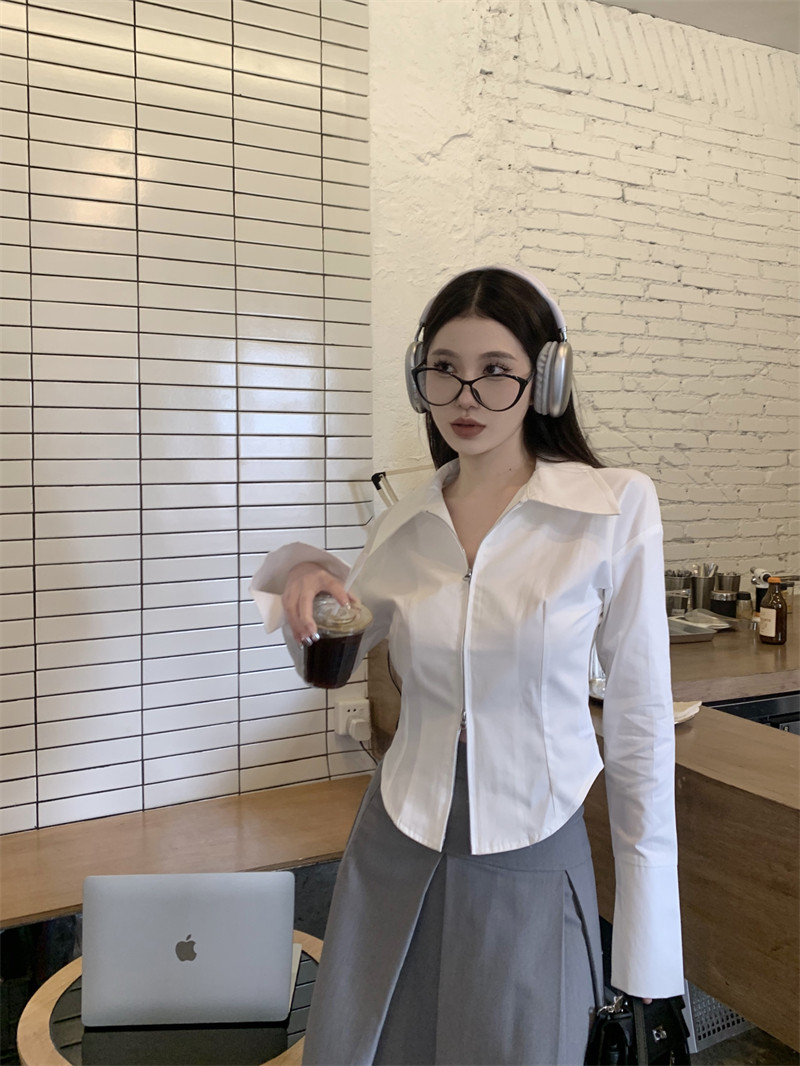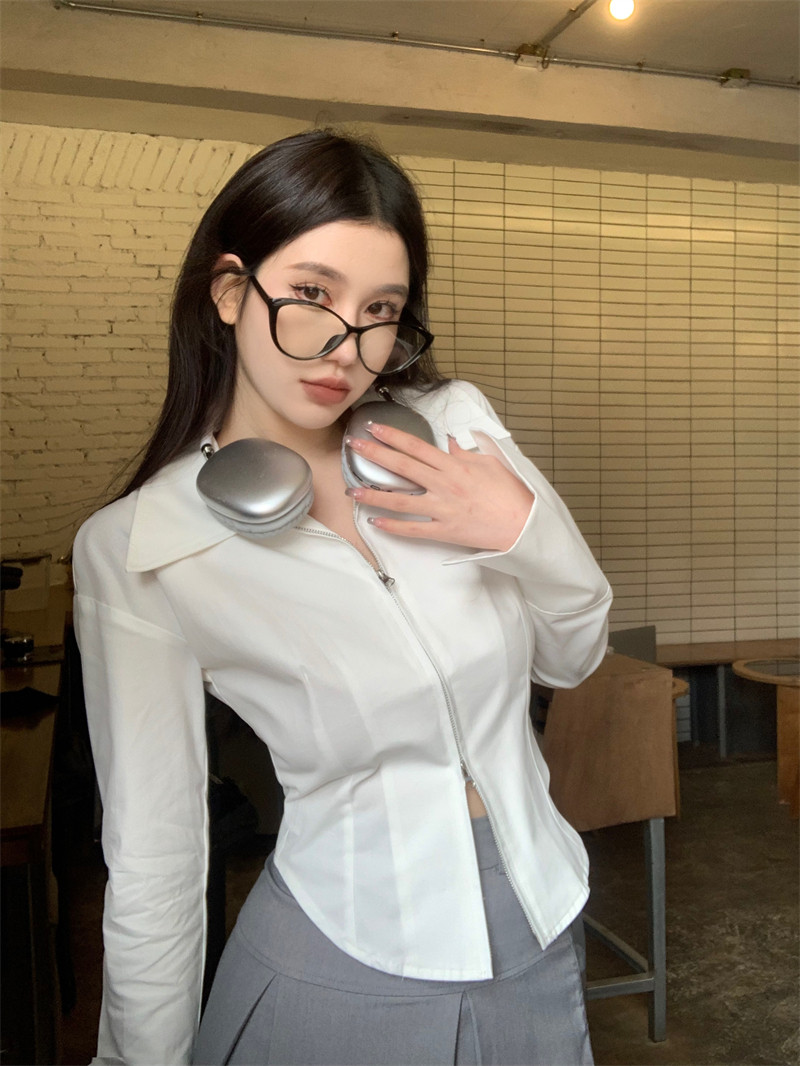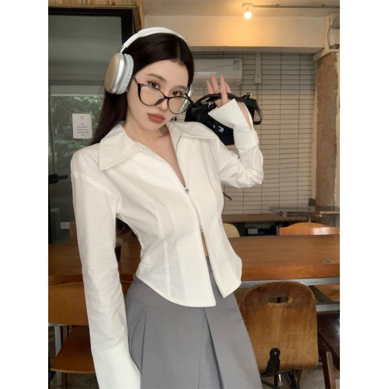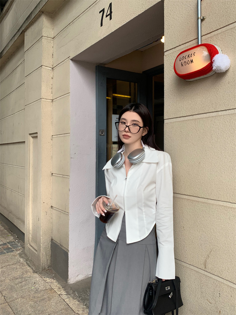 Белая весенняя короткая дизайнерская базовая рубашка с молнией, французский стиль, тренд сезона