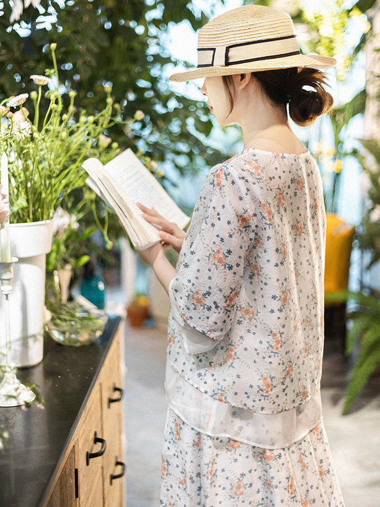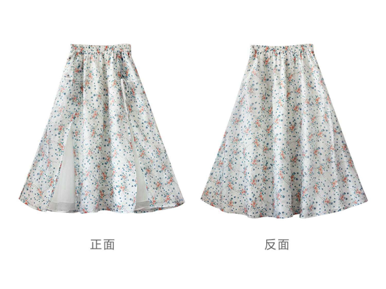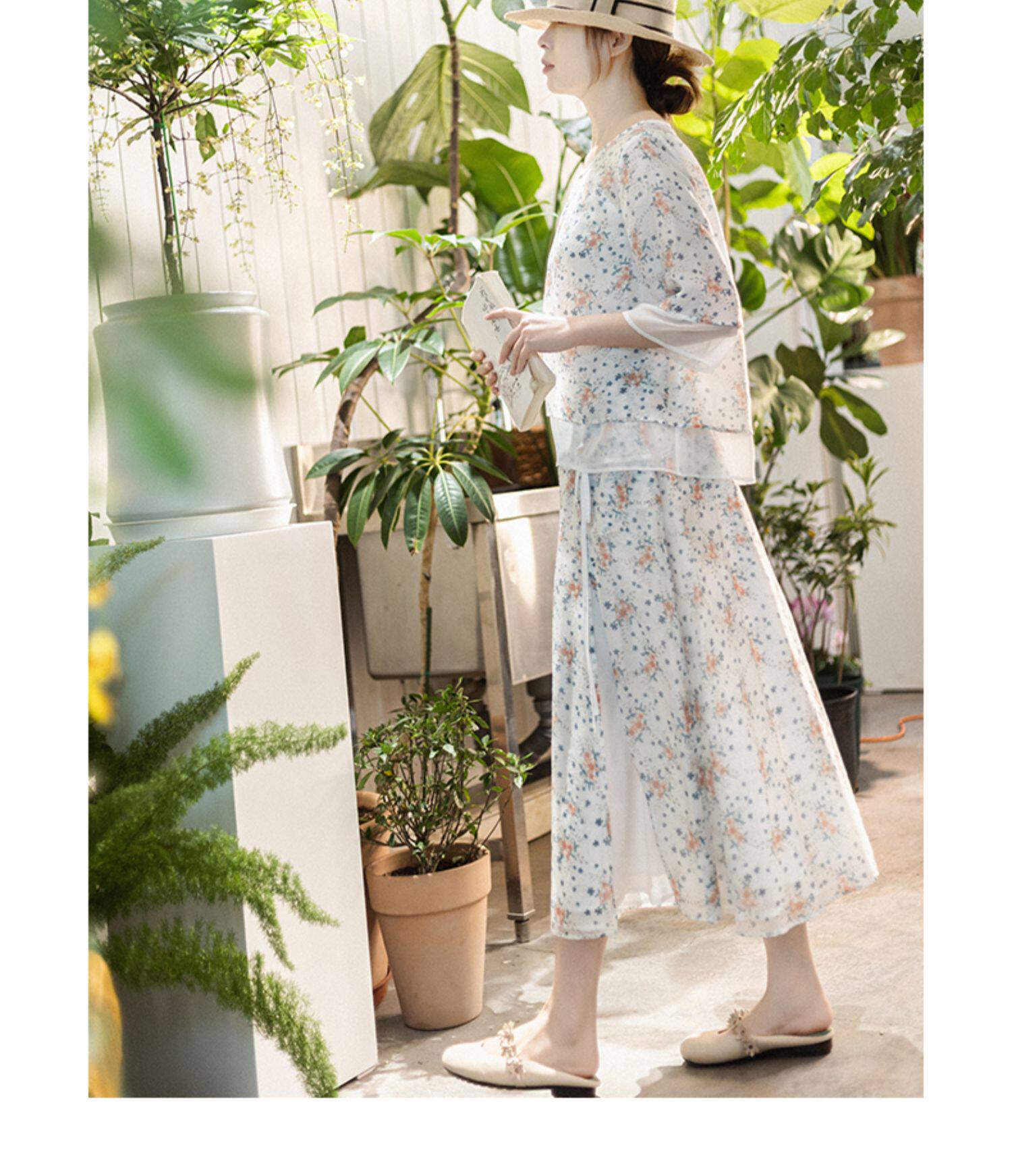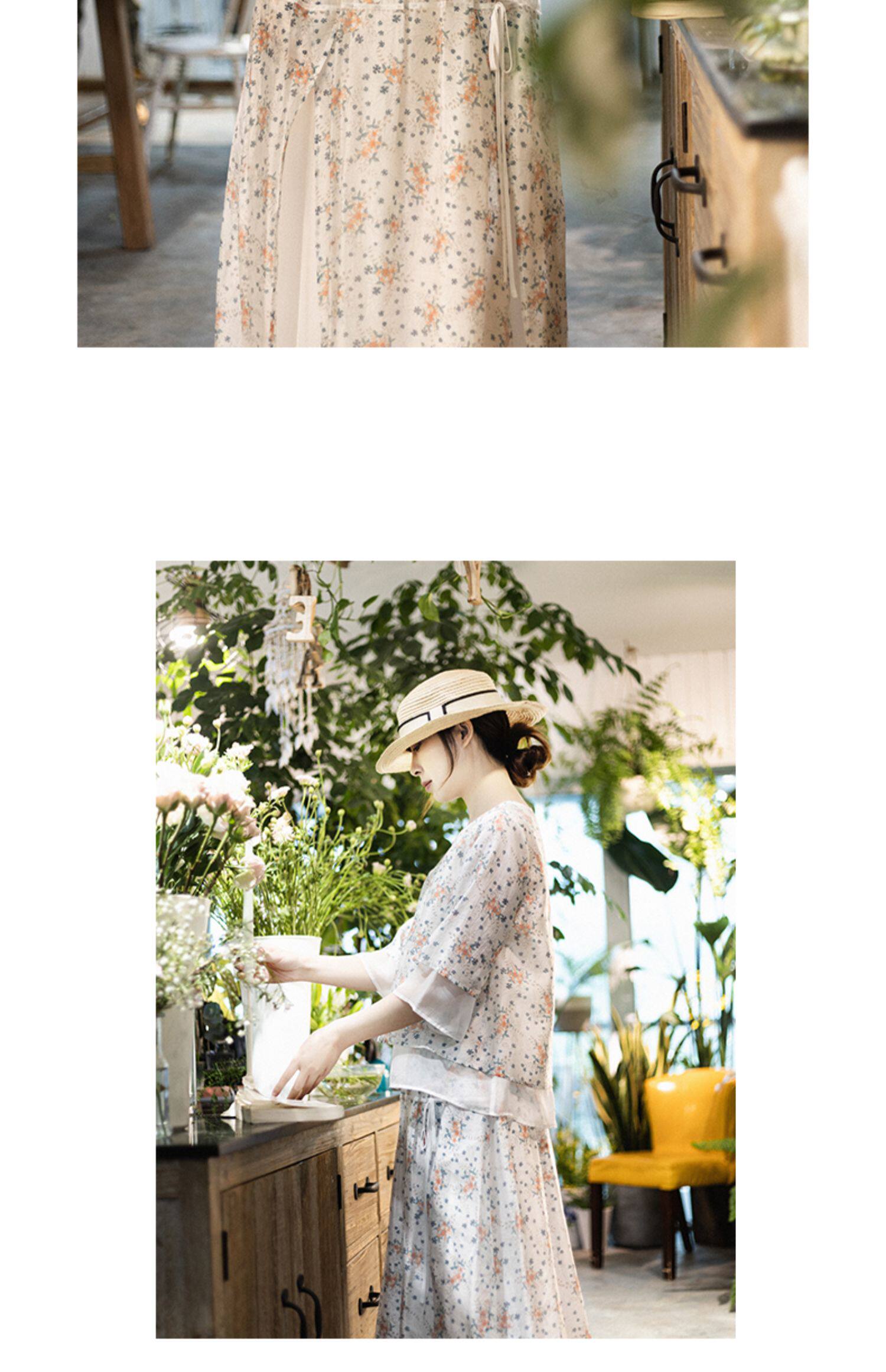 Готовый запас [Туманная Цветочная Комната] Топ с имитацией тенселя для женщин, летний новый костюм с юбкой А-силуэта с круглым вырезом и косой планкой