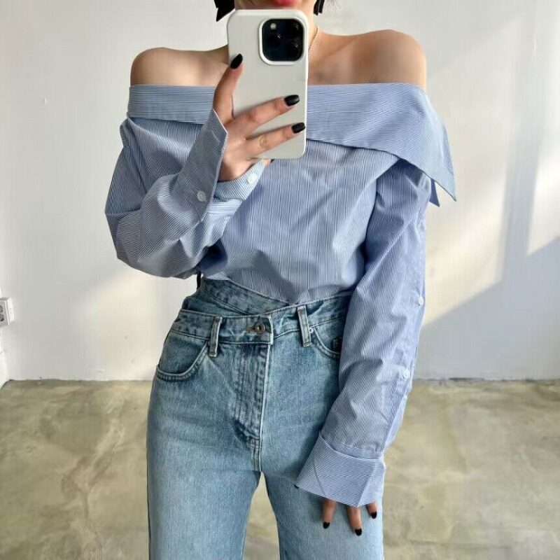 Сексуальная весенняя модная рубашка, в корейском стиле, открытые плечи и длинный рукав