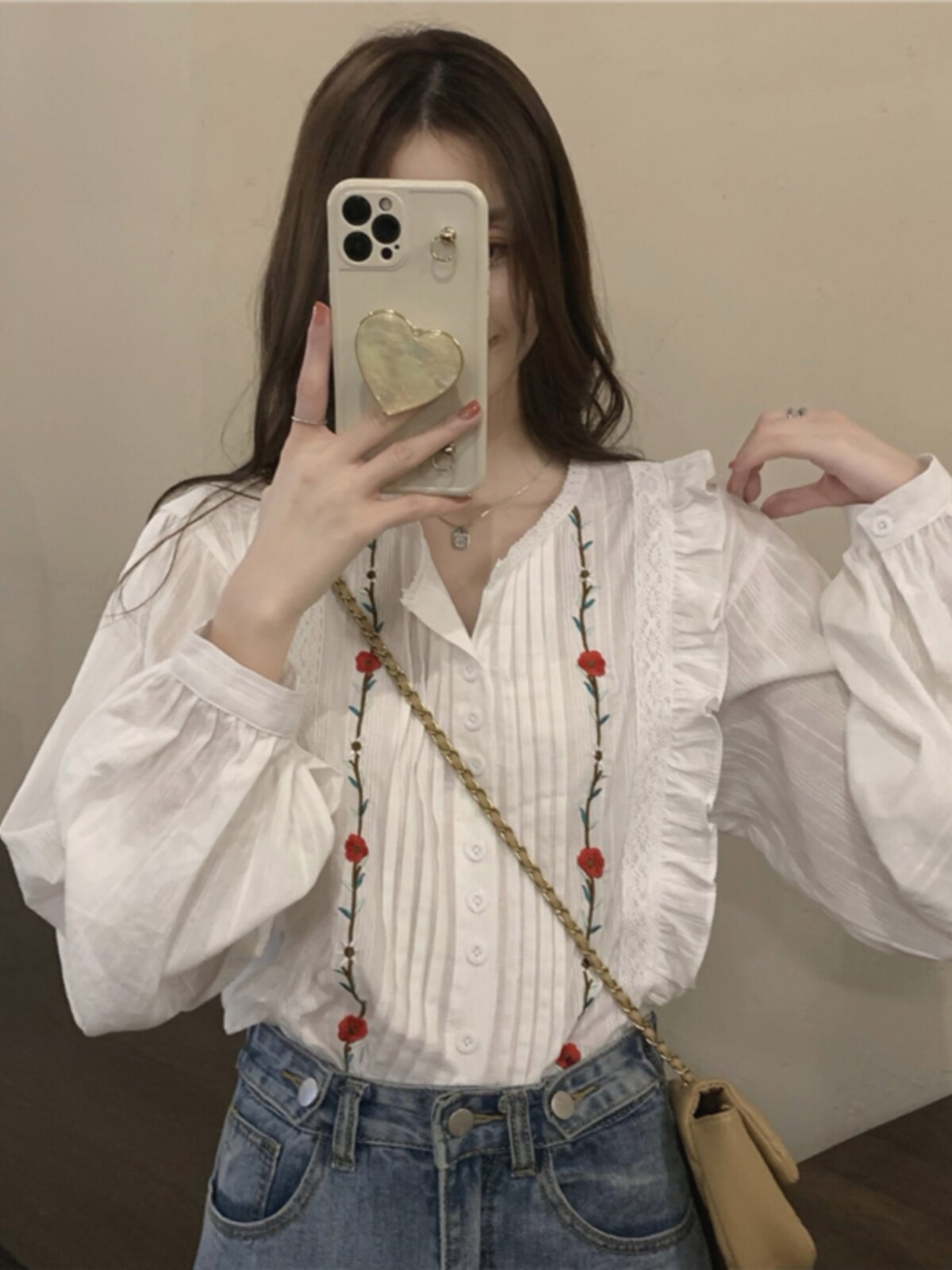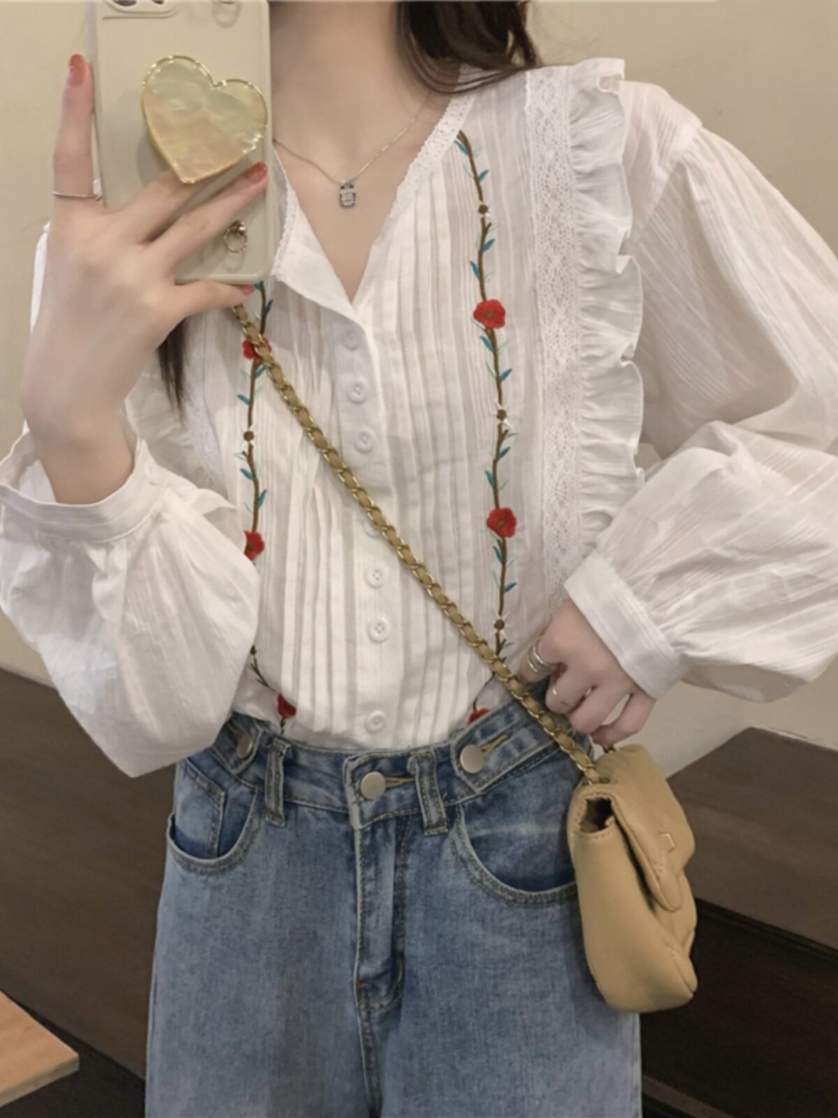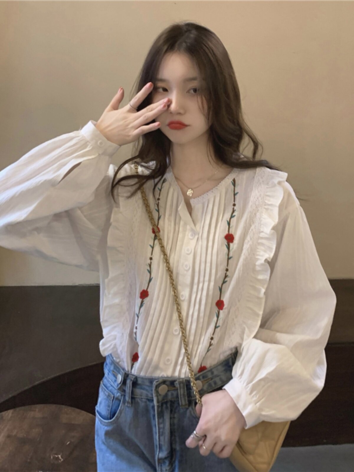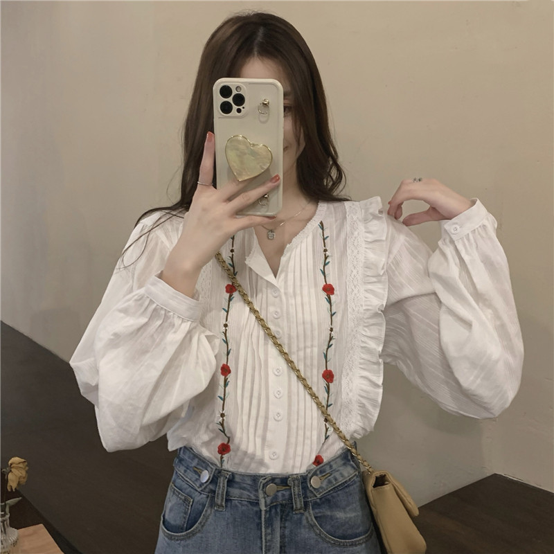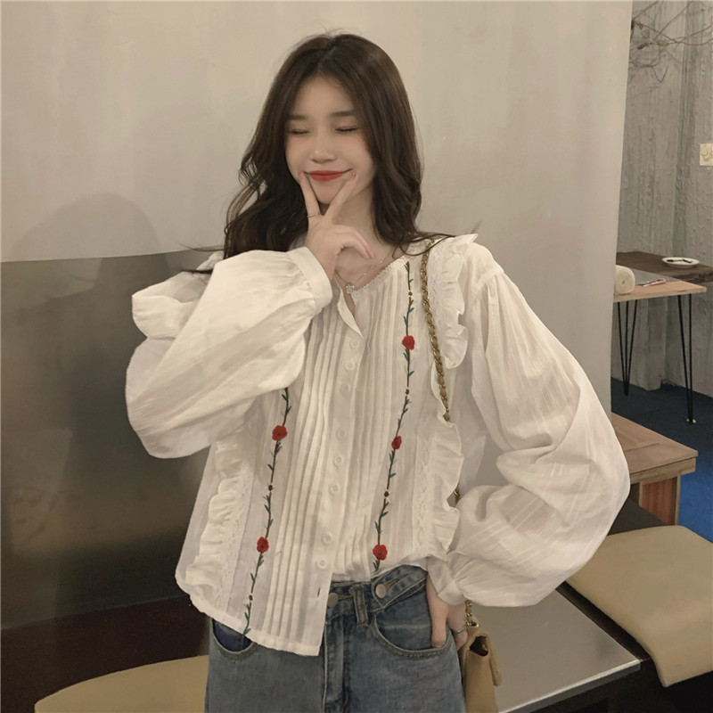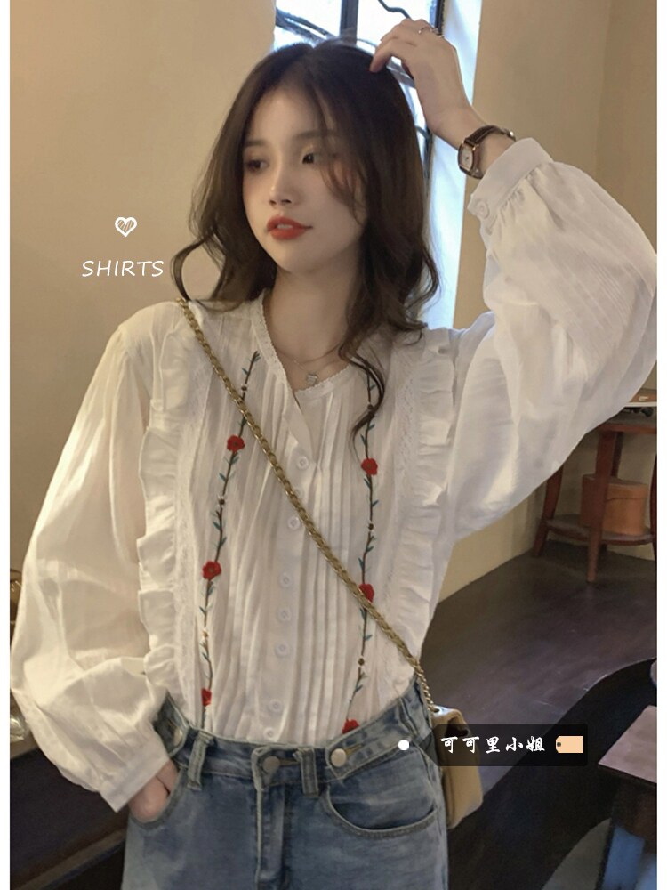 Осенняя рубашка, дизайнерский лонгслив, французский стиль, в цветочек, с вышивкой, в западном стиле, тренд сезона