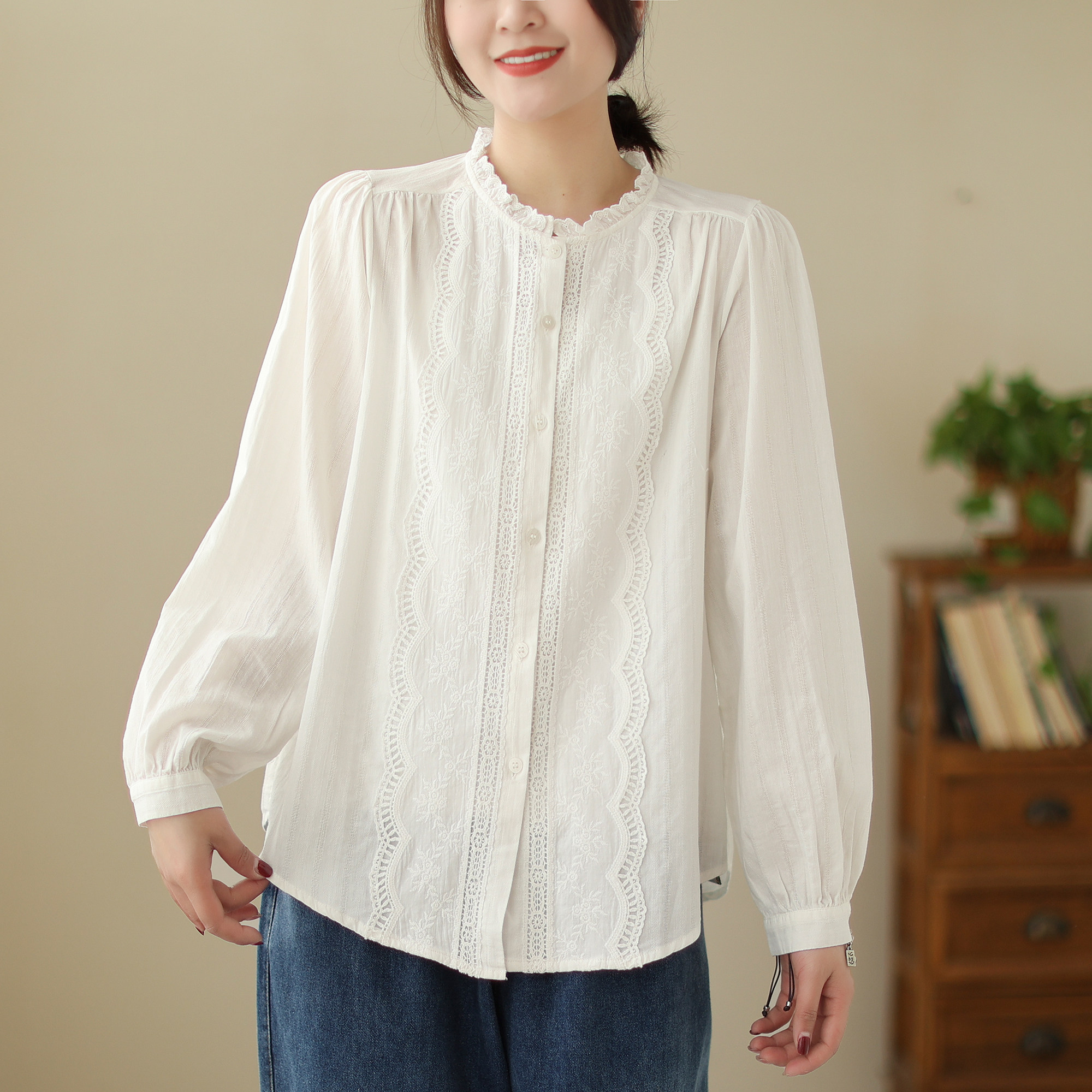 Весенняя японская милая кружевная хлопковая рубашка, лонгслив, 2023, тренд сезона