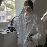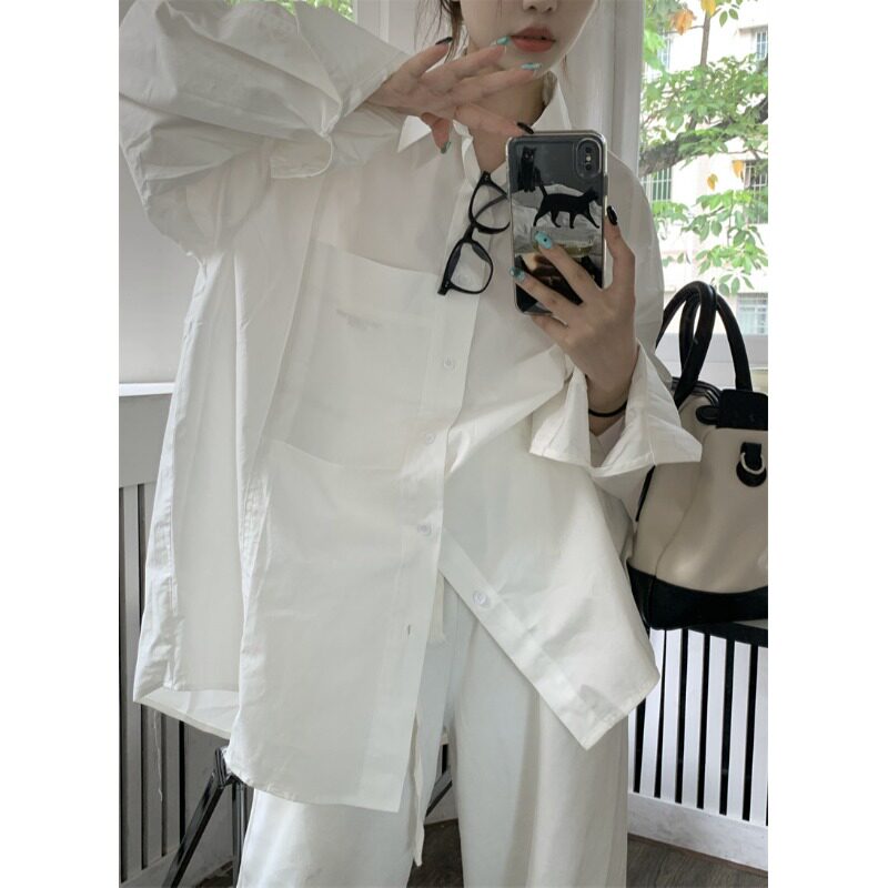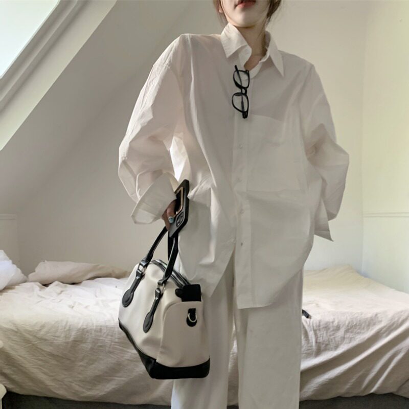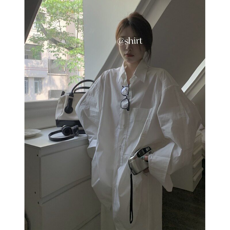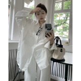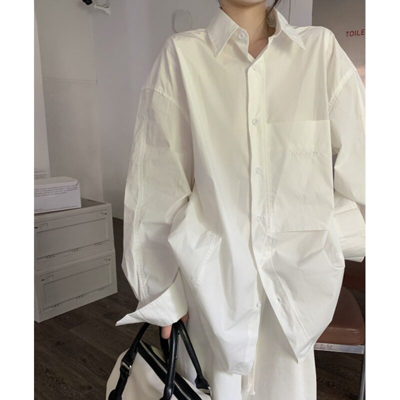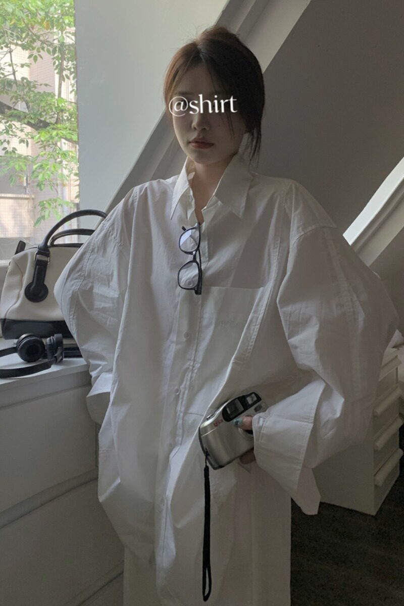 Белая длинная рубашка, в корейском стиле, свободный крой, оверсайз, яркий броский стиль, изысканный стиль, средней длины