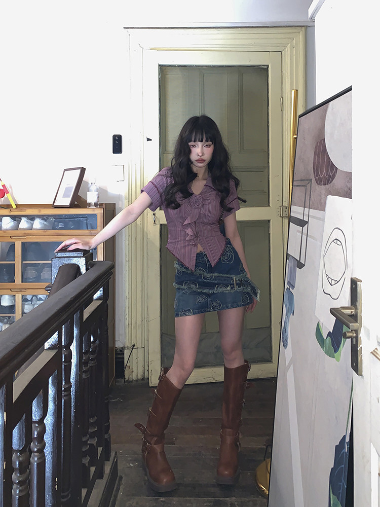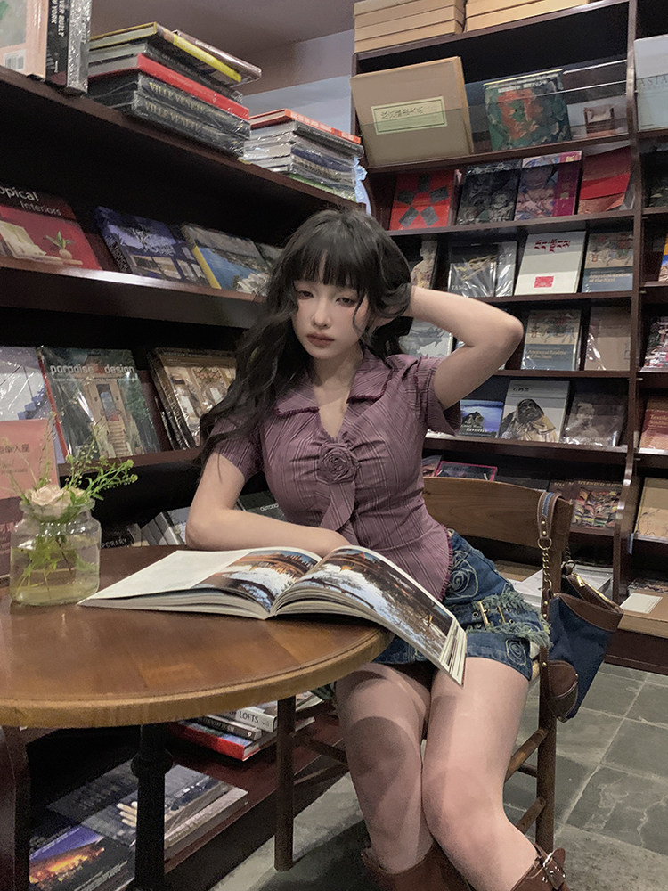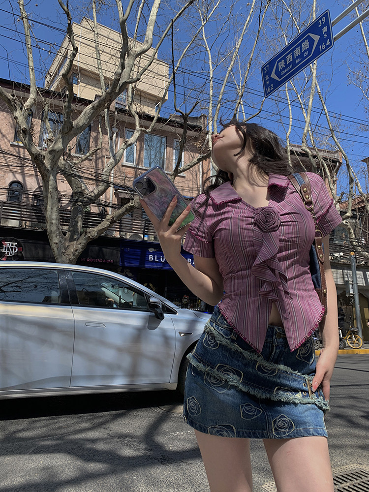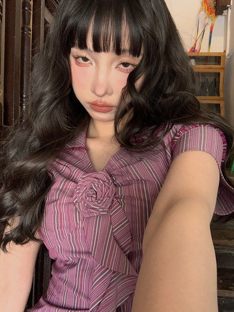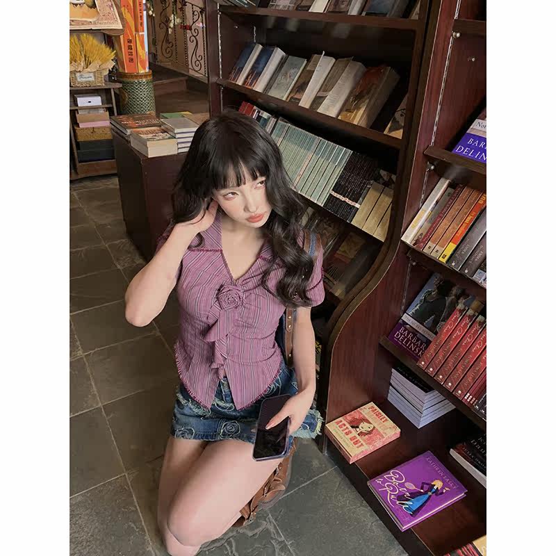 Стол квадратного стола Funnj ◆ Пурпурная ретро-розовая полосатая рубашка с короткими рукавами для женского летнего лучшего верха (отправить в соответствие цветам)
