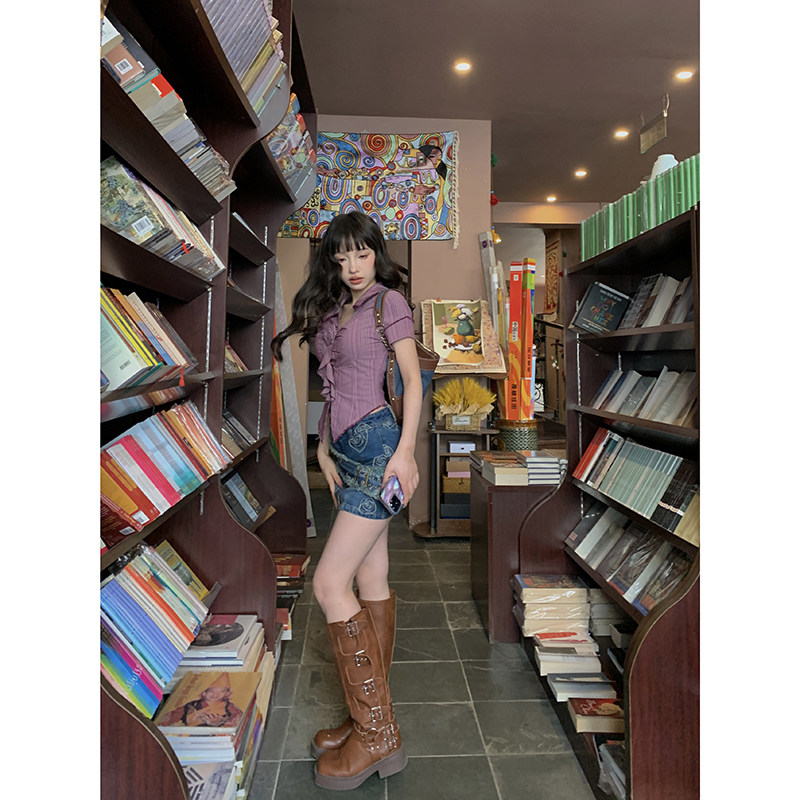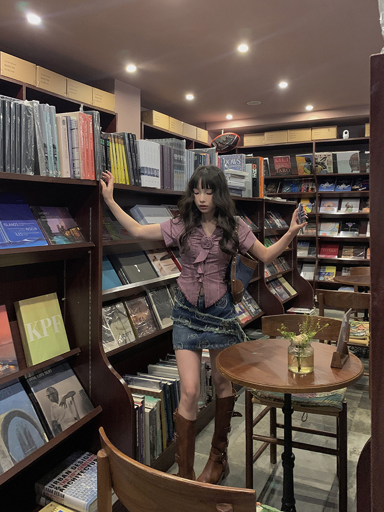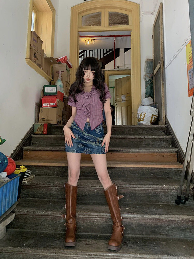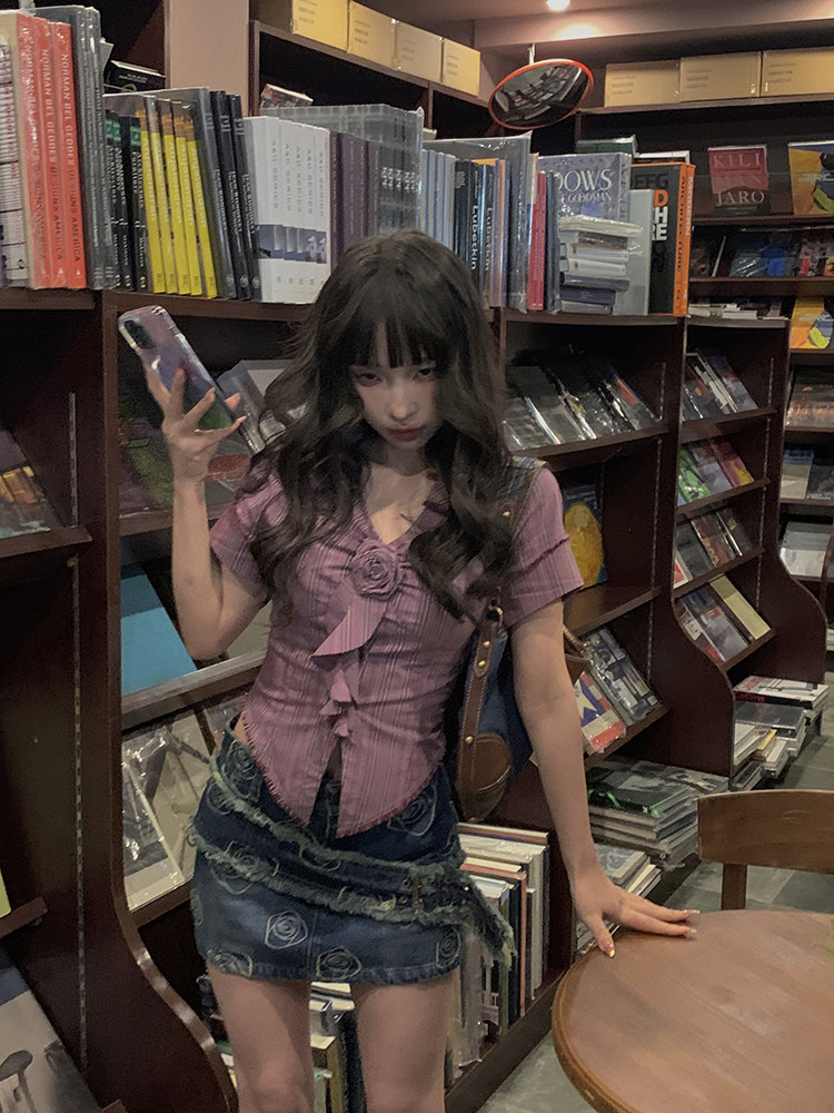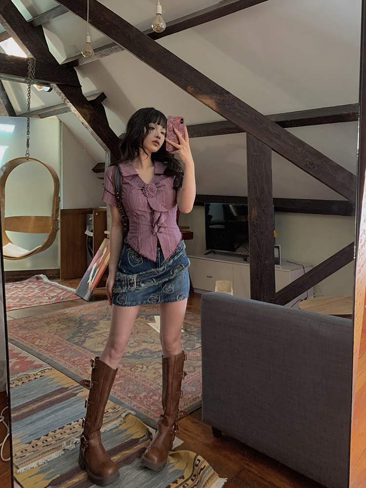 Стол квадратного стола Funnj ◆ Пурпурная ретро-розовая полосатая рубашка с короткими рукавами для женского летнего лучшего верха (отправить в соответствие цветам)