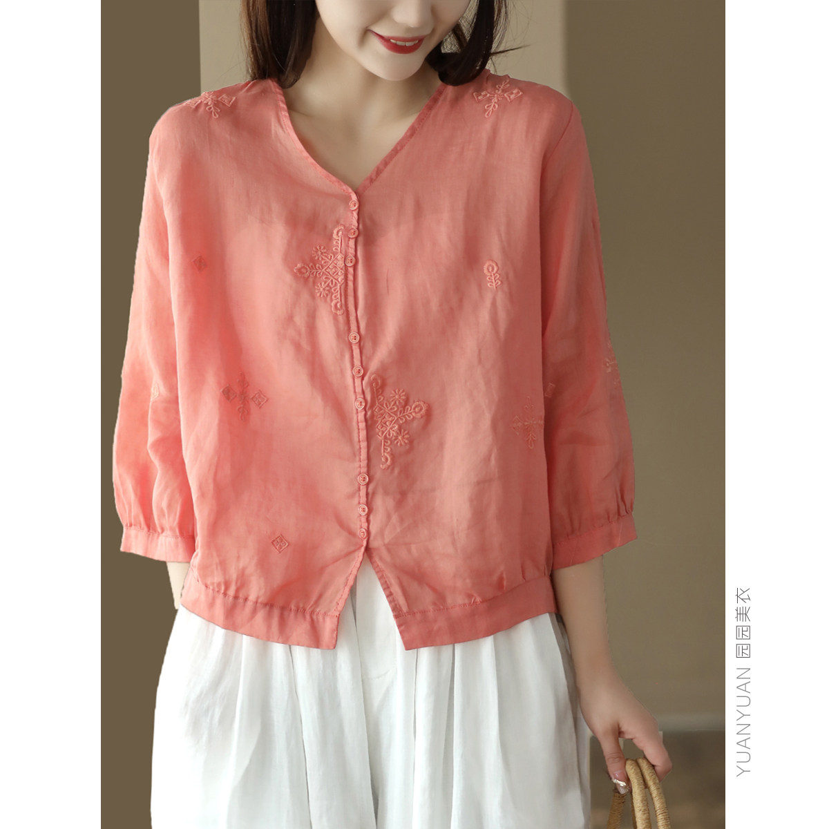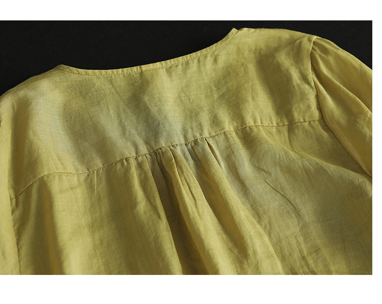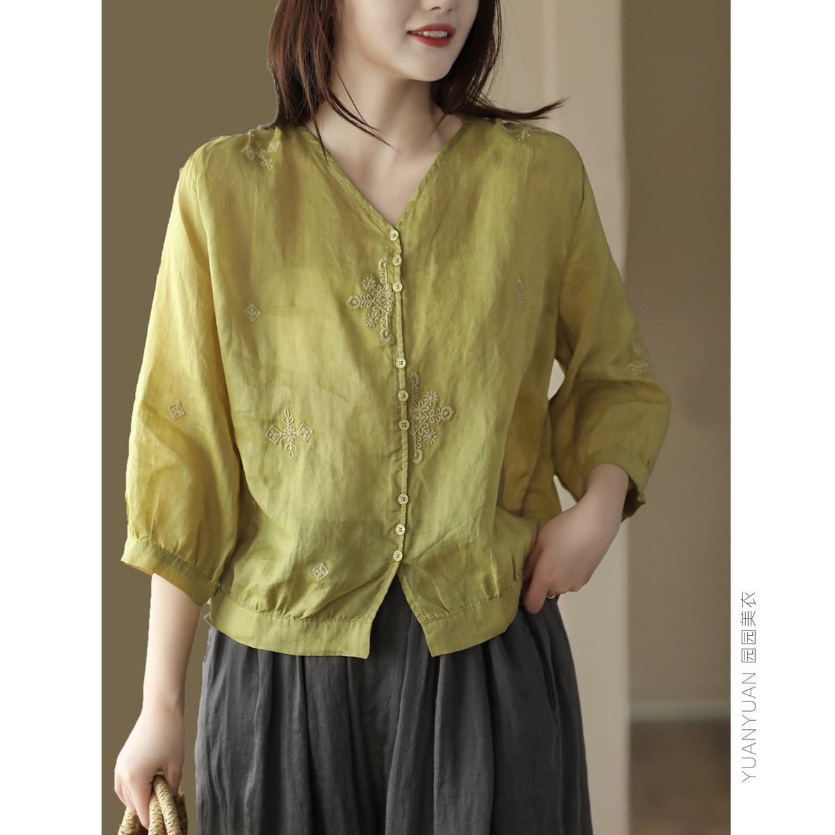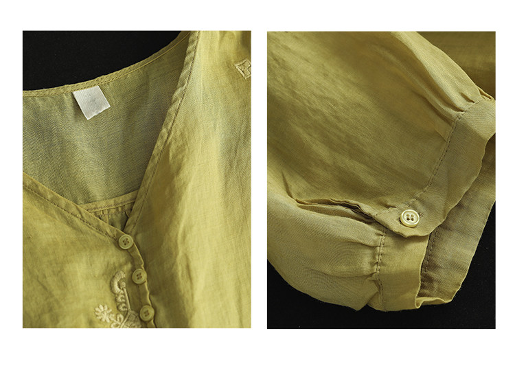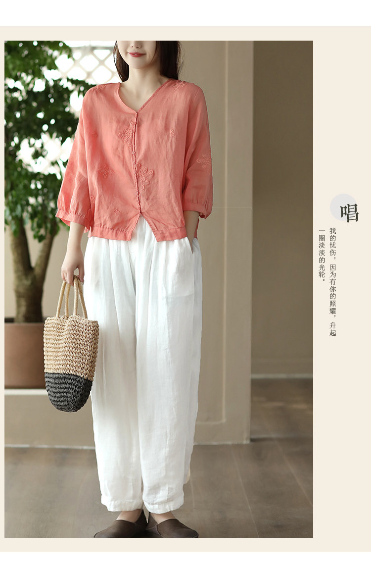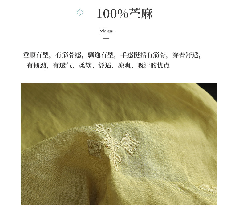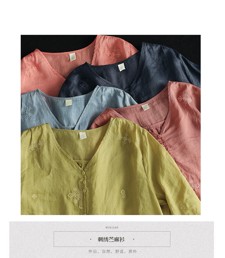 Yuanyuan Meiyi Новая тяжелая промышленная вышиваемая рубашка 100% рубашка Ramie V-образное выстрел Тонкий верхний лето