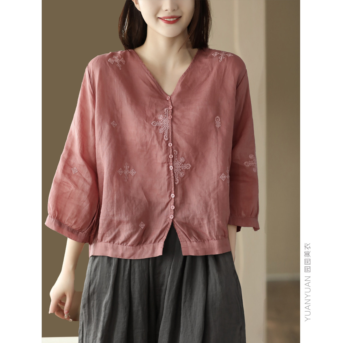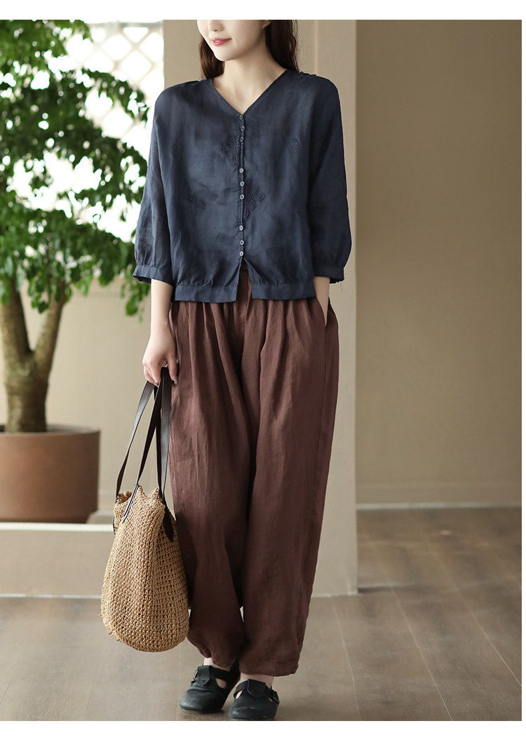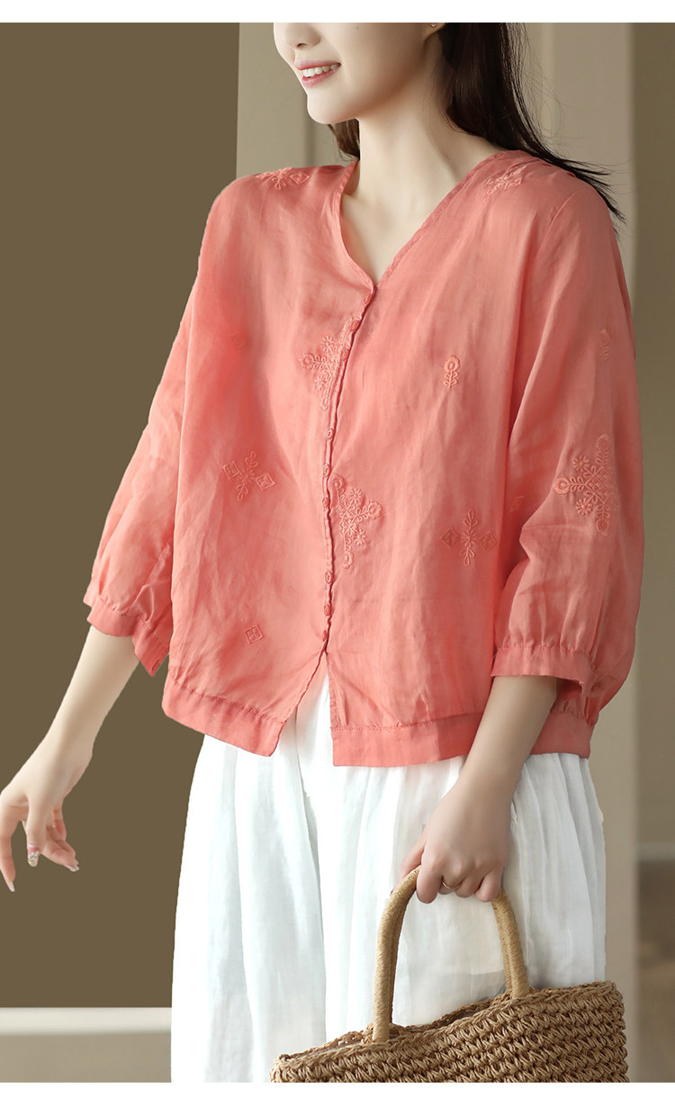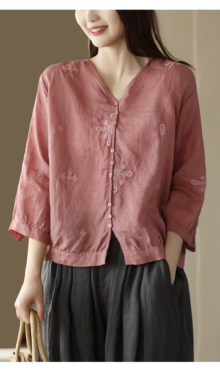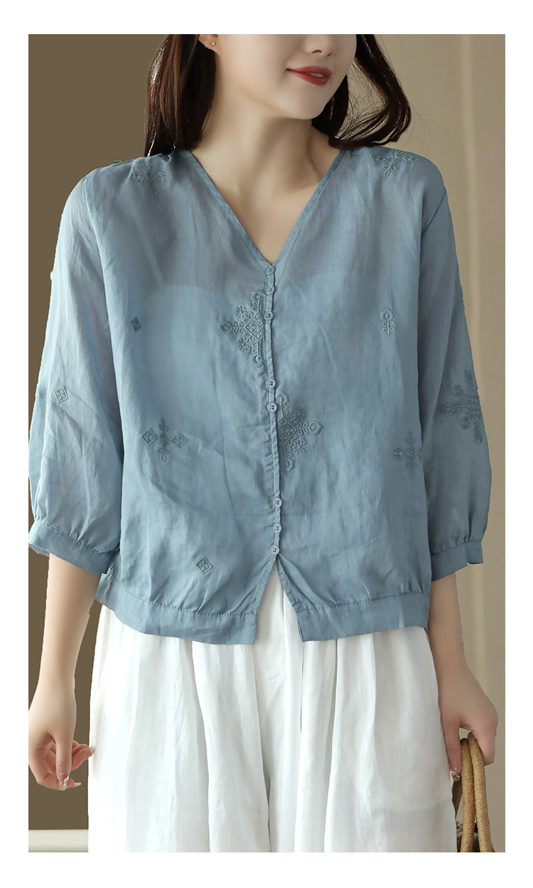 Yuanyuan Meiyi Новая тяжелая промышленная вышиваемая рубашка 100% рубашка Ramie V-образное выстрел Тонкий верхний лето