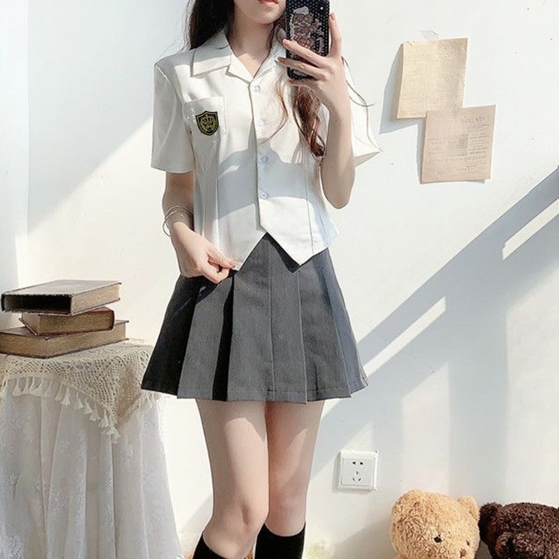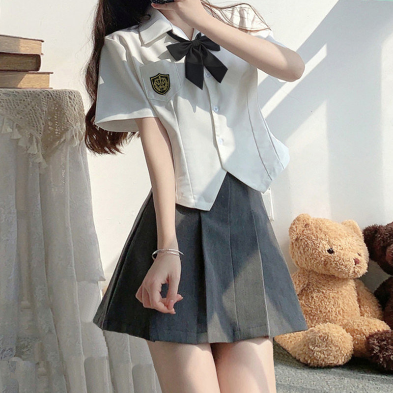 Оригинальная рубашка, короткий корсет, галстук-бабочка, студенческая юбка в складку, комплект, короткий рукав