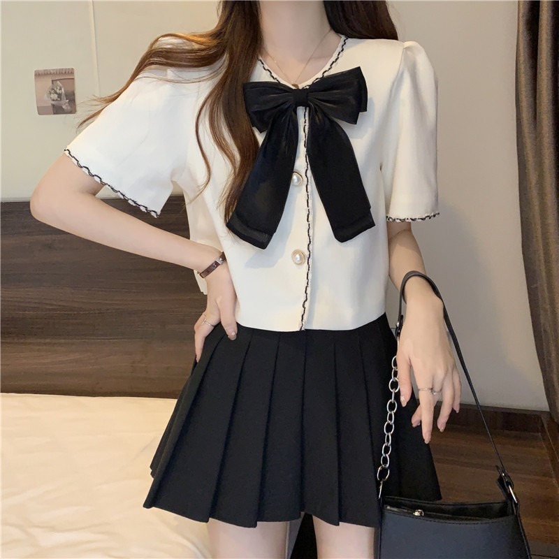 Короткая дизайнерская рубашка с бантиком, большой размер, французский стиль, в стиле Шанель, тренд сезона