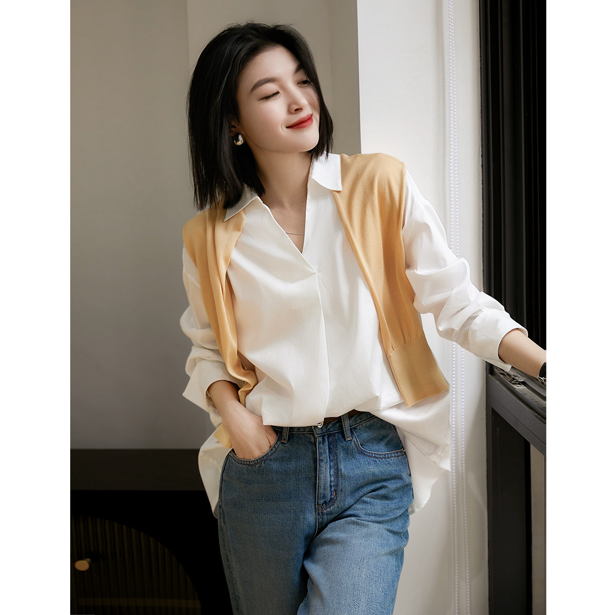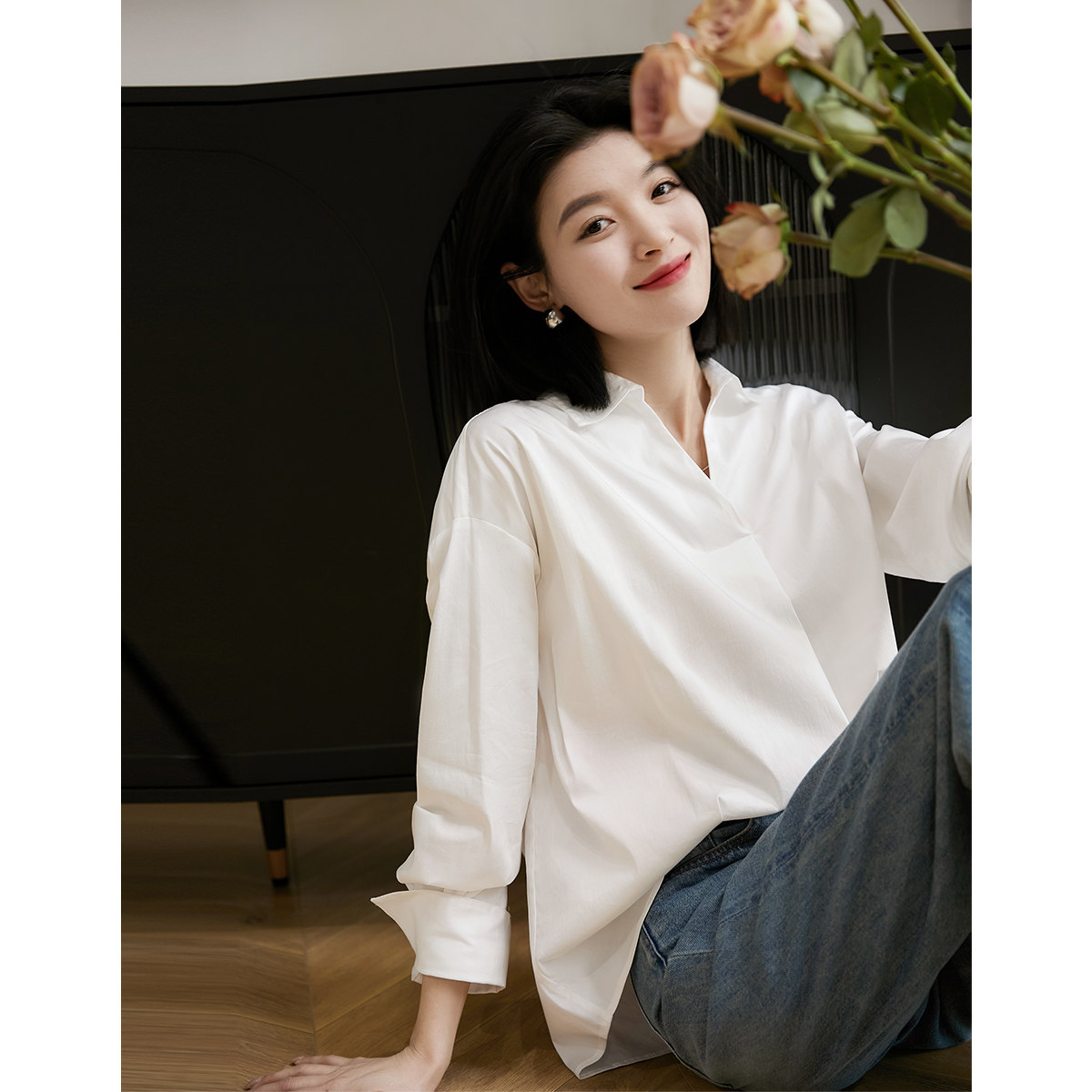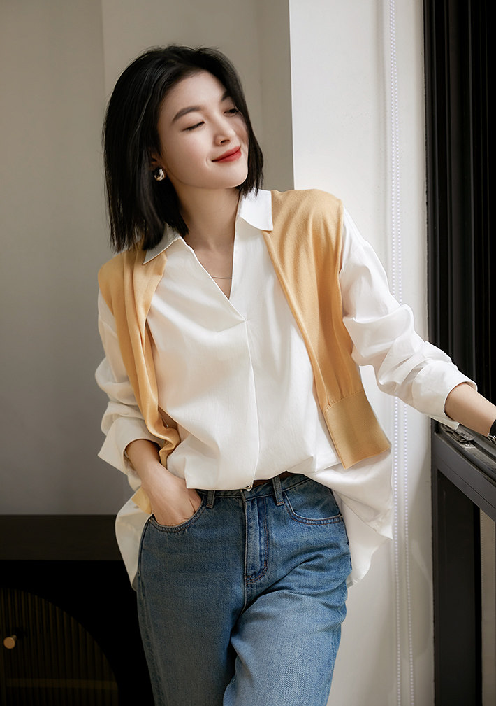 [CIC484611AG] Белые рубашки не слишком много!Половина open v -neck хлопковая рубашка