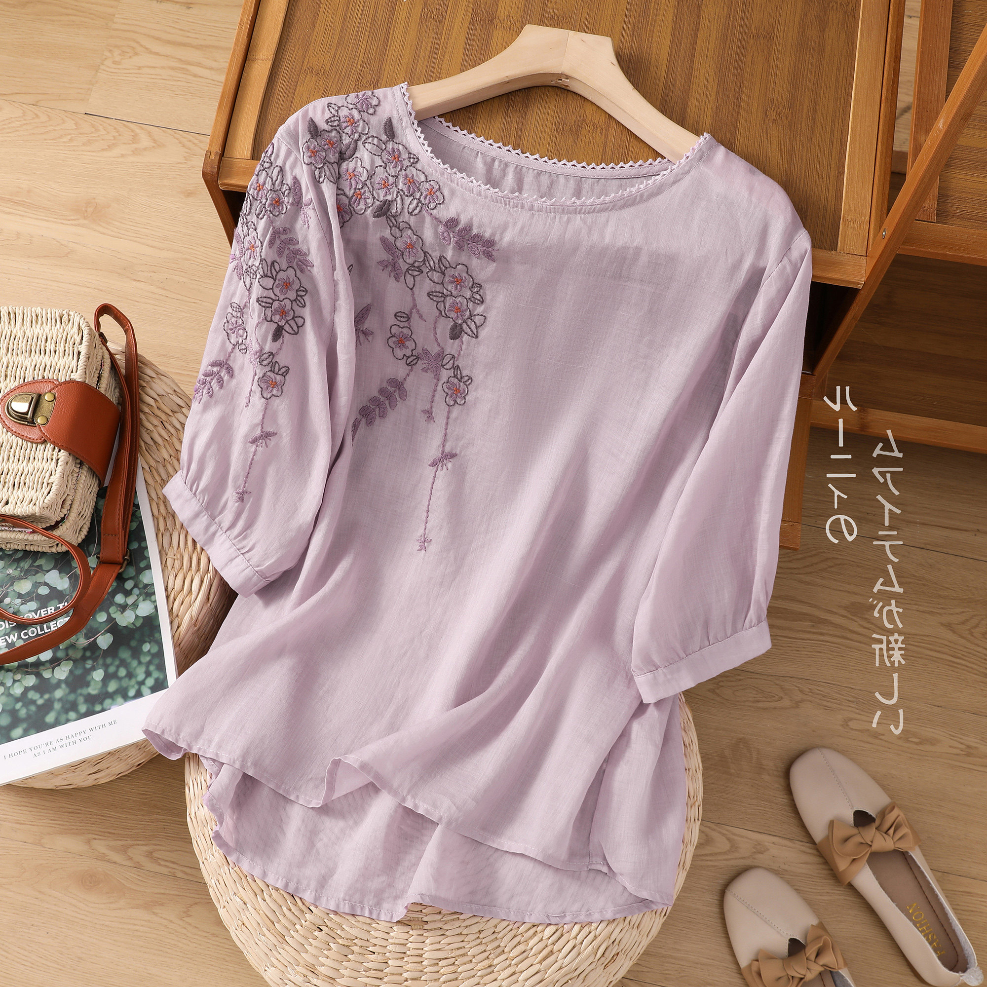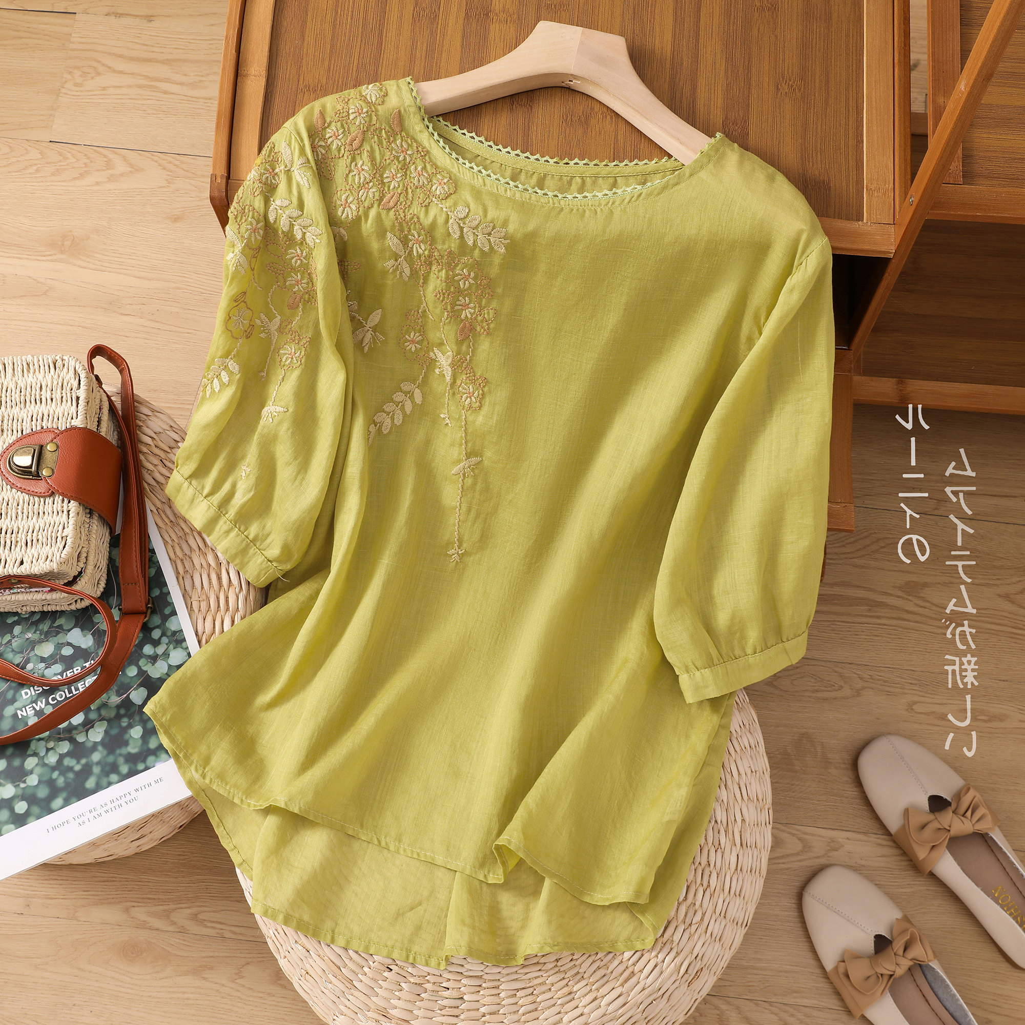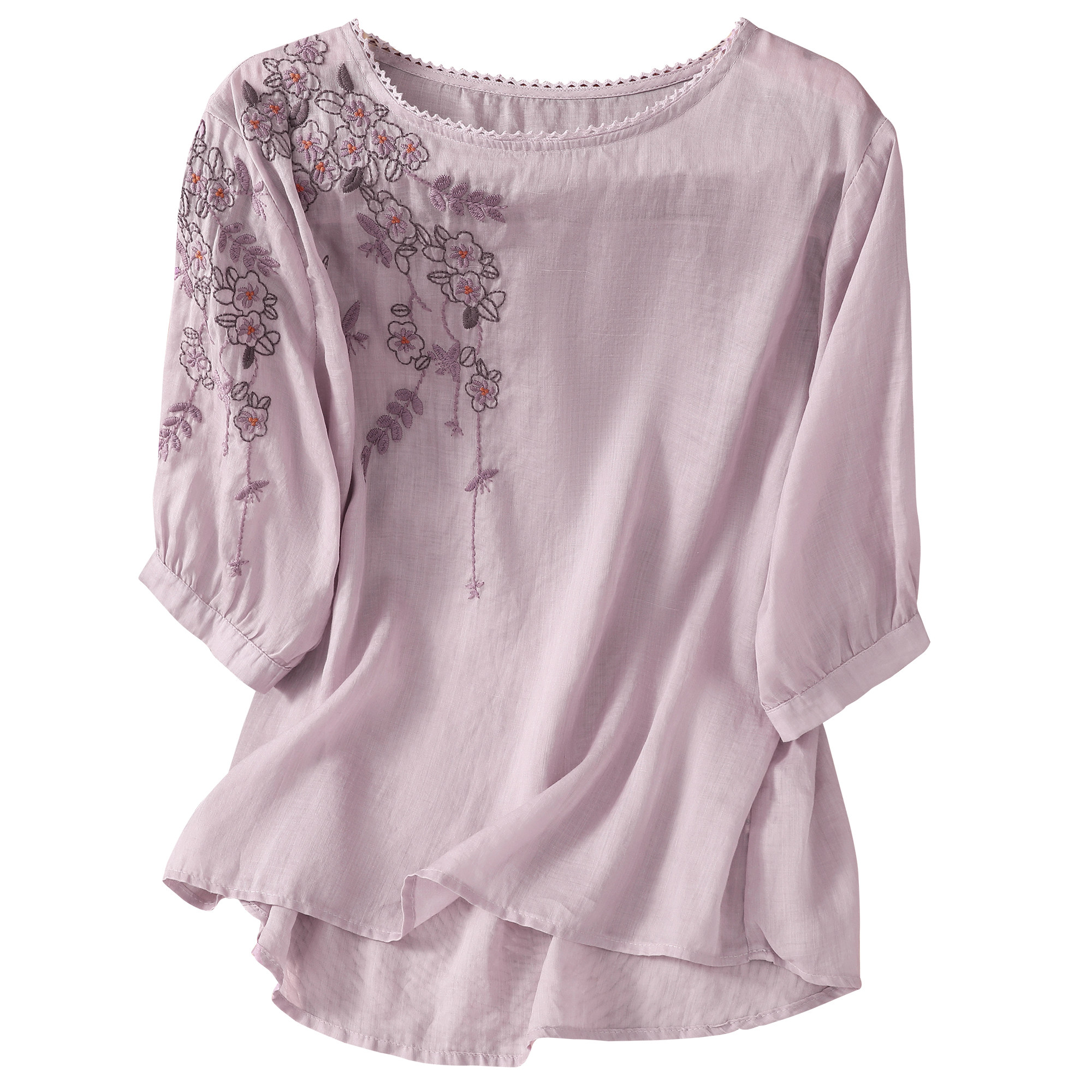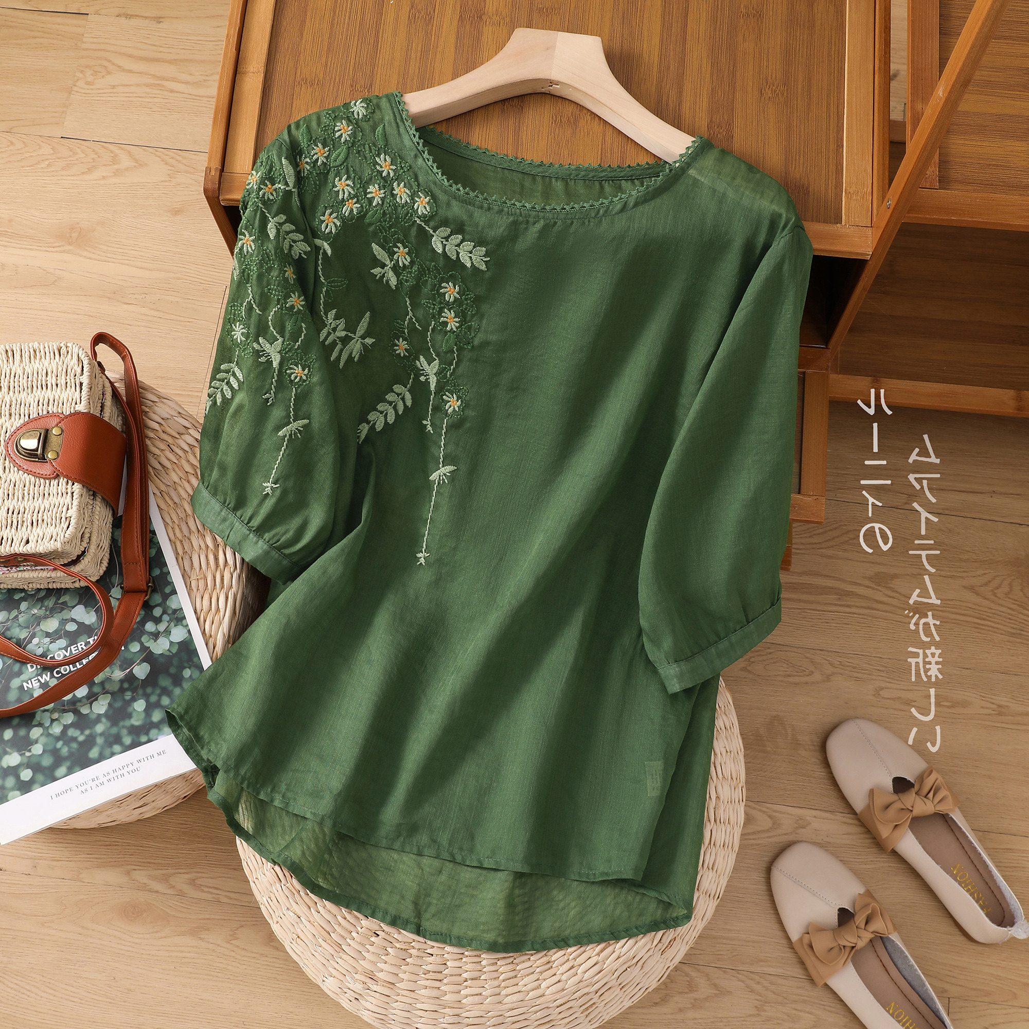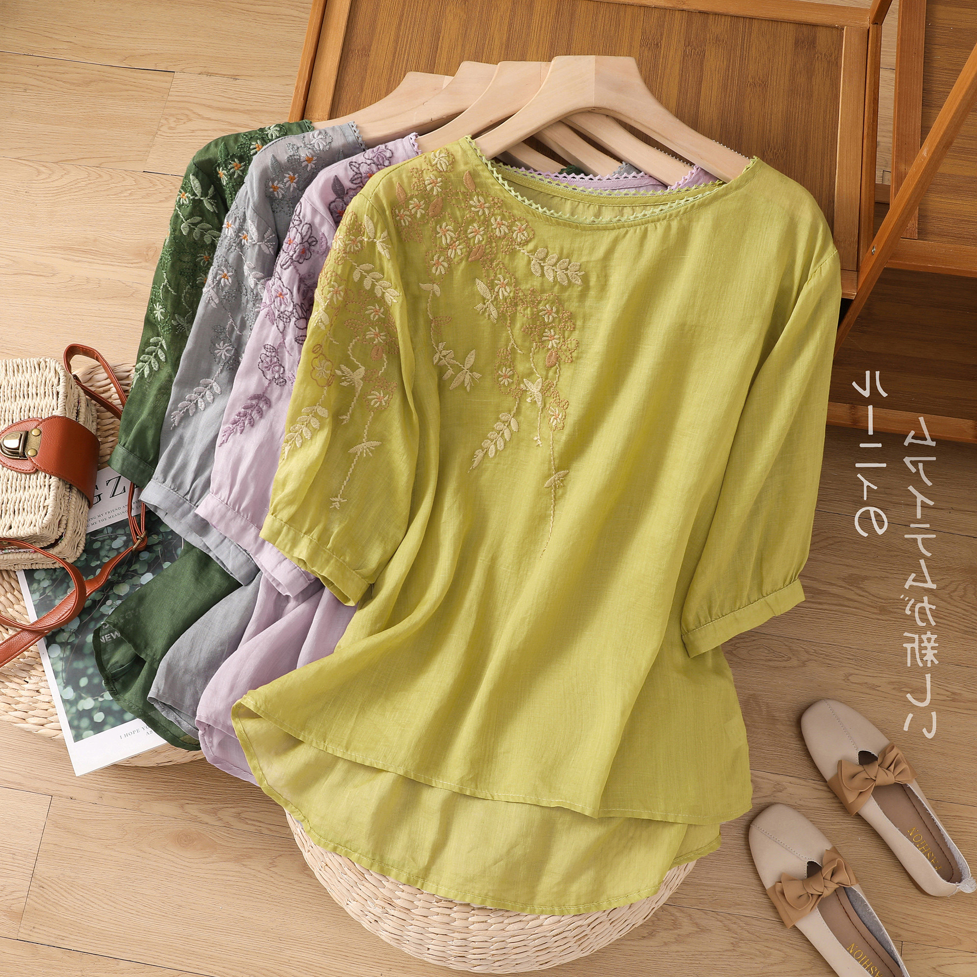 Летняя тонкая цветная футболка с коротким рукавом для отдыха, с вышивкой, по фигуре, из хлопка и льна