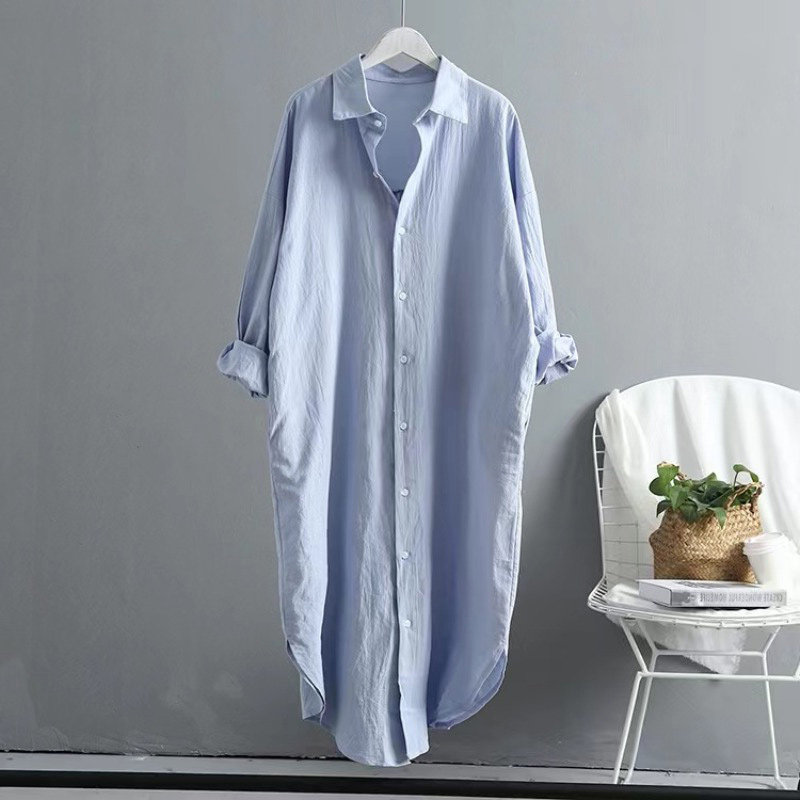 Рубашка, из хлопка и льна, свободный крой, длина миди, защита от солнца