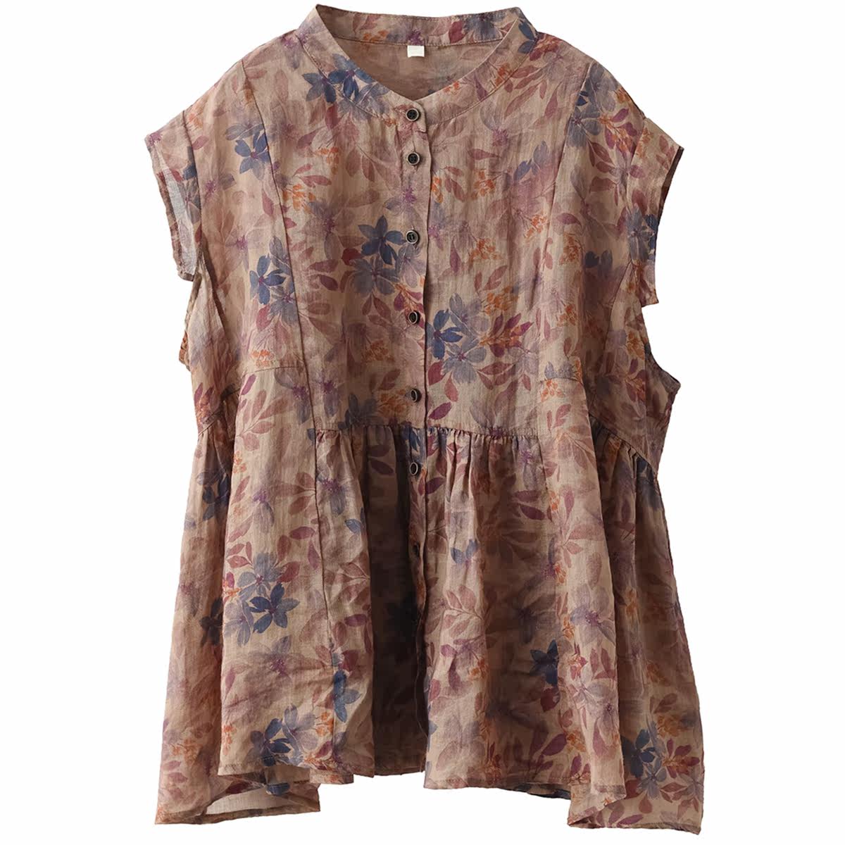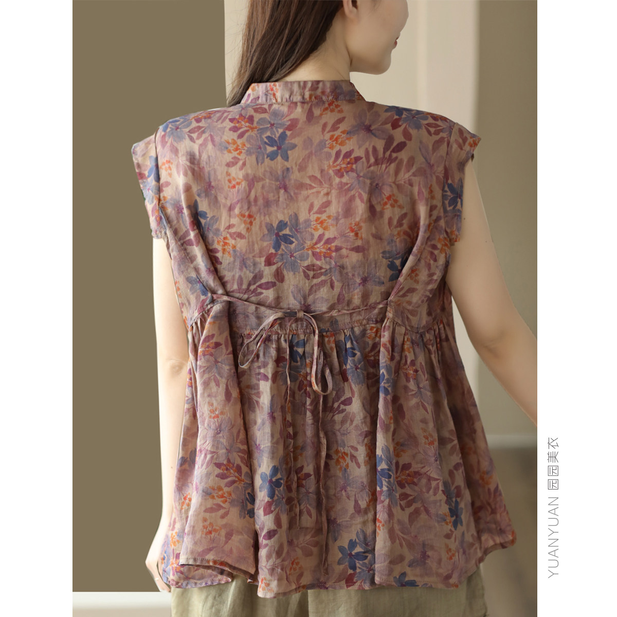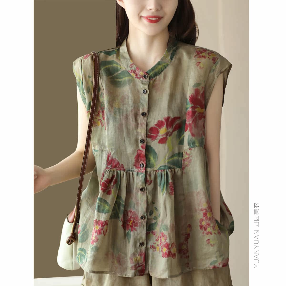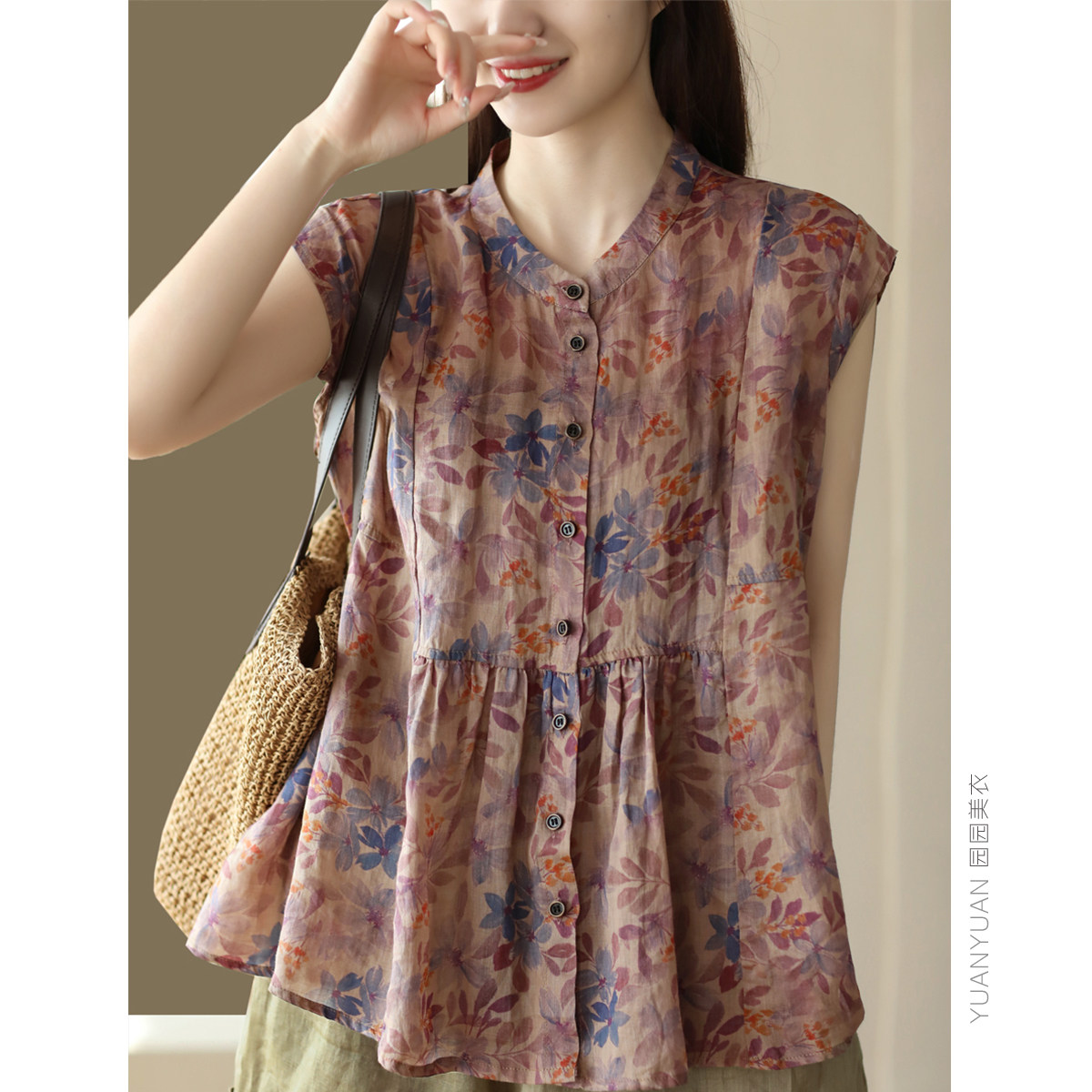 Yuanyuan Meiyi новый ретро-принт 100% рубашка Ramie Women's The Demperament Stand-Up воротник маленький летающий рукав тонкий топ
