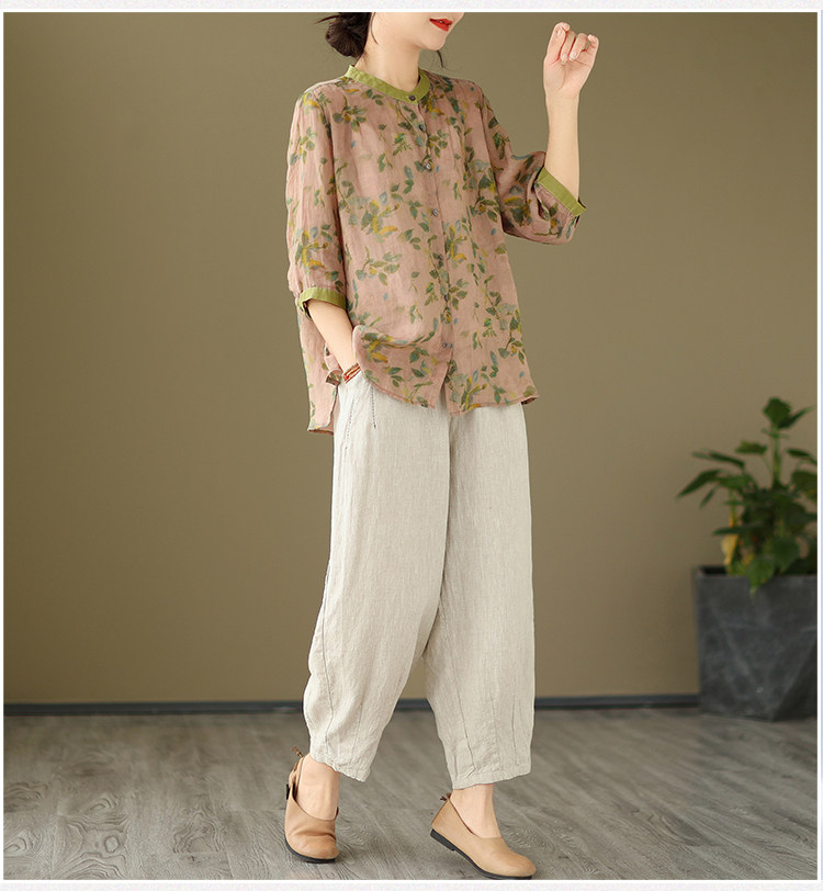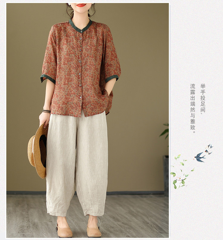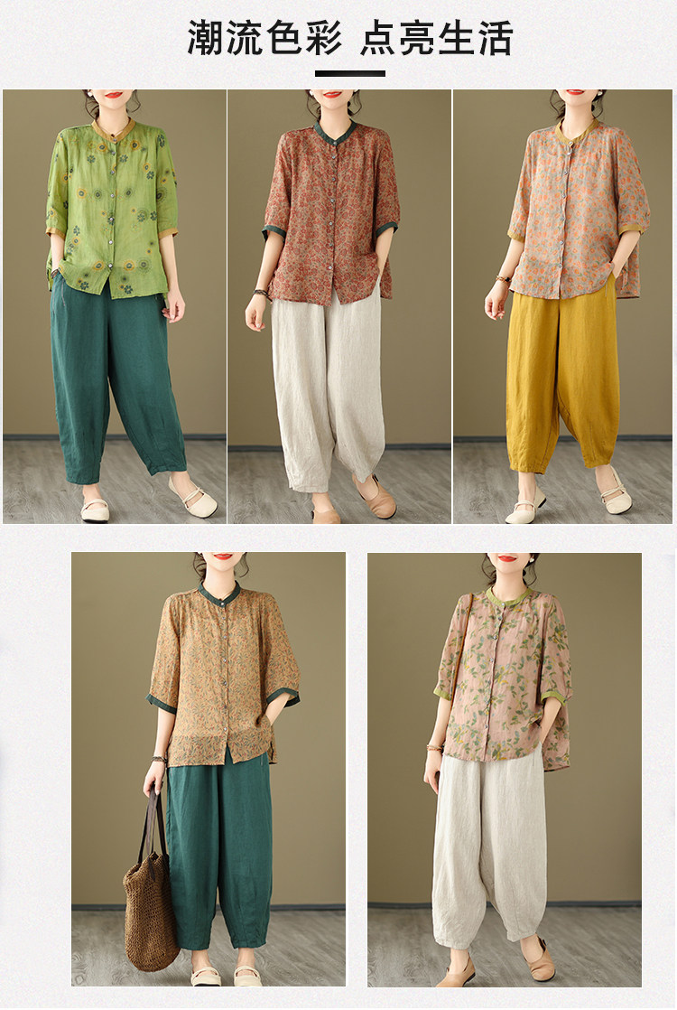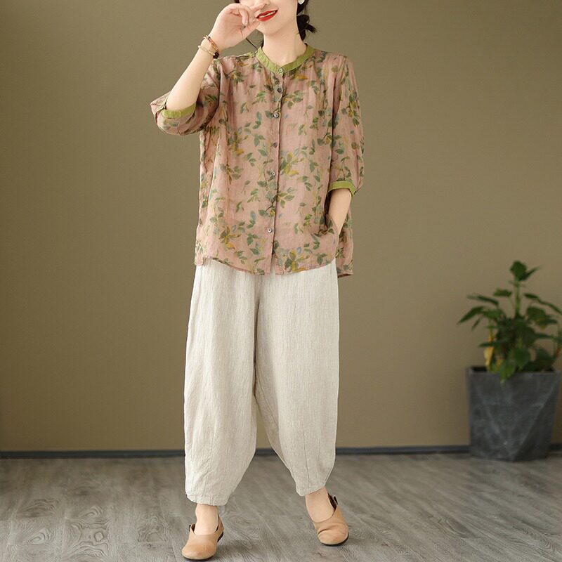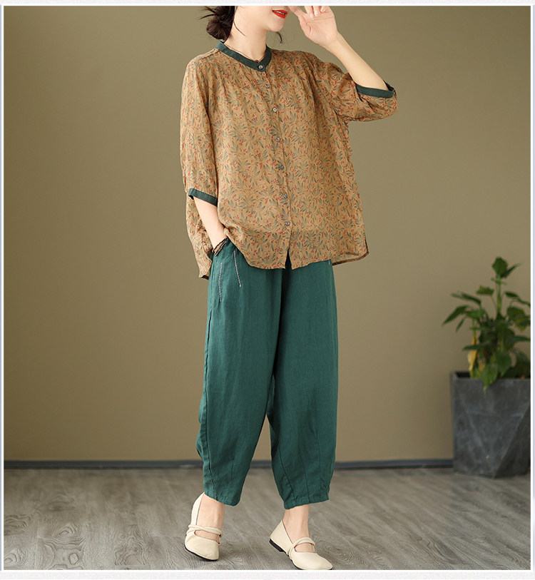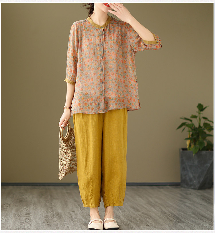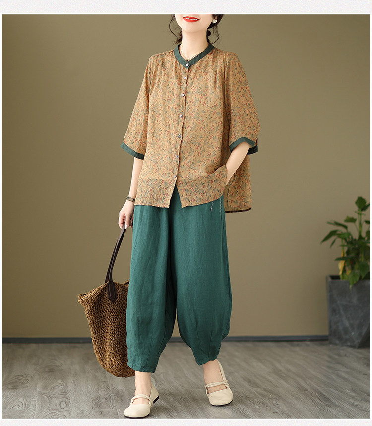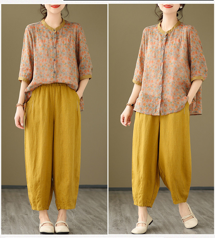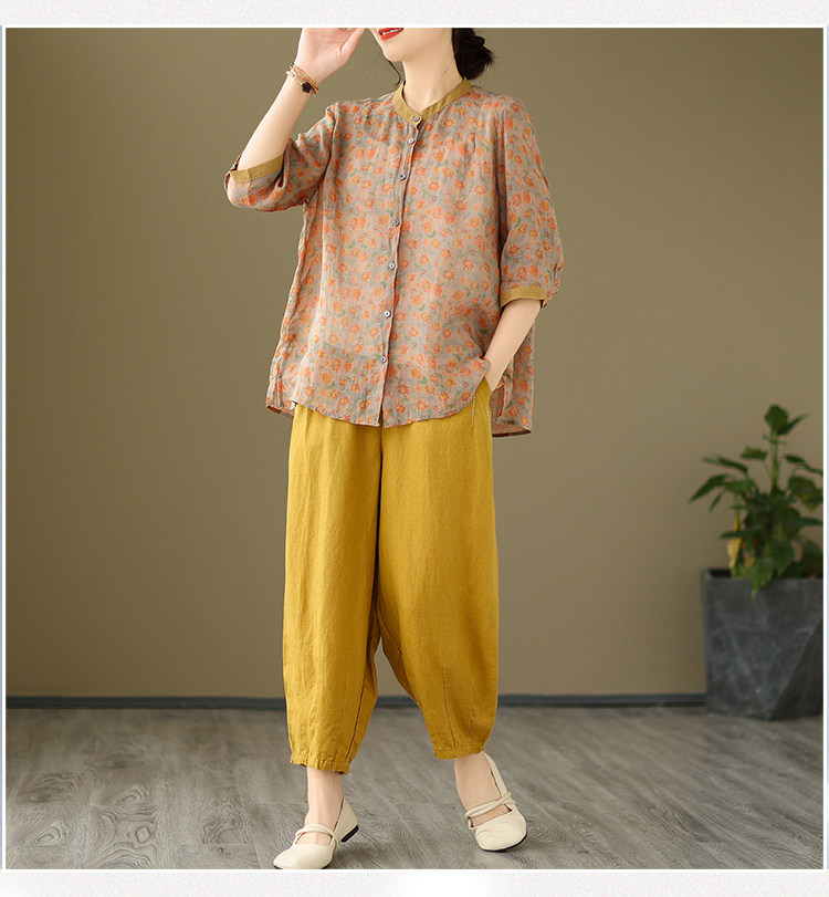 Комплект, рубашка для отдыха, штаны, из хлопка и льна, цветочный принт