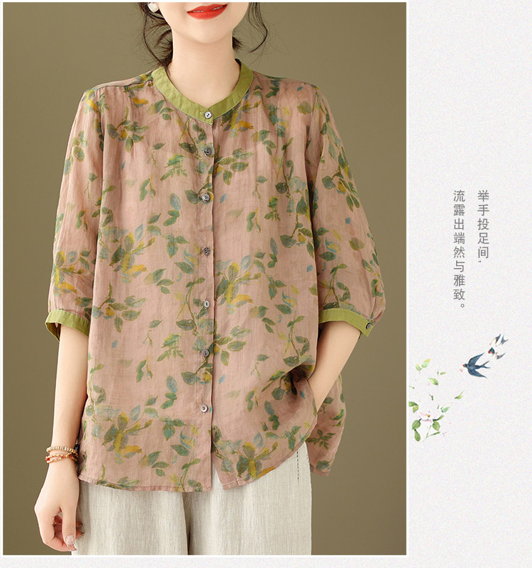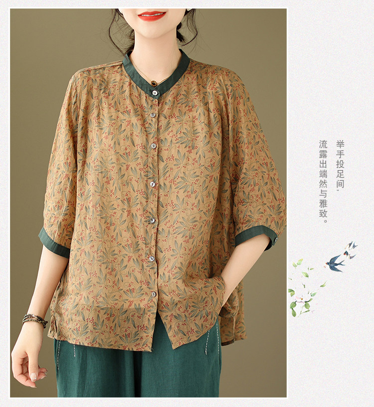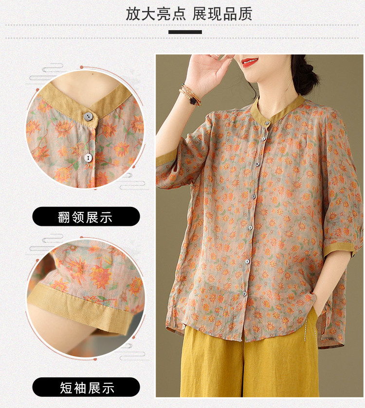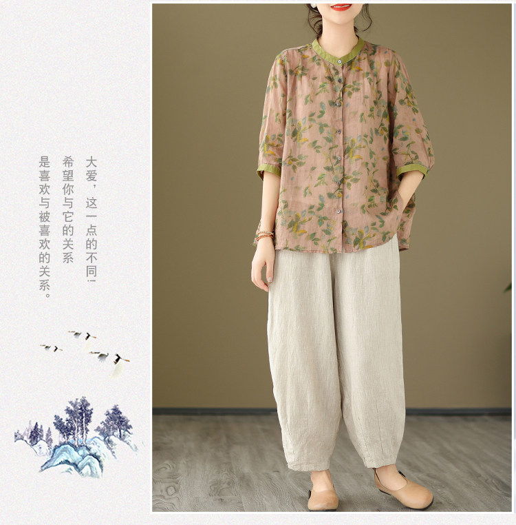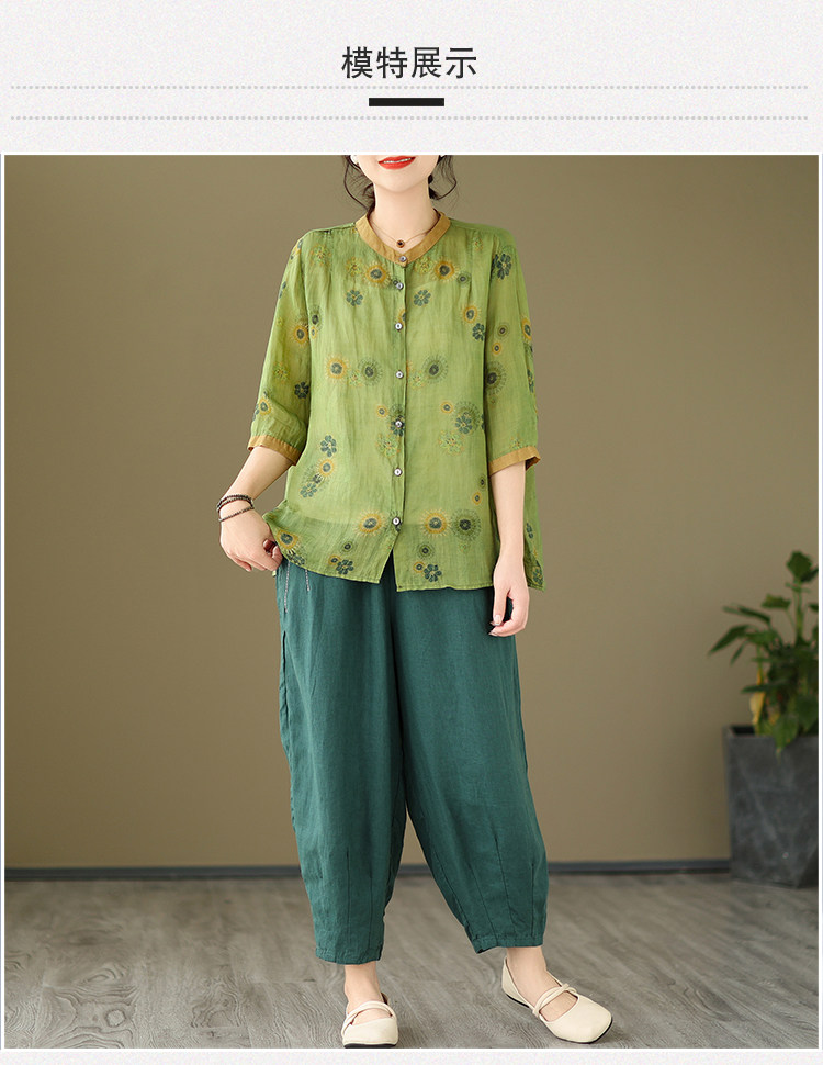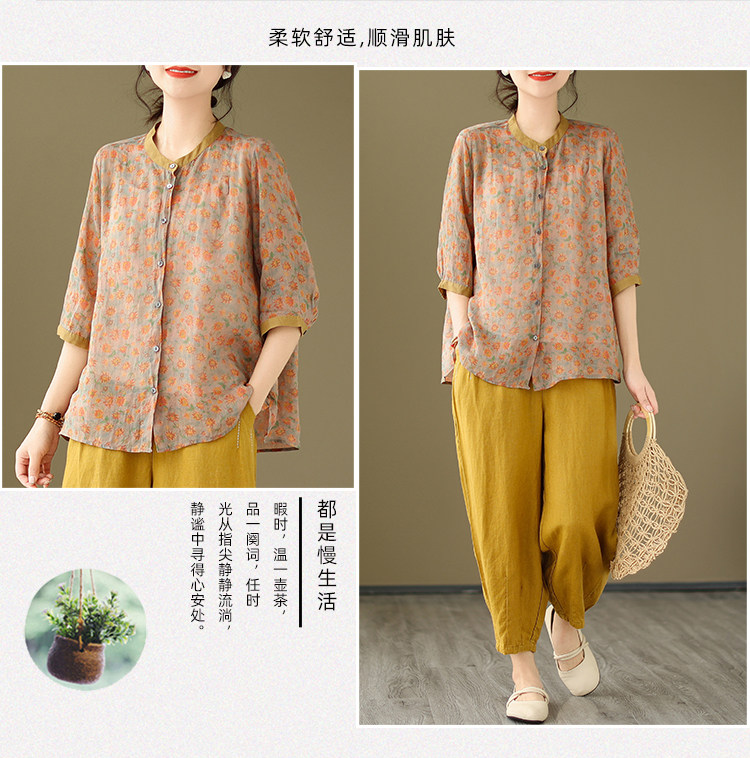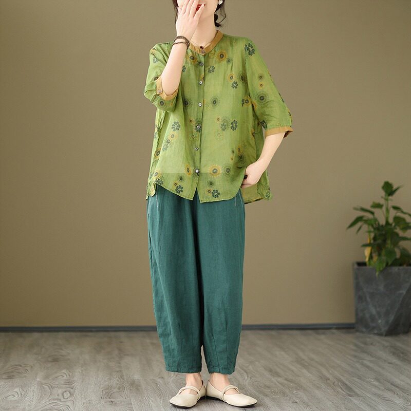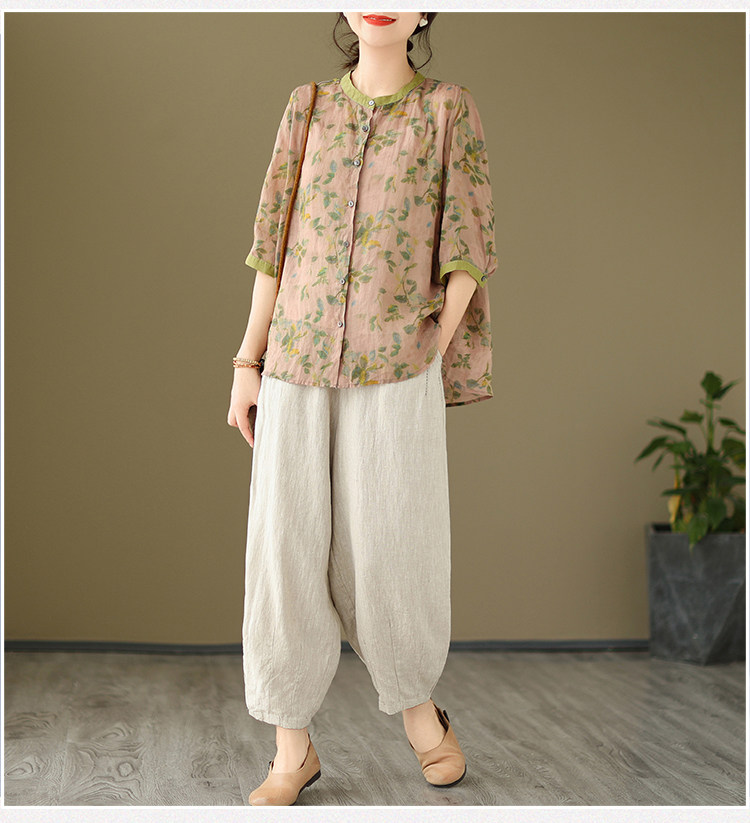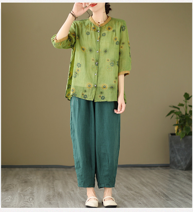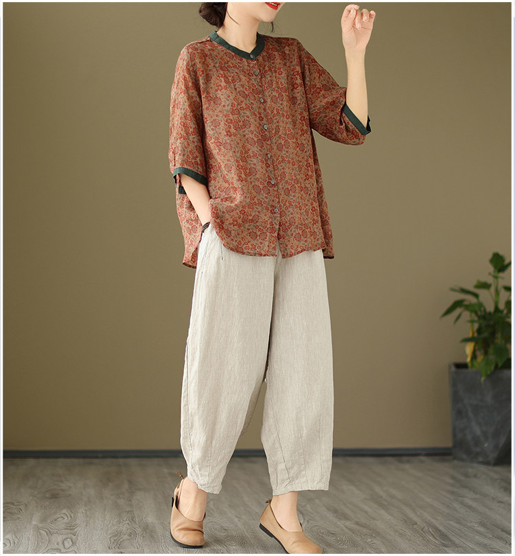 Комплект, рубашка для отдыха, штаны, из хлопка и льна, цветочный принт