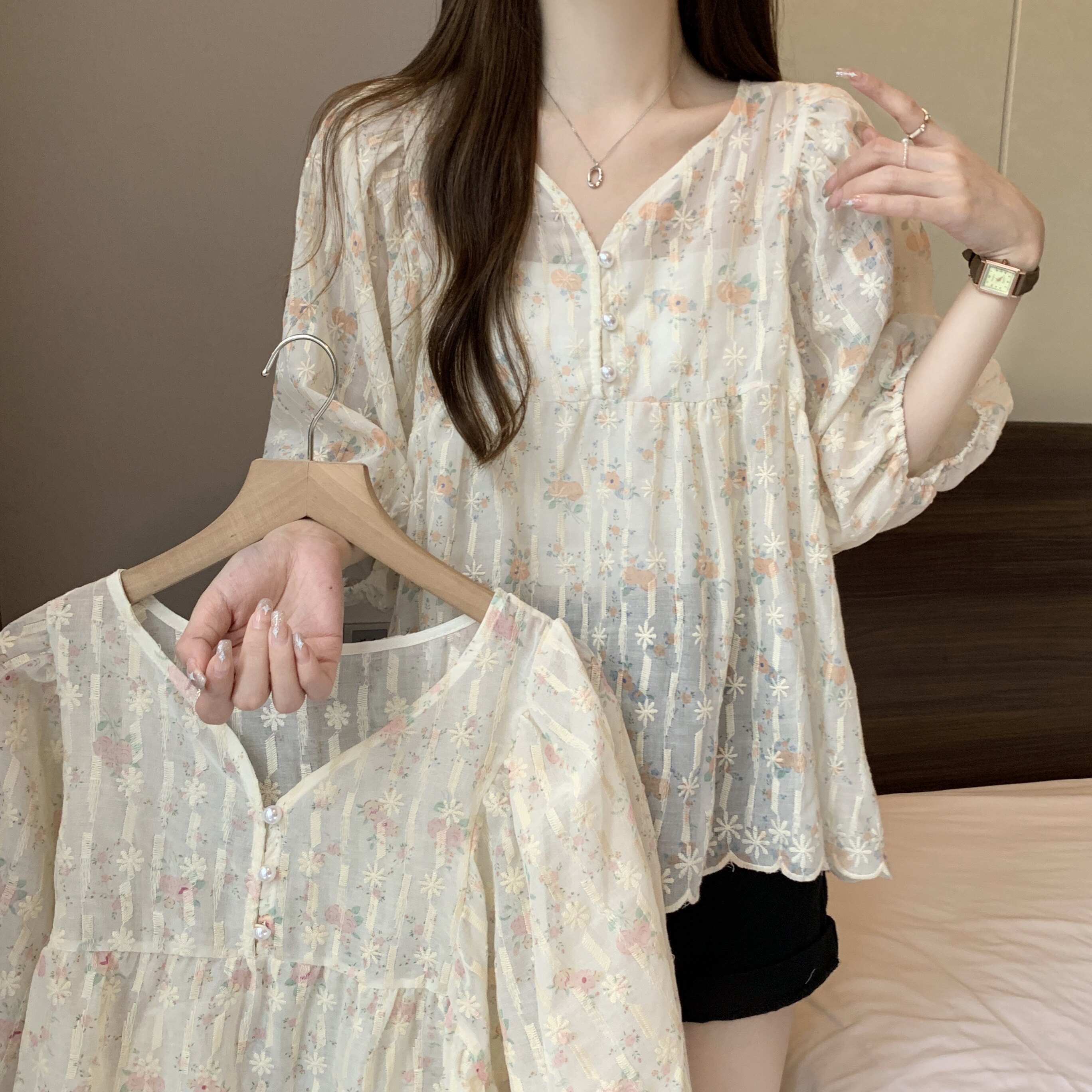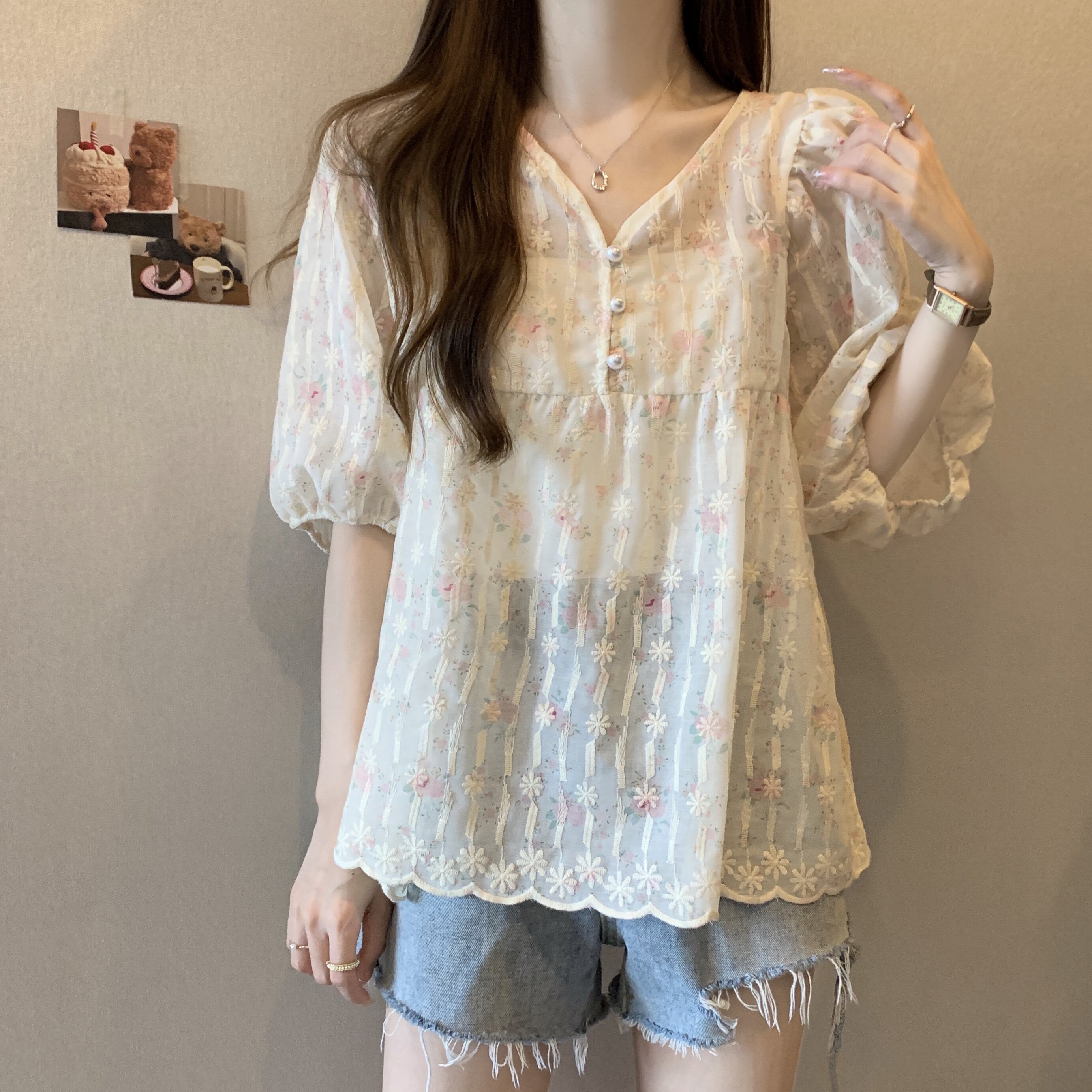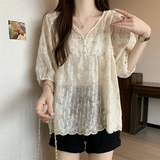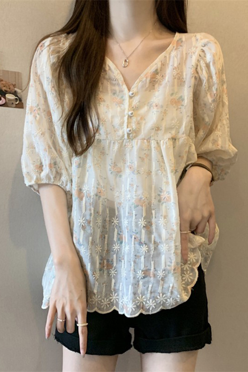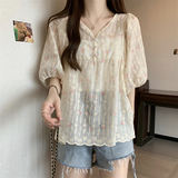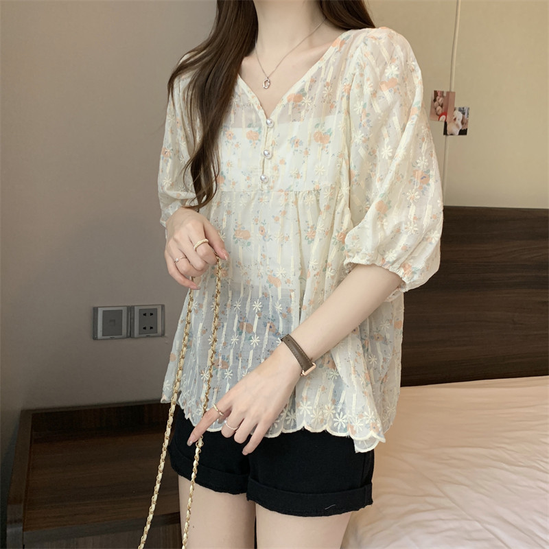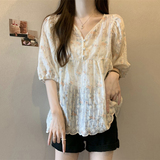 Летняя рубашка, милая футболка, большой размер, французский стиль, V-образный вырез, свободный крой, короткий рукав