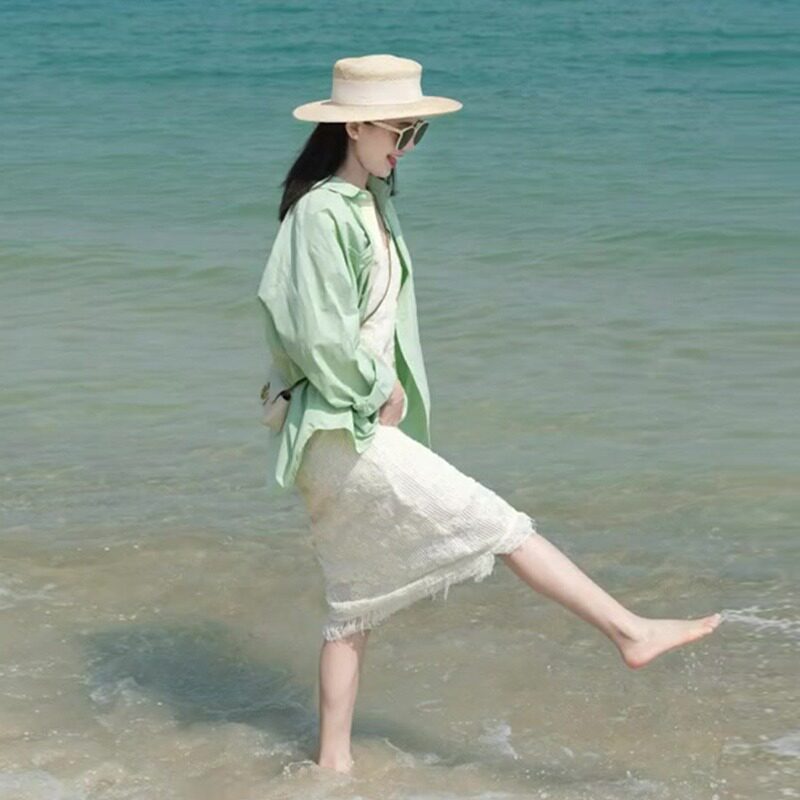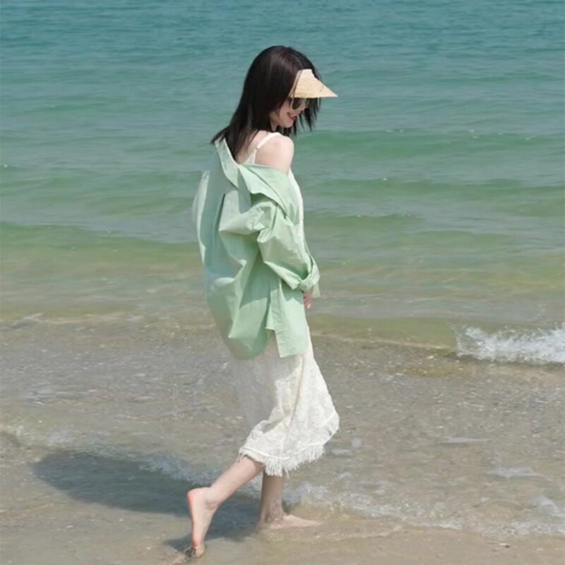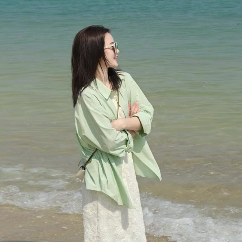 Зеленая дизайнерская рубашка, большой размер, тренд сезона, защита от солнца, подходит для подростков