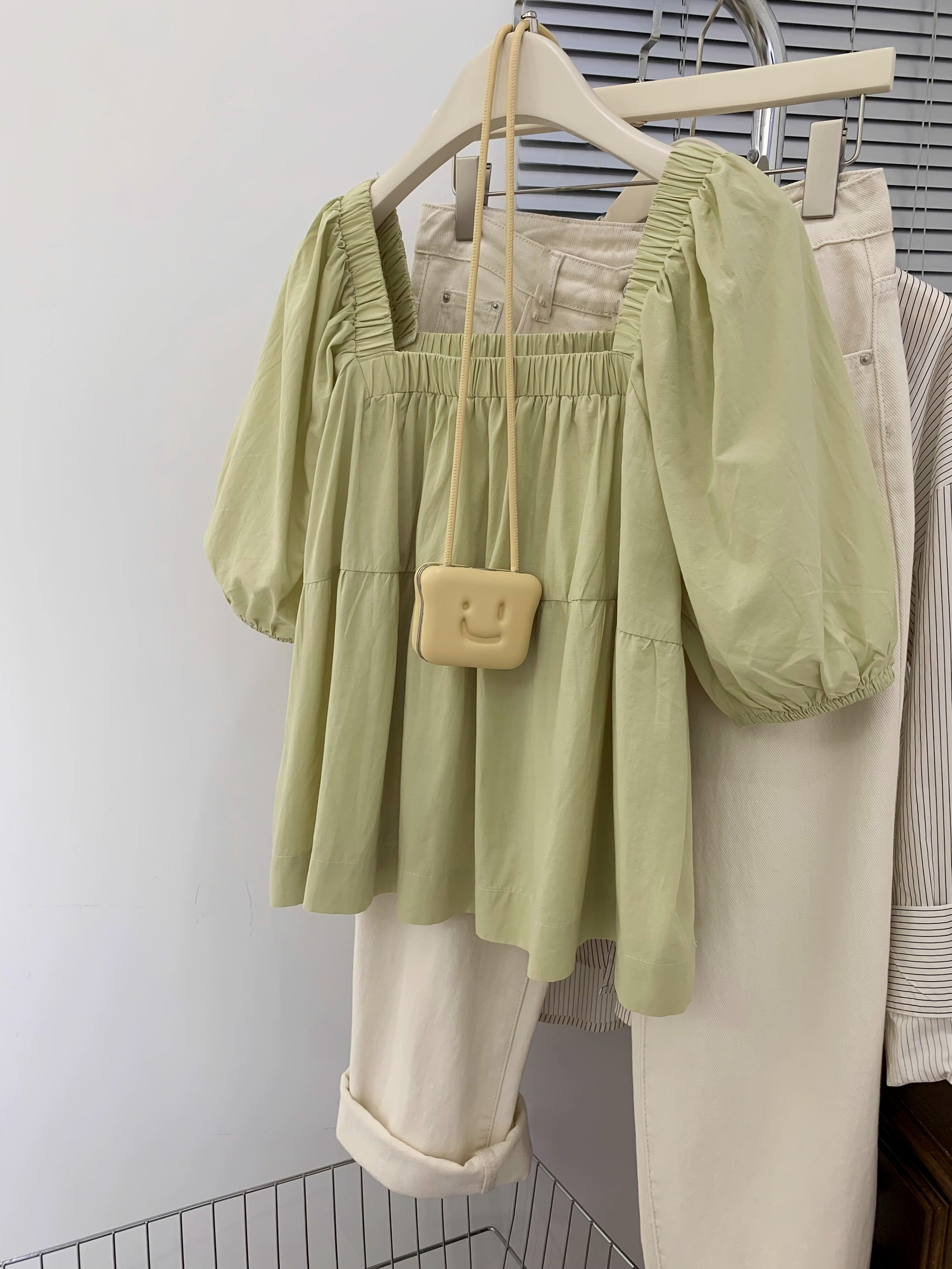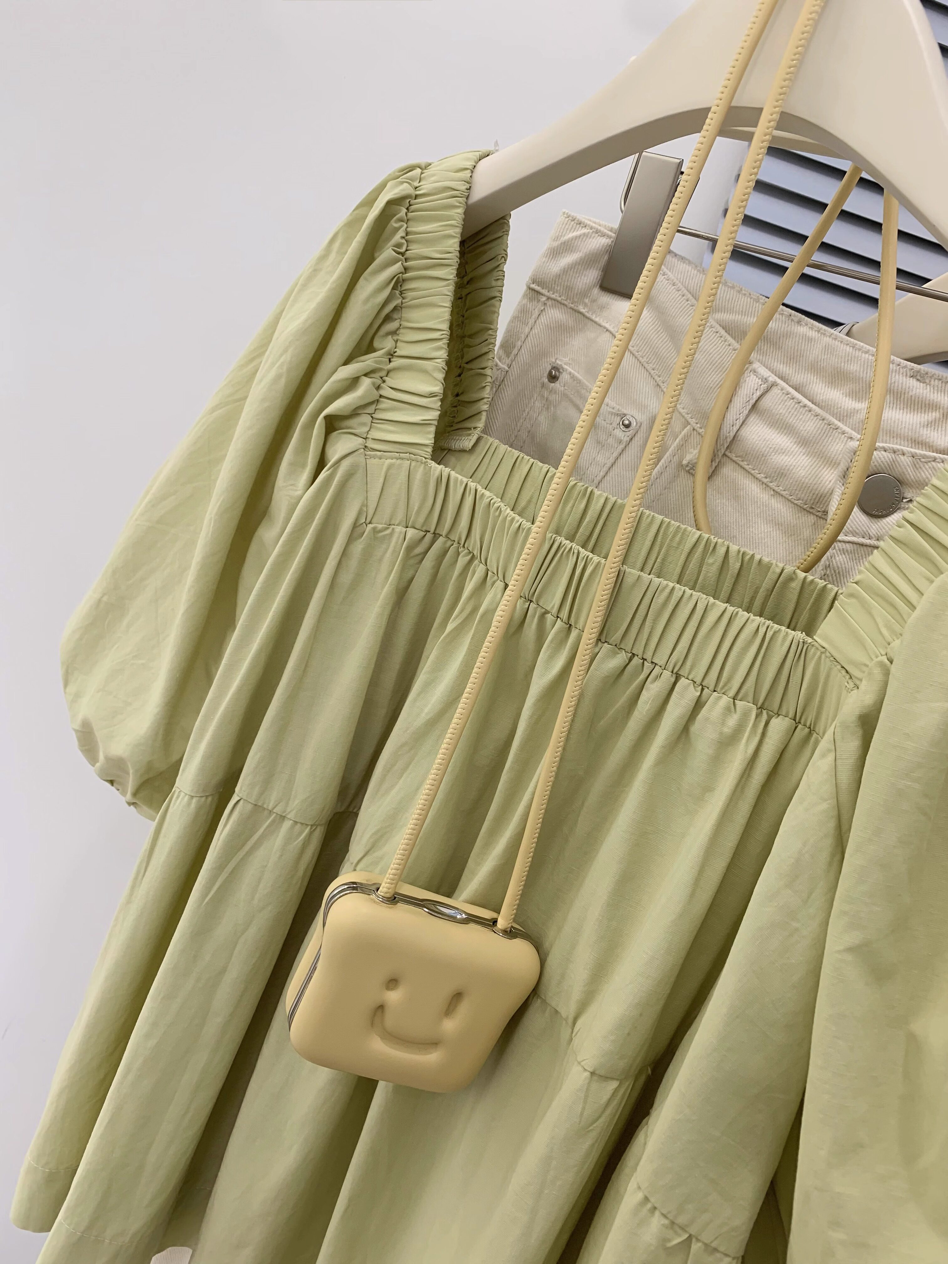 Зеленая летняя дизайнерская милая небольшая кукла, квадратный вырез, рукава фонарики, тренд сезона, французский стиль