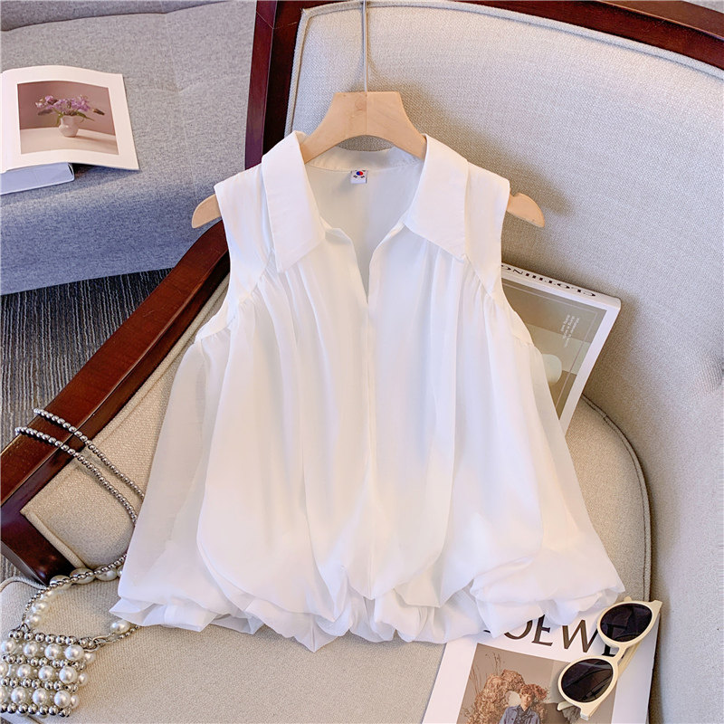 Белая рубашка без рукавов, шифоновая футболка, оверсайз, изысканный стиль, яркий броский стиль, короткий рукав