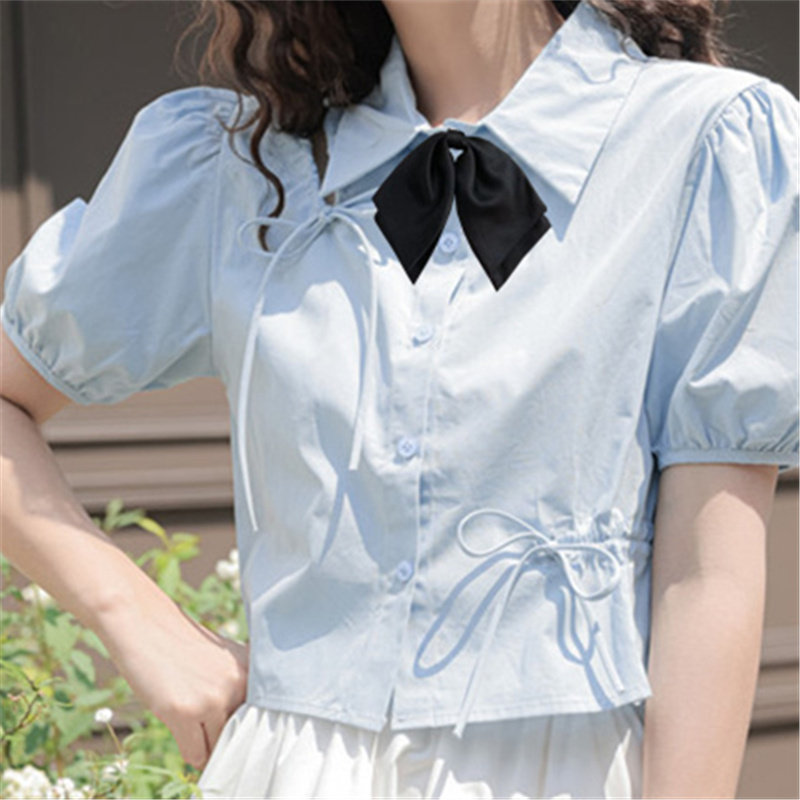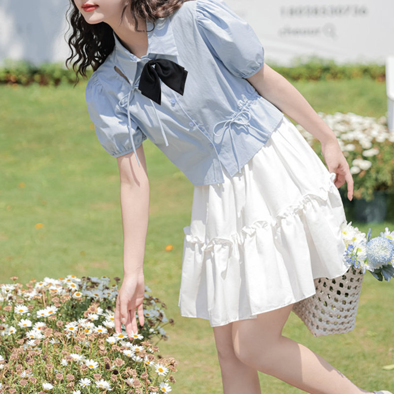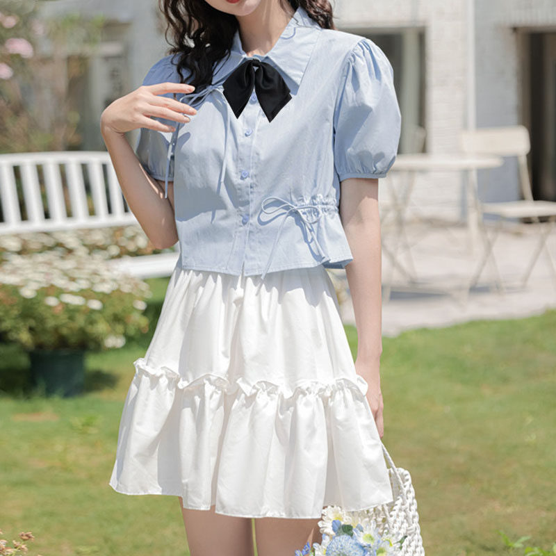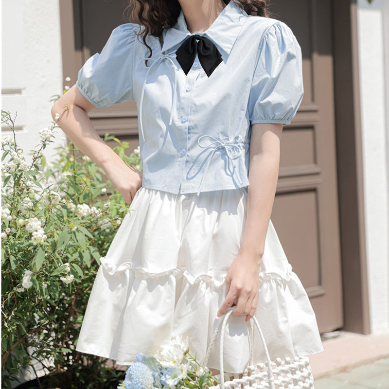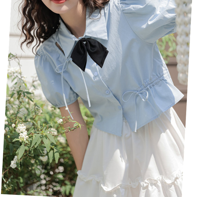 Рубашка, короткий синий корсет, комплект, французский стиль, короткий рукав